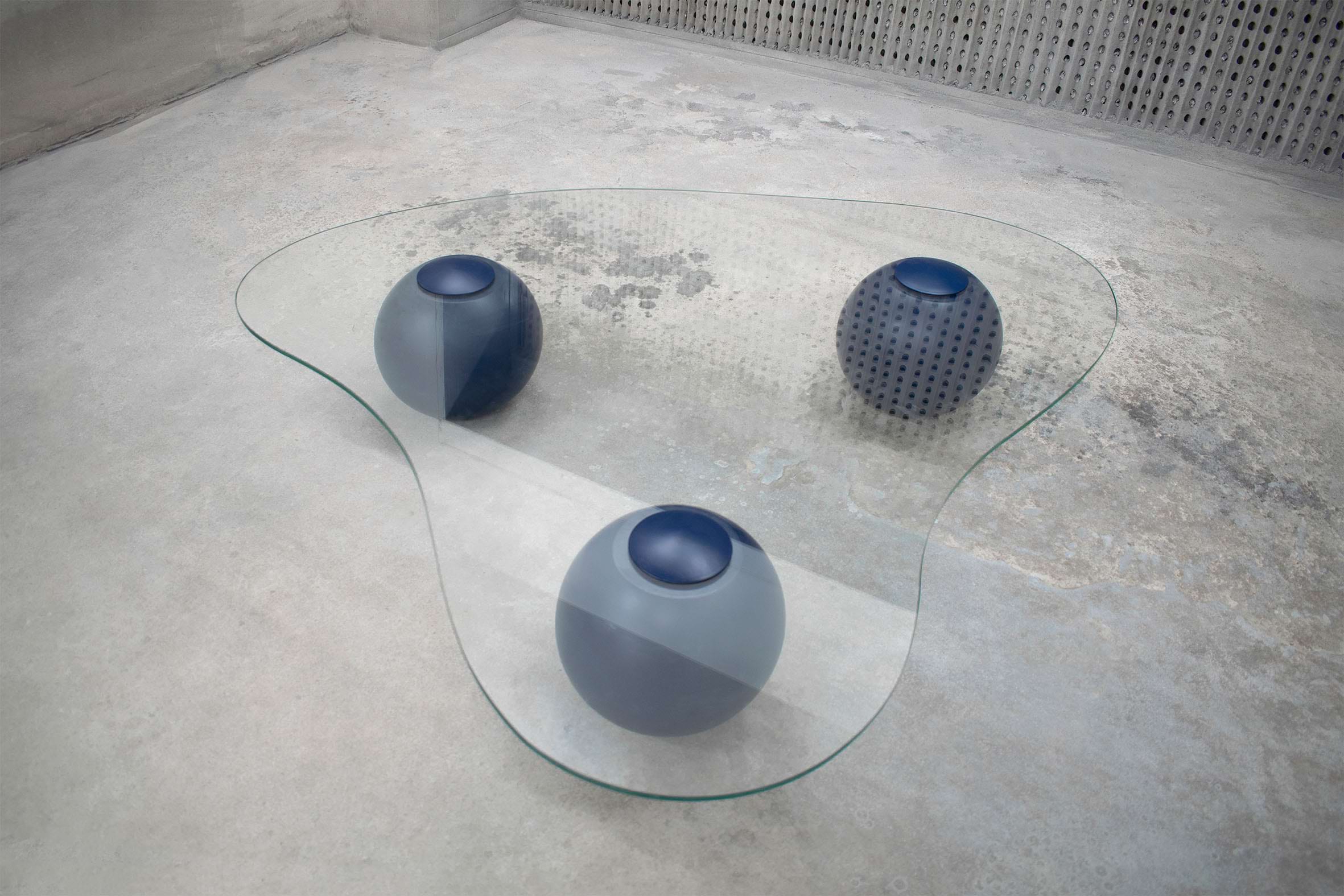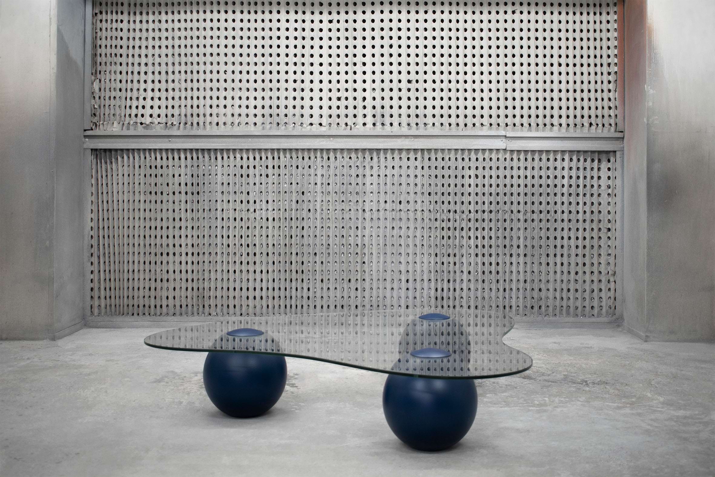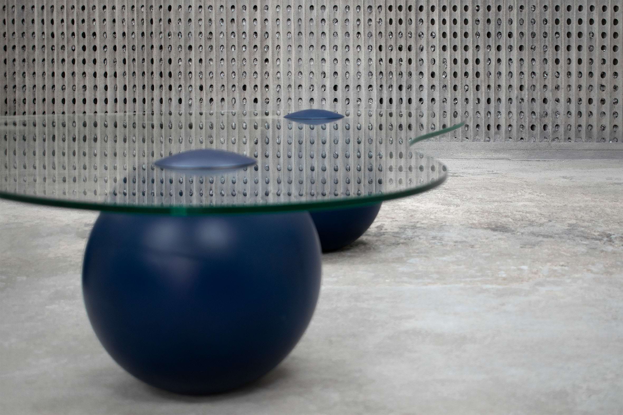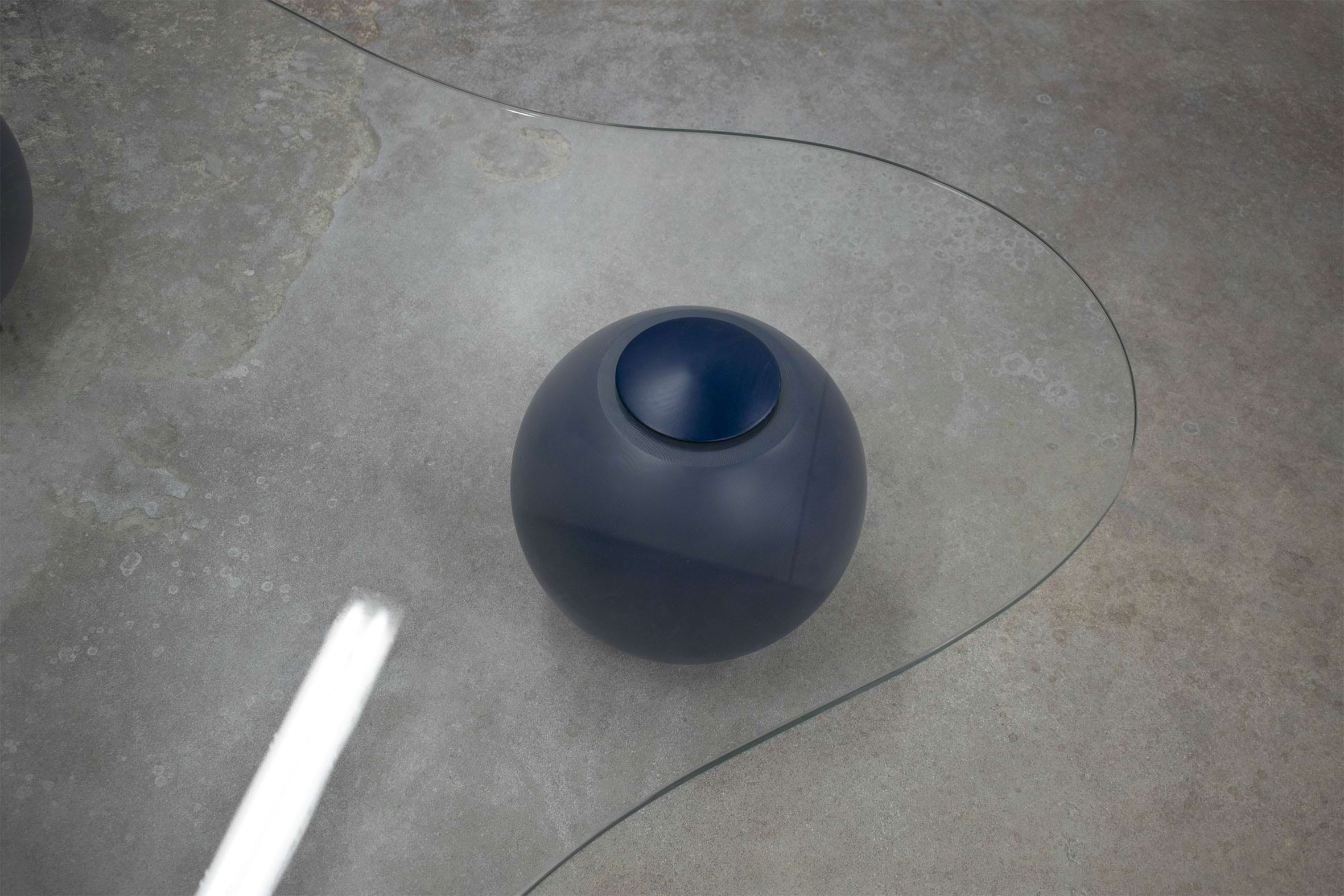 Captured on the moment of transition, this low glass table takes the form of a smooth cloud. Fluid yet meticulously defined in its shape, the CLOUD is solidified on the moment of rest. Unlike its oceanic predecessors, this design piece recesses in paradox from the datum of its resting spherical podiums, giving the impression of it levitating into thin air. It’s translucent glass surface is conceived as transient, giving space for the bold spheres to stage a consortium with its matching sofa.