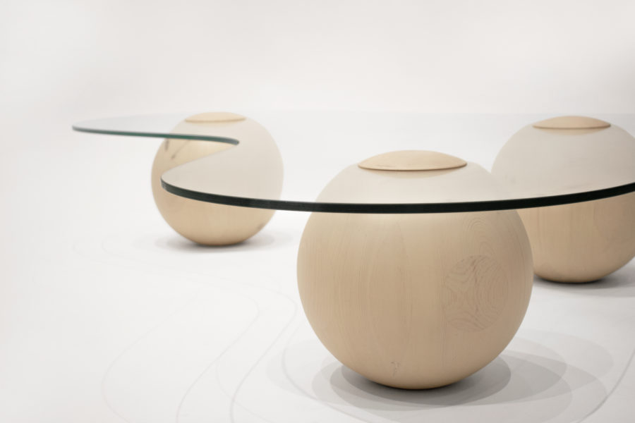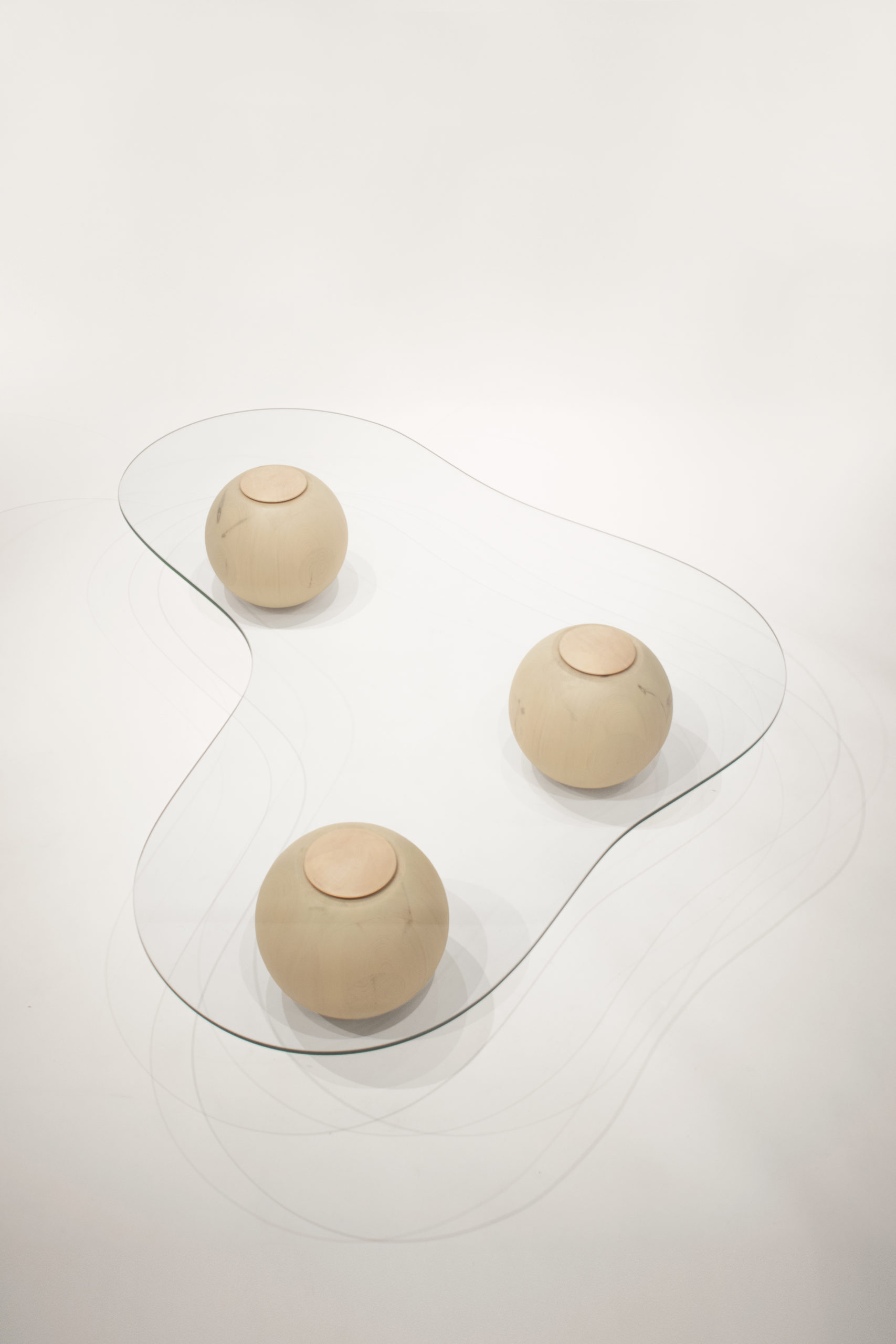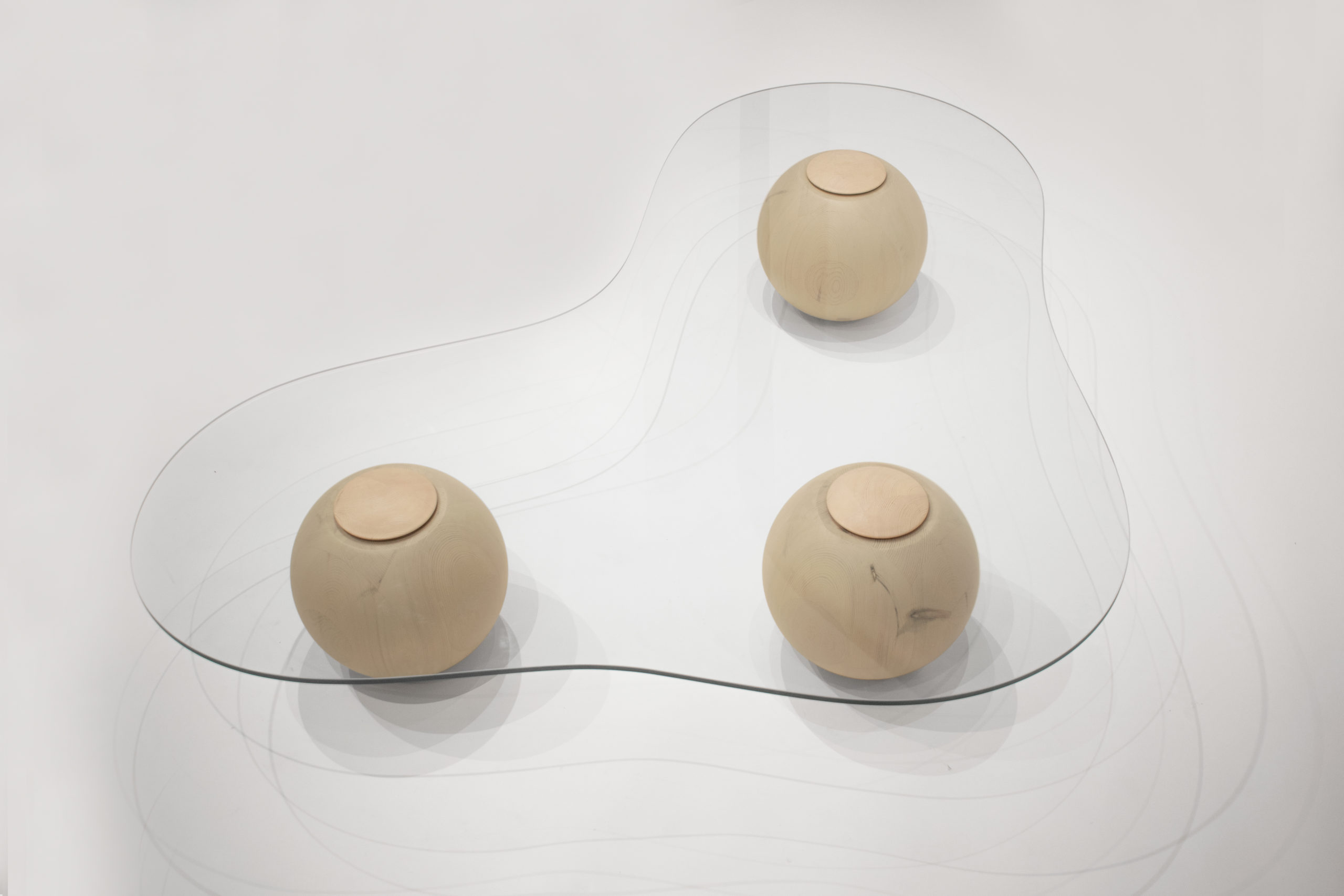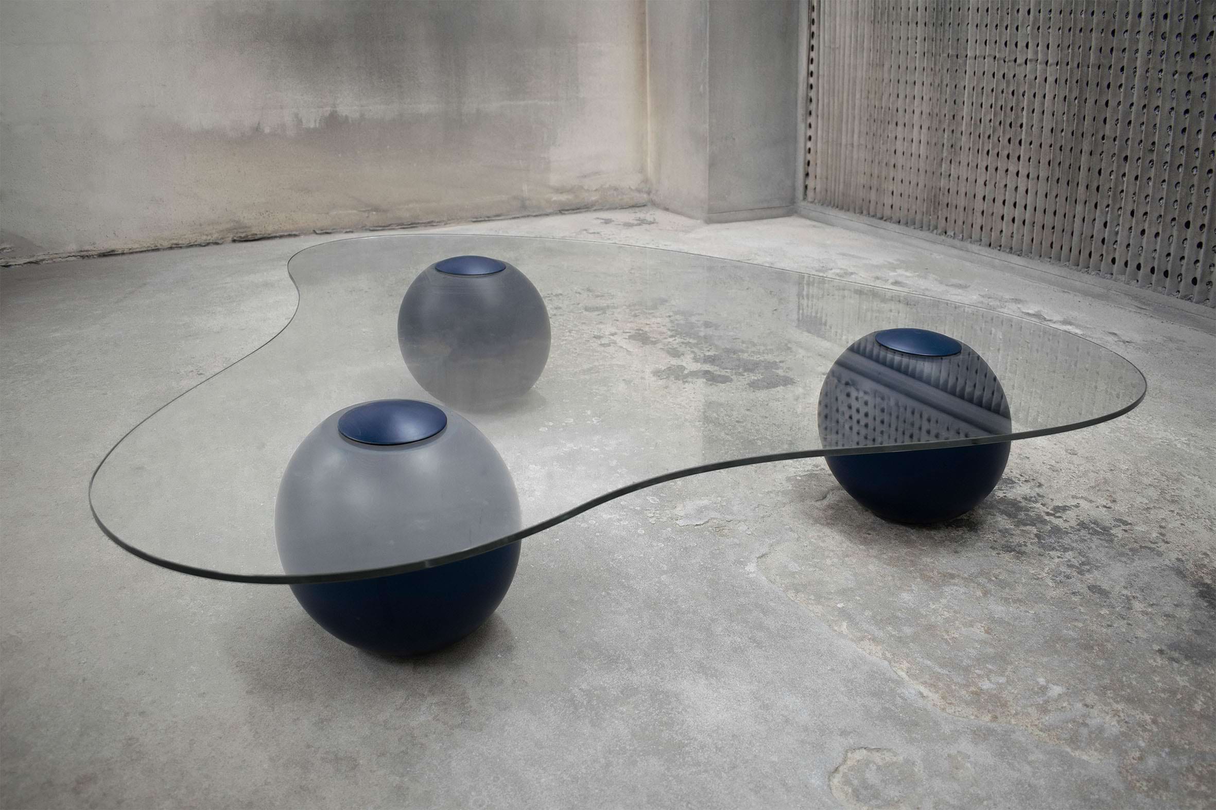 Captured on the moment of transition, this low glass table takes the form of a smooth cloud. Fluid yet meticulously defined in its shape, the CLOUD is solidified on the moment of rest. Unlike its oceanic predecessors, this design piece recesses in paradox from the datum of its resting spherical podiums, giving the impression of it levitating into thin air. It’s translucent glass surface is conceived as transient, giving space for the bold spheres to stage a consortium with its matching sofa.