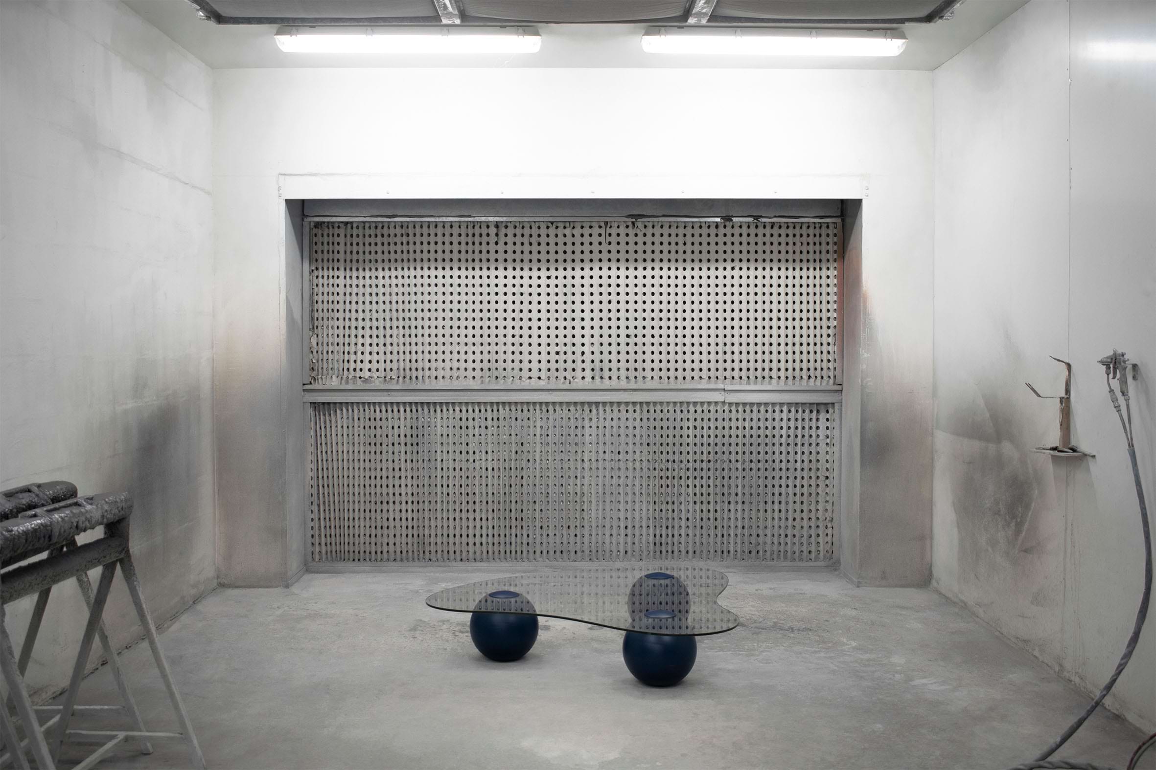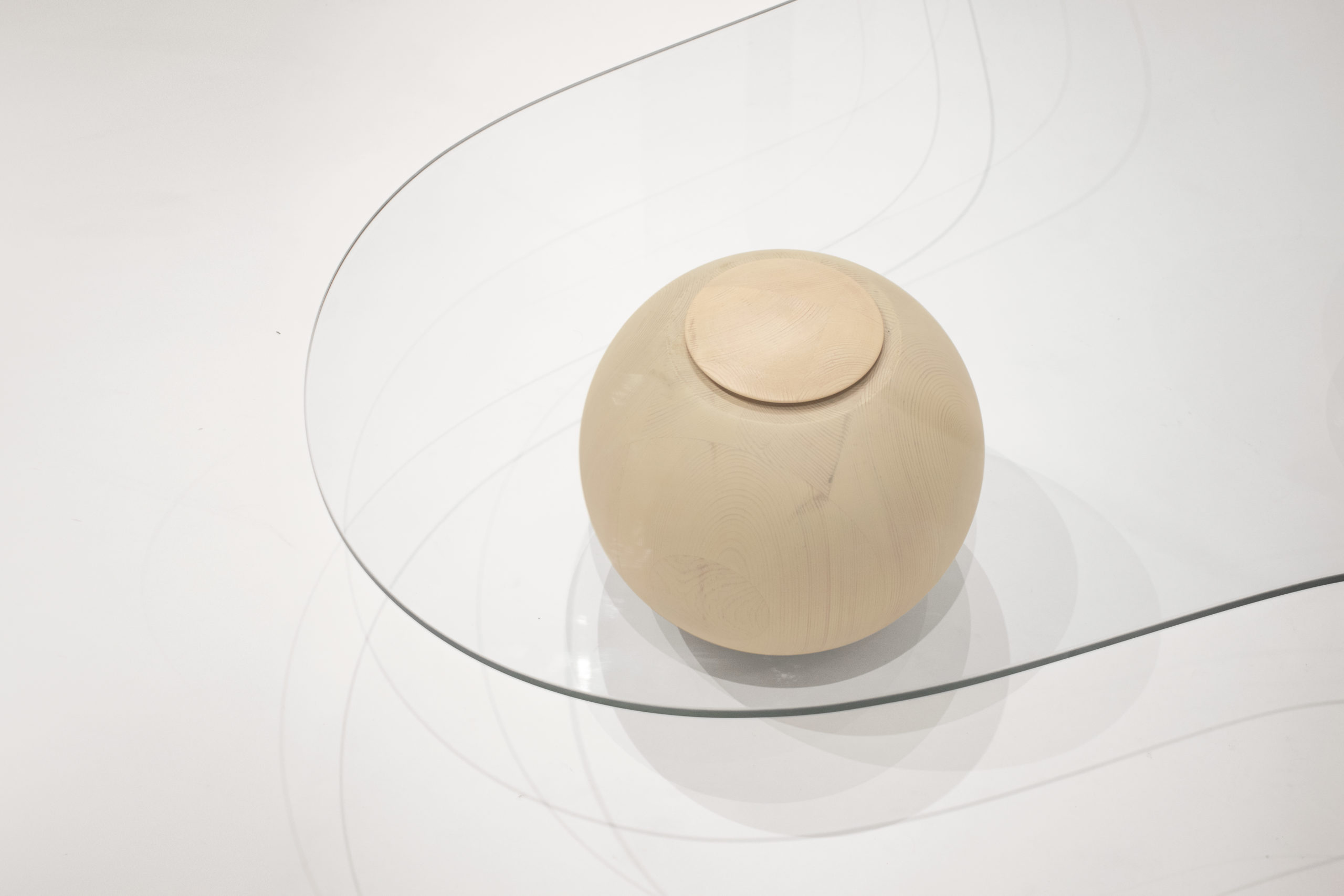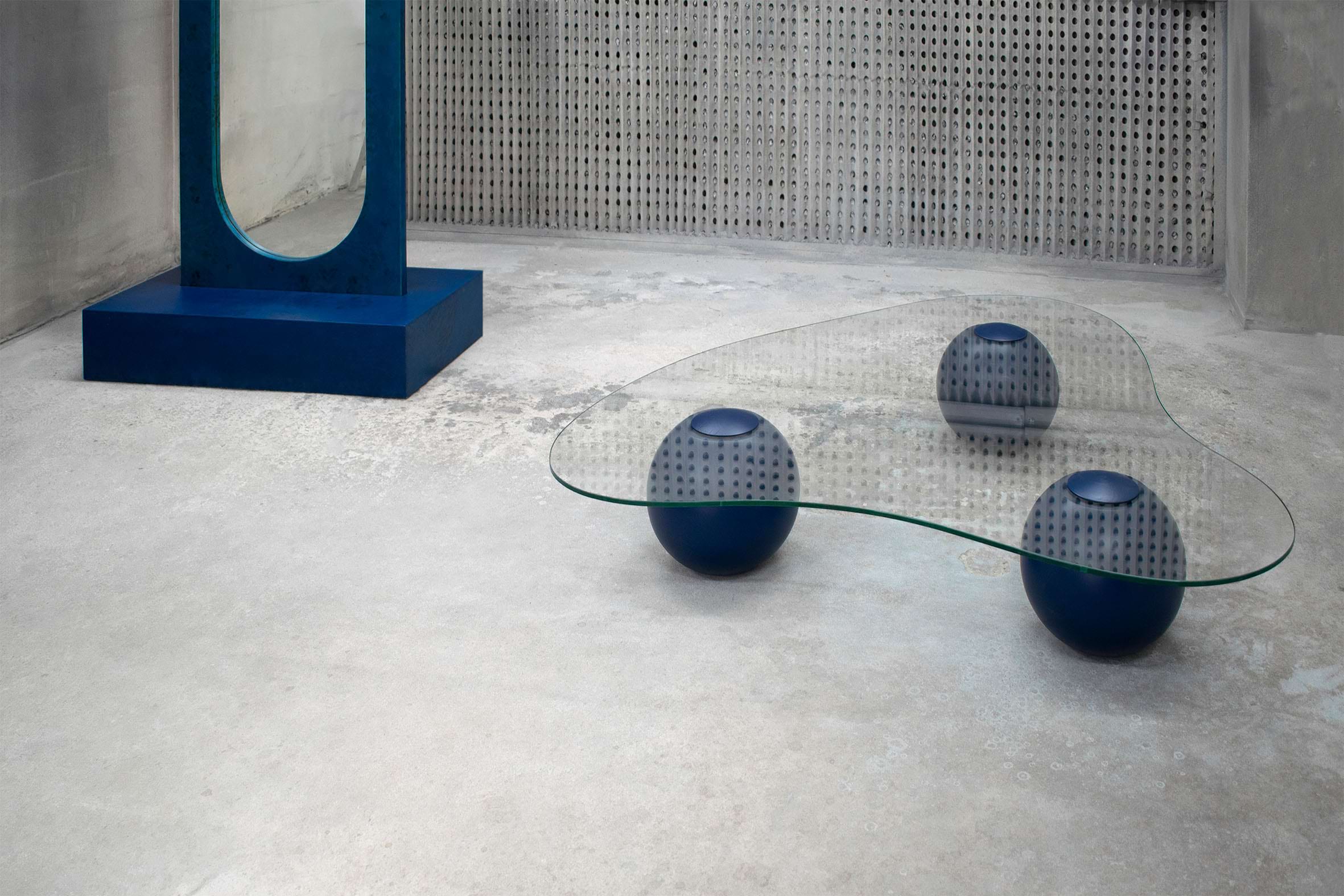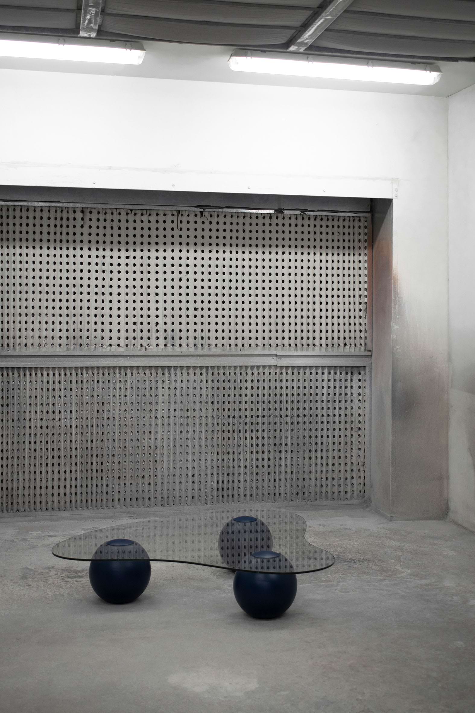 Captured on the moment of transition, this low glass table takes the form of a smooth cloud. Fluid yet meticulously defined in its shape, the CLOUD is solidified on the moment of rest. Unlike its oceanic predecessors, this design piece recesses in paradox from the datum of its resting spherical podiums, giving the impression of it levitating into thin air. It’s translucent glass surface is conceived as transient, giving space for the bold spheres to stage a consortium with its matching sofa.