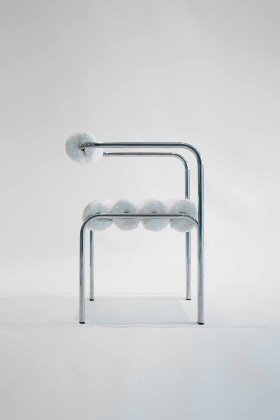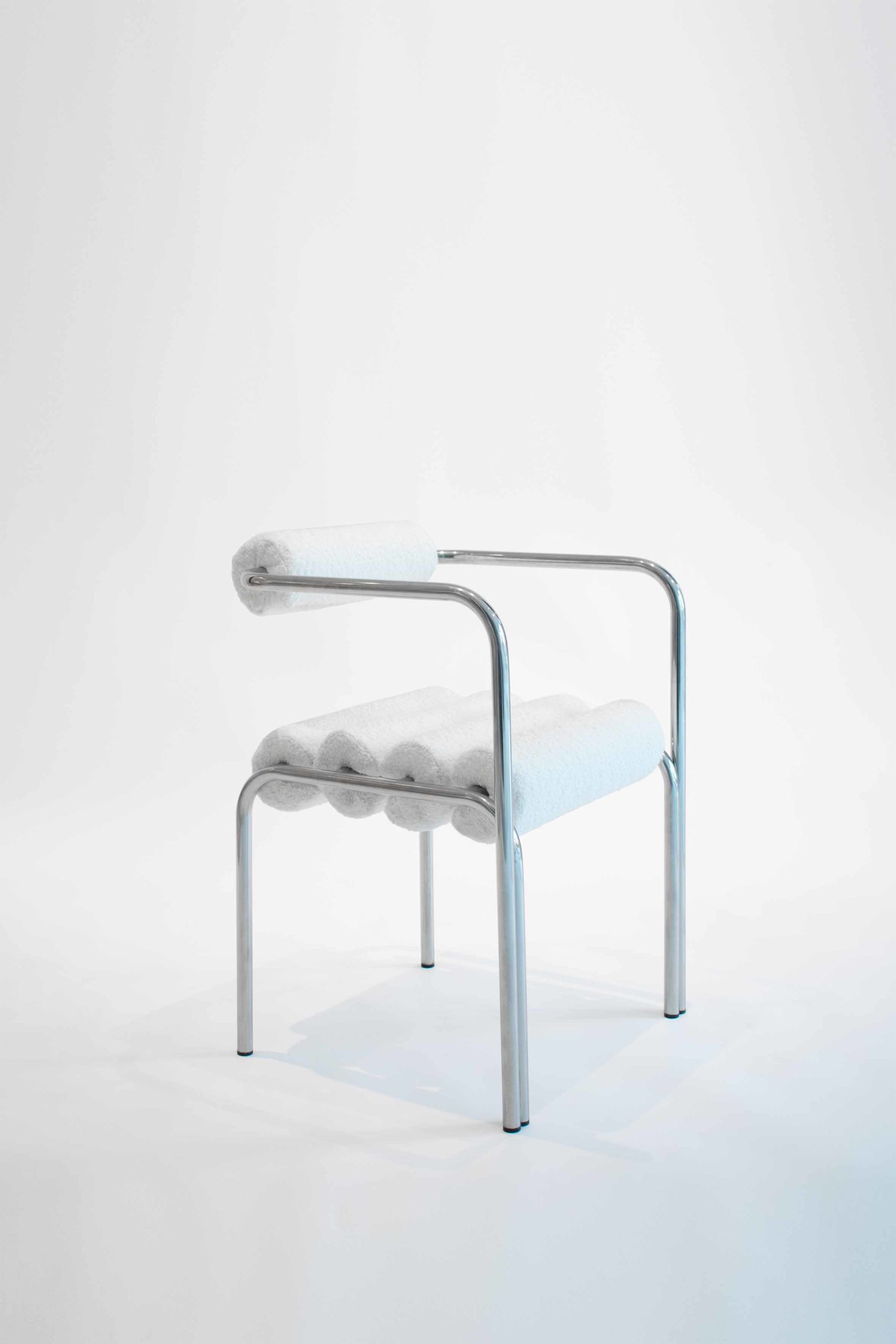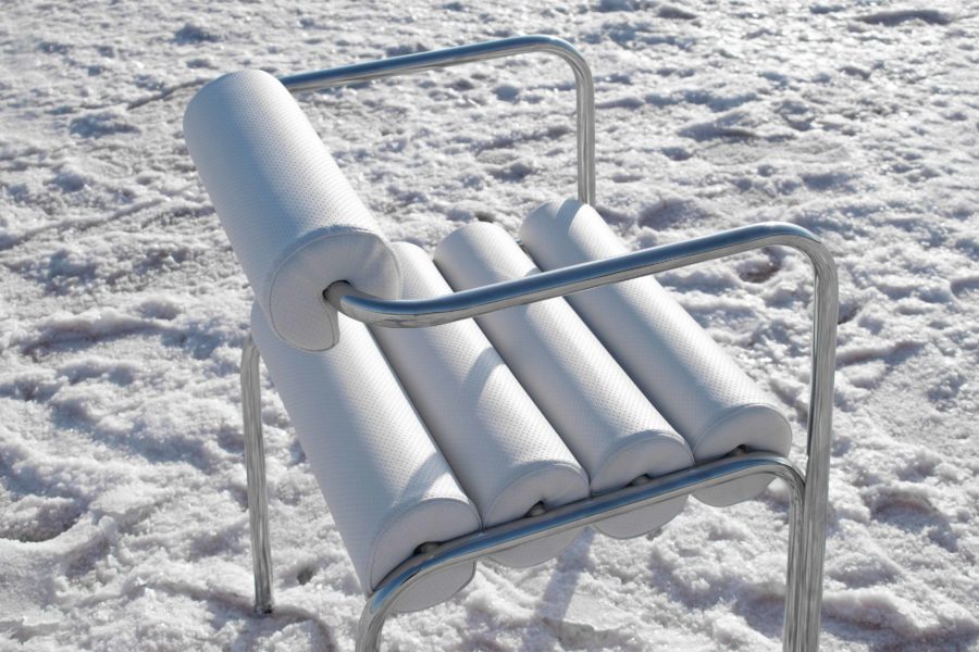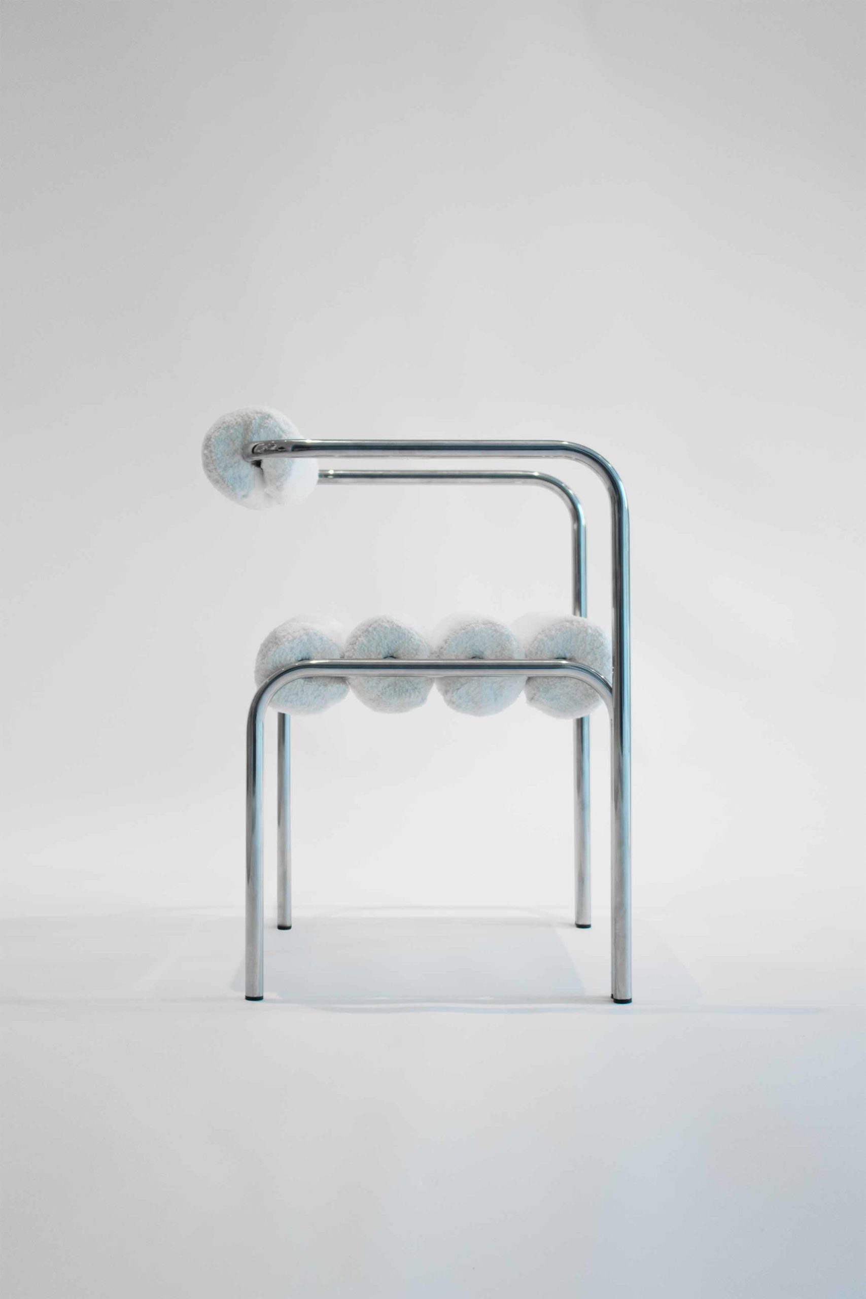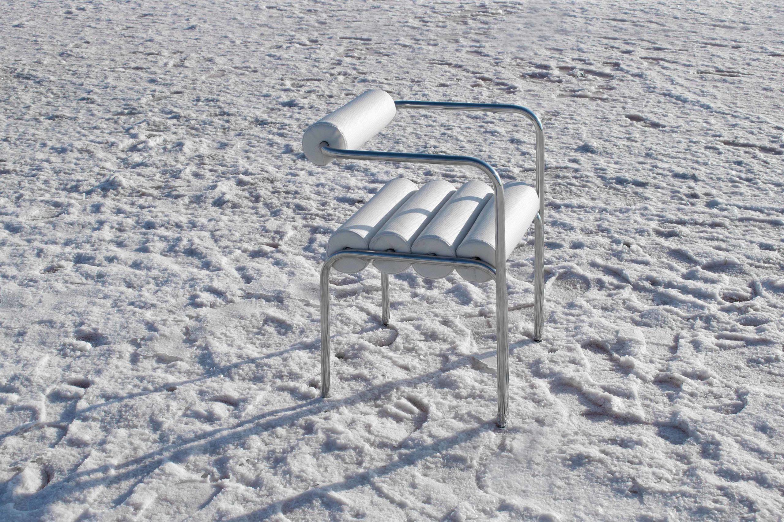 Austere in appearance yet cordial to the human body, this chair design follows the metallic path of its tubular structure, while maintaining ergonomic comfort. Its soft cushion tubes, upholstered in marine leather, hug an array within the stiff steel frame where the body comes in contact. When seen in assemblage around central pieces, the chairs’ eminent pluffy volumes recreate a collection of floating clouds, giving a light and air feel in the atmosphere.