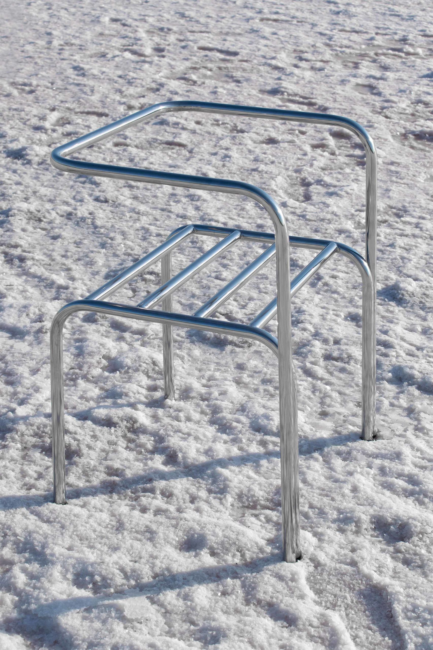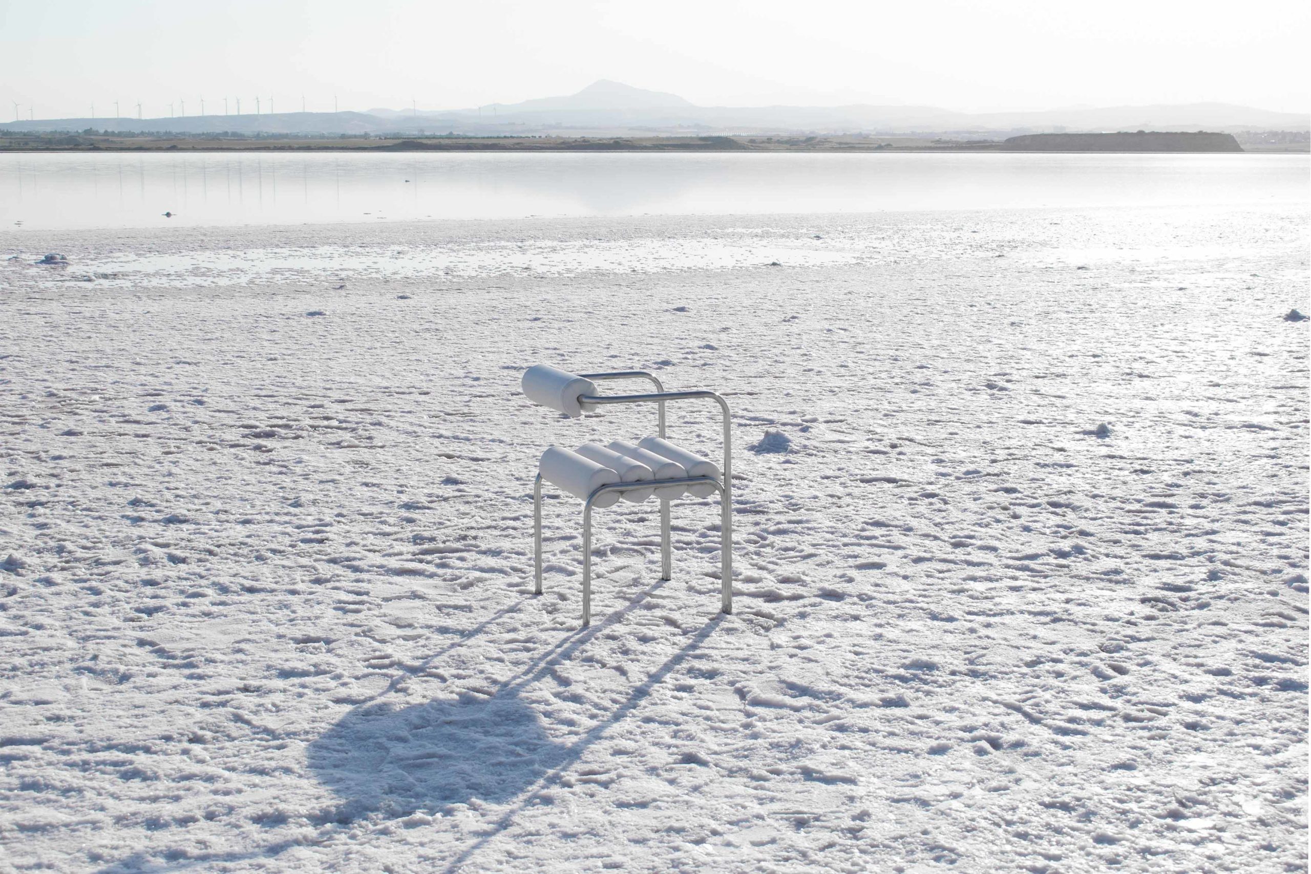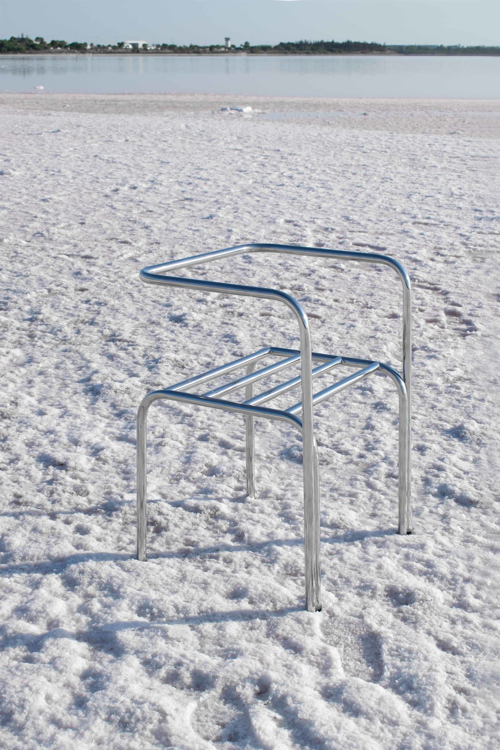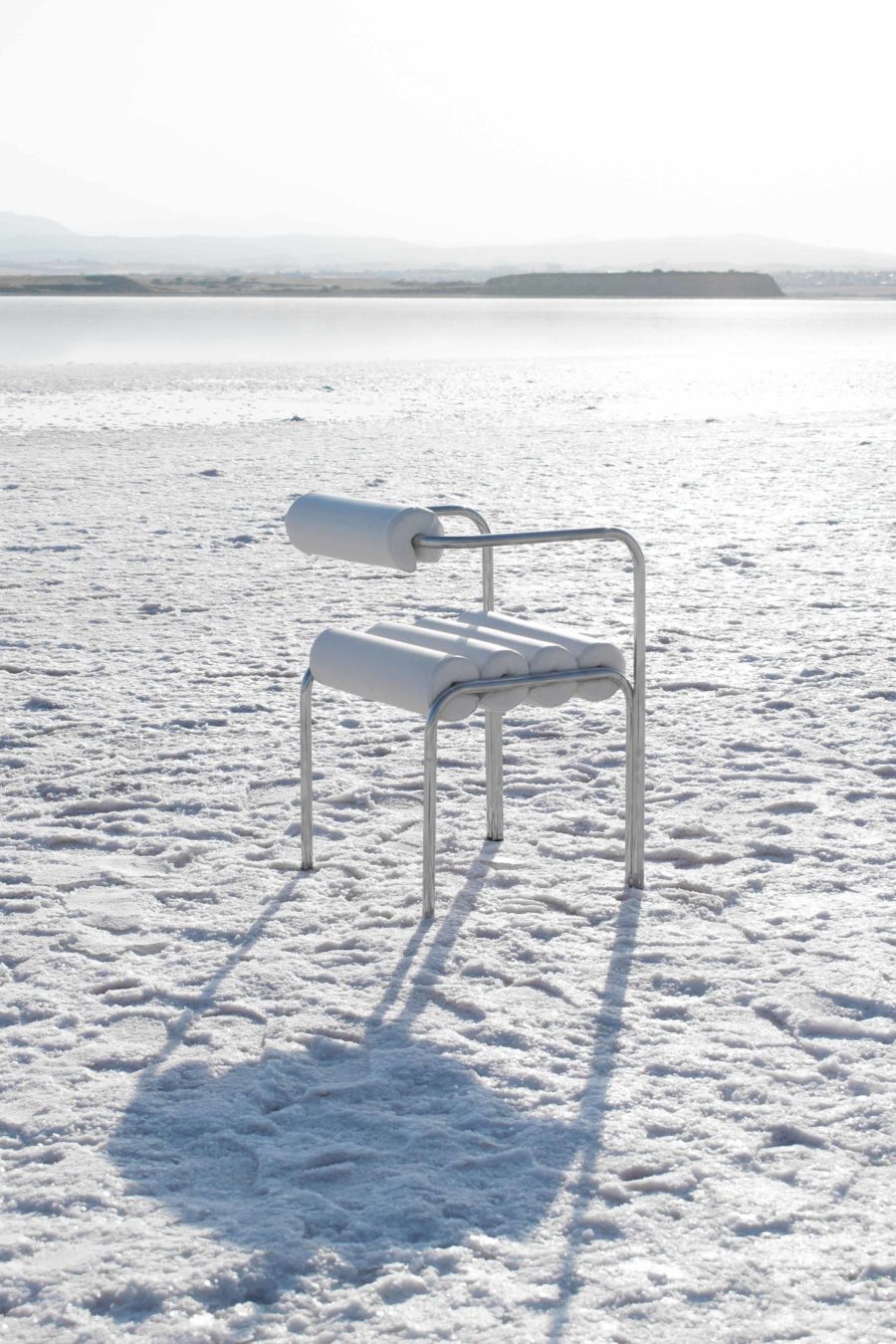 Austere in appearance yet cordial to the human body, this chair design follows the metallic path of its tubular structure, while maintaining ergonomic comfort. Its soft cushion tubes, upholstered in marine leather, hug an array within the stiff steel frame where the body comes in contact. When seen in assemblage around central pieces, the chairs’ eminent pluffy volumes recreate a collection of floating clouds, giving a light and air feel in the atmosphere.