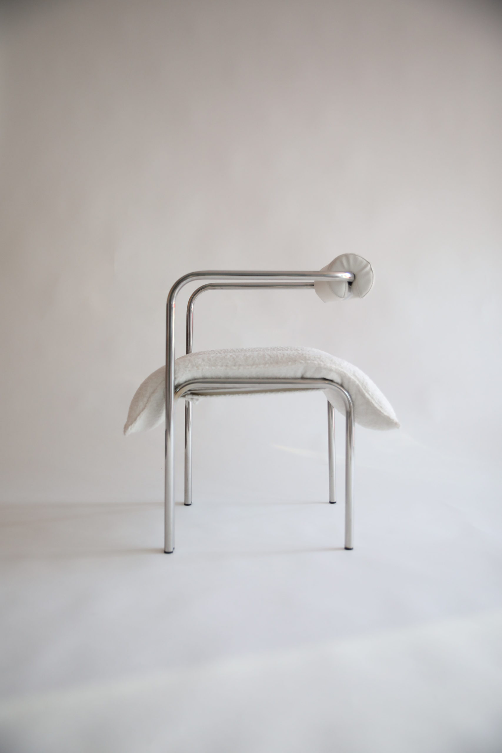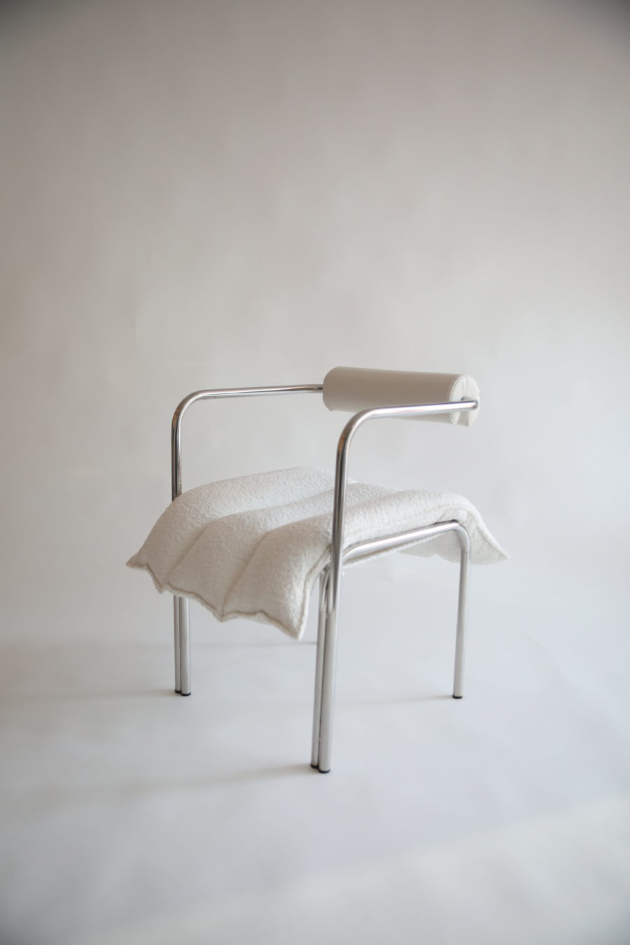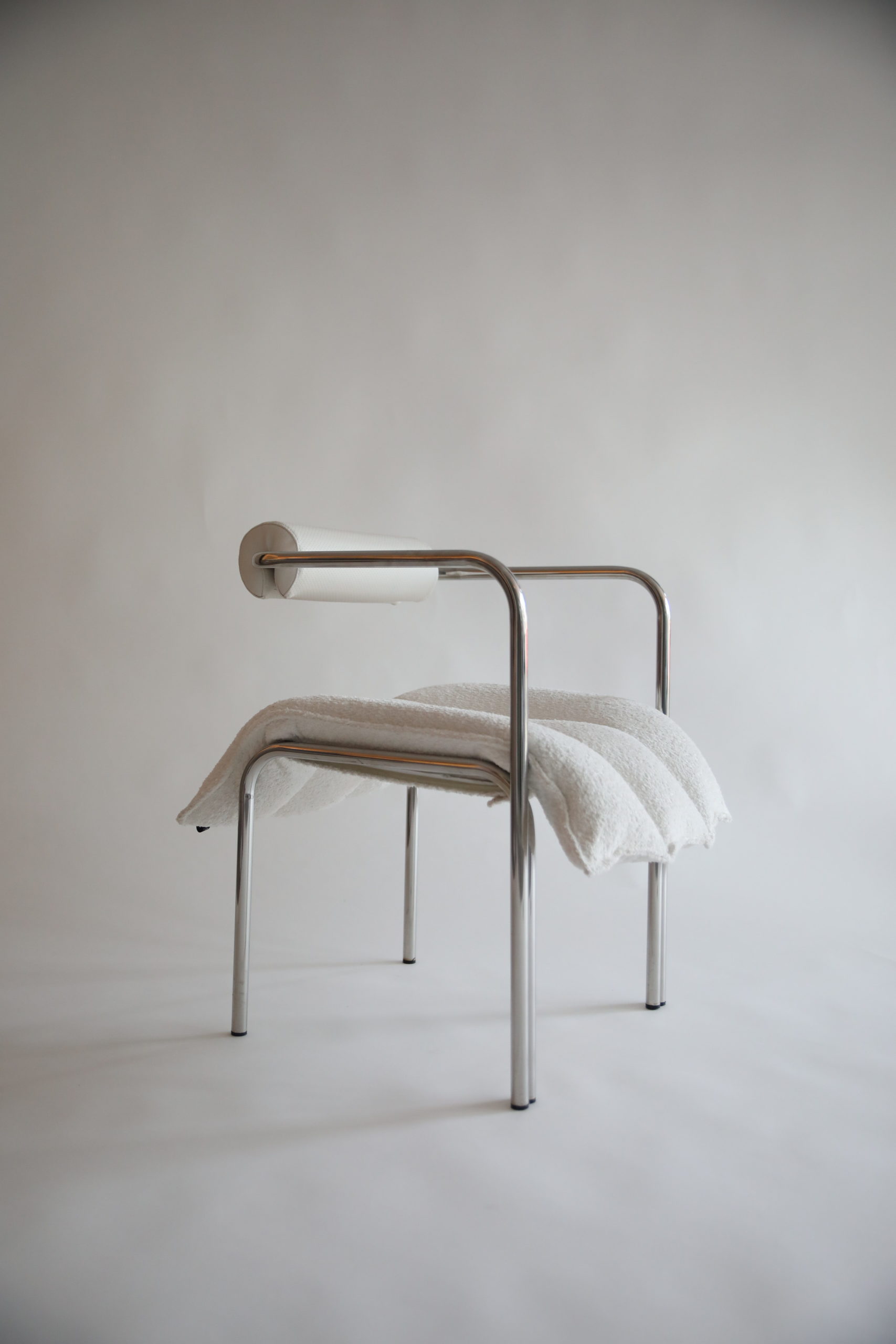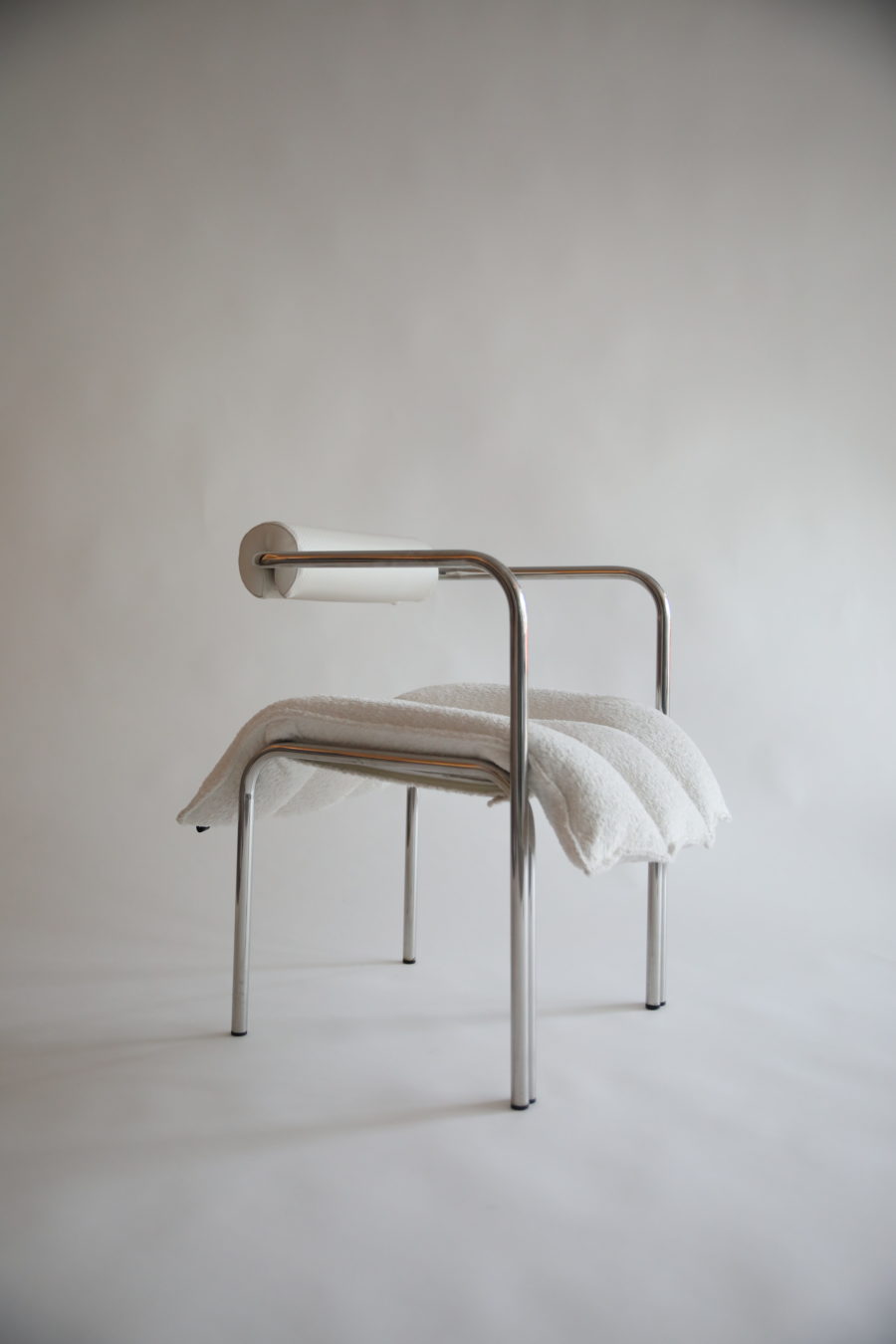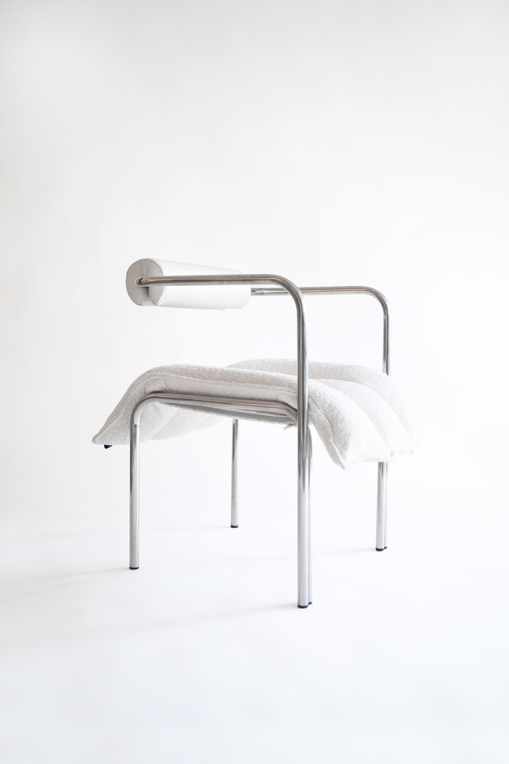 Continuing the design principles of the signature ELEGG, this armchair comes in a wider version with a suspended armrest. Its soft cushion tubes, upholstered in bouclé fabric, hug an array within the stiff steel frame where the body comes in contact. The newly introduced armrest is cushioned in matching fabric, covering completely the surfaces that come in contact with the body.