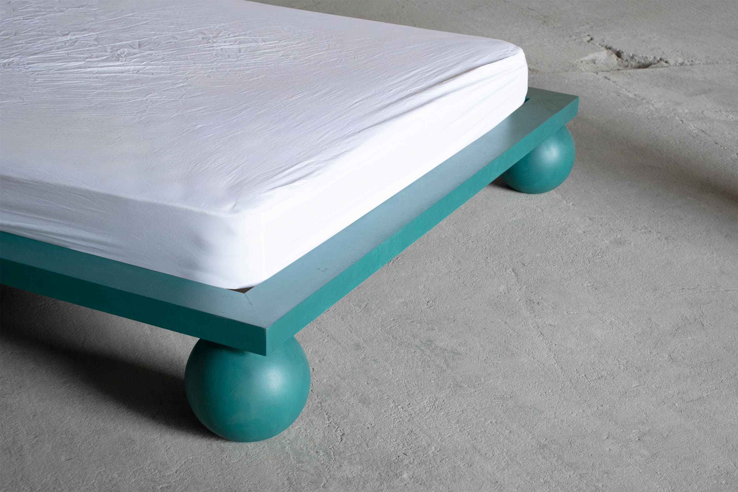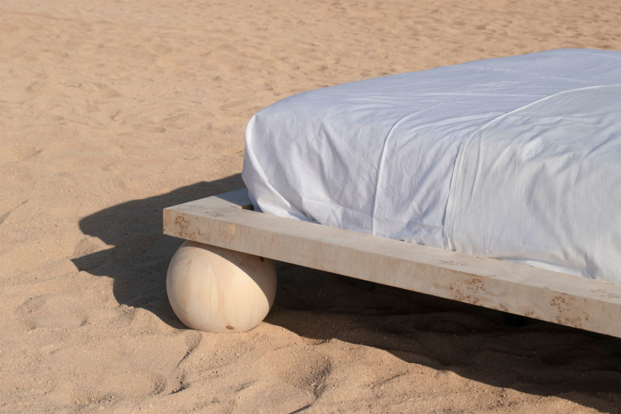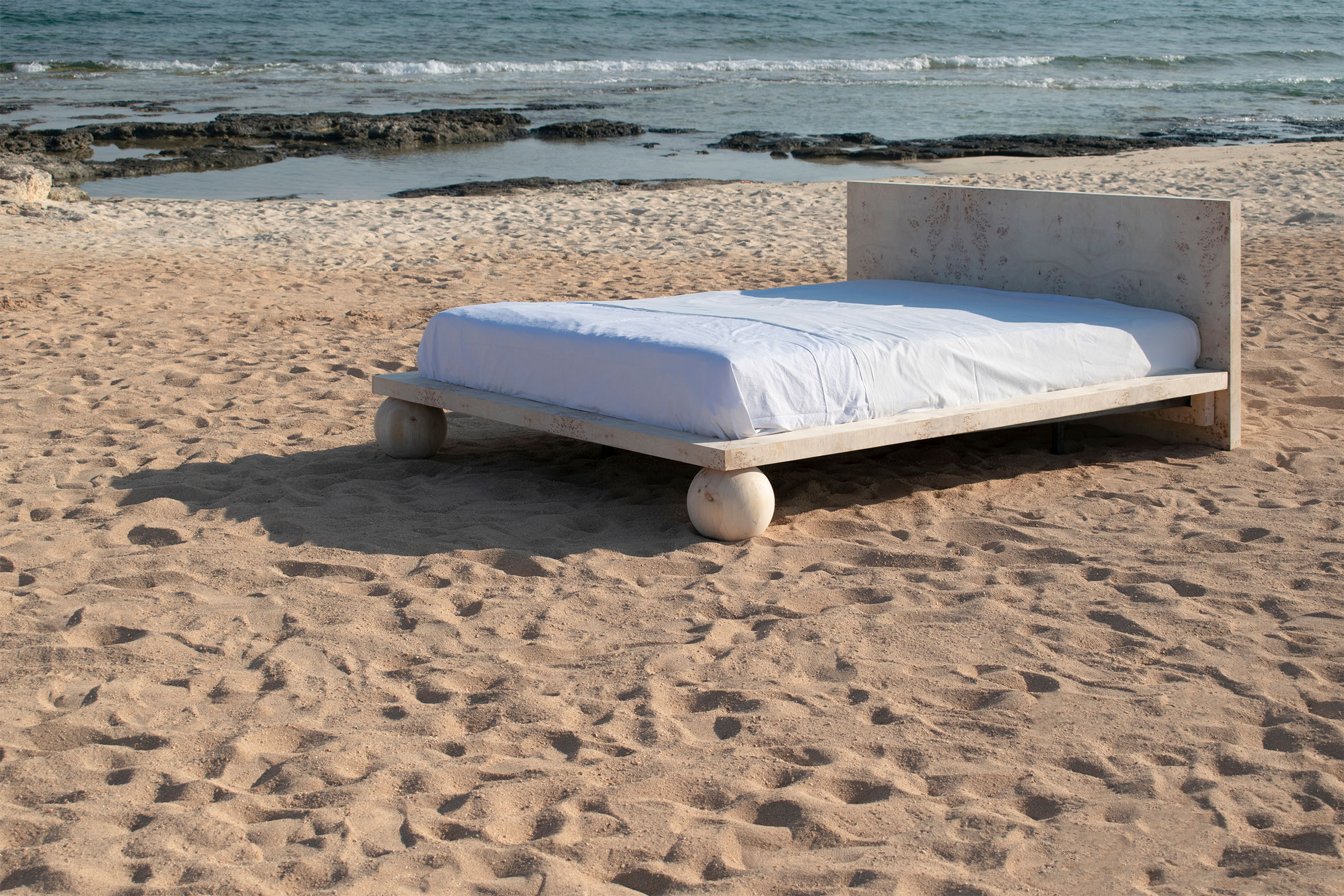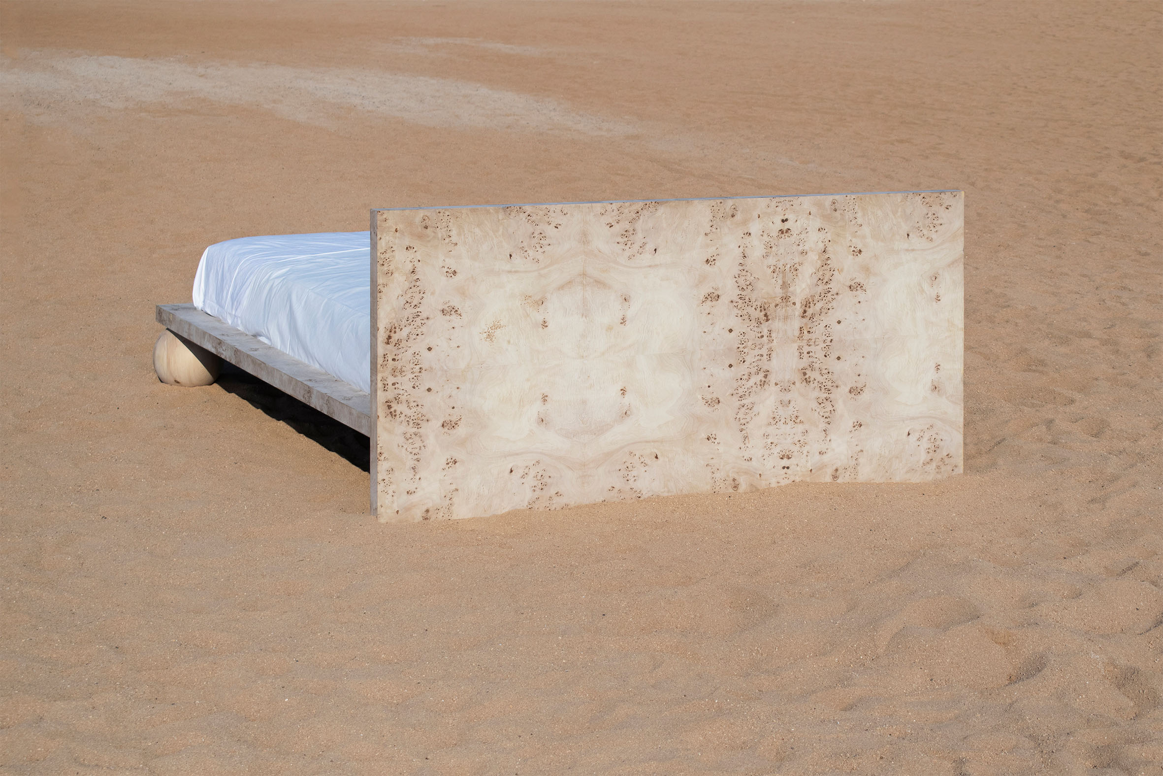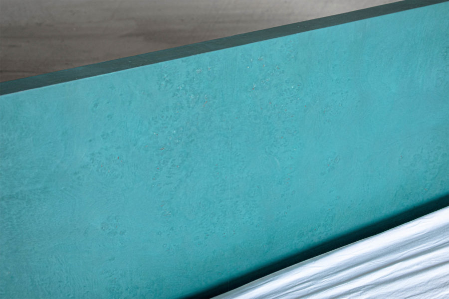 Dreaming is an essential concept in the process of designing this collection. Being no exception, the EPIFANIA bed becomes both the object and the result of conceptual dreaming. Resting on the intersection of two perpendicular planes, supported by two wooden spheres, the design results in a bold queen-size bed aimed to be the centerpiece of the space. Ideal for higher mattresses, the bed comes in all petrol green lacquered wood finish or natural burl veneer in beige tones.