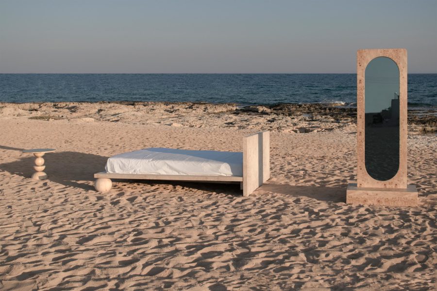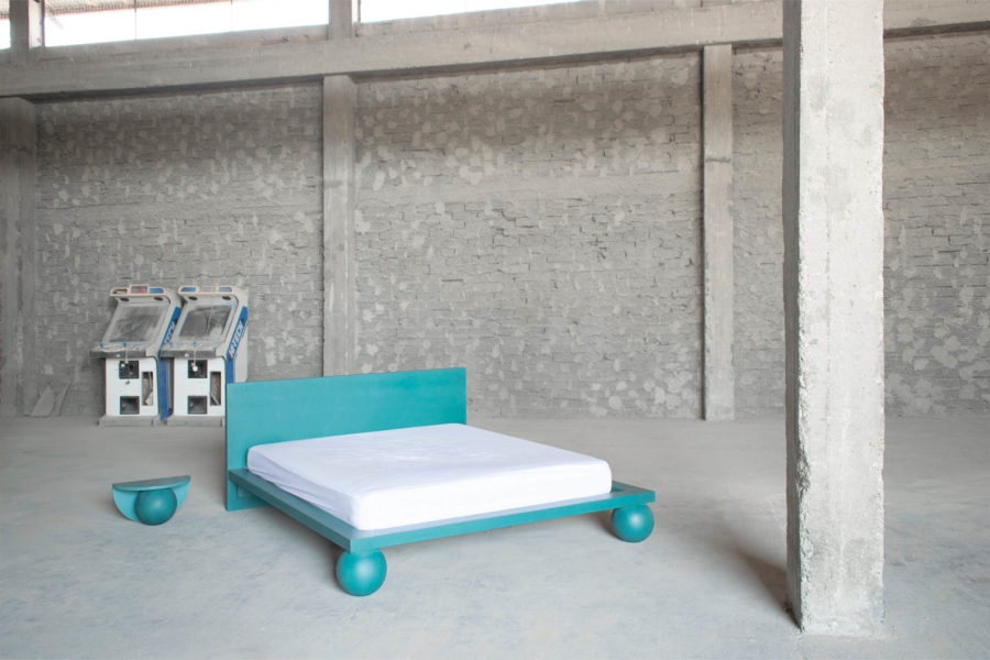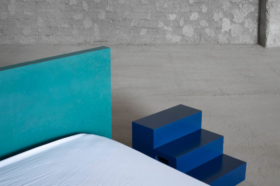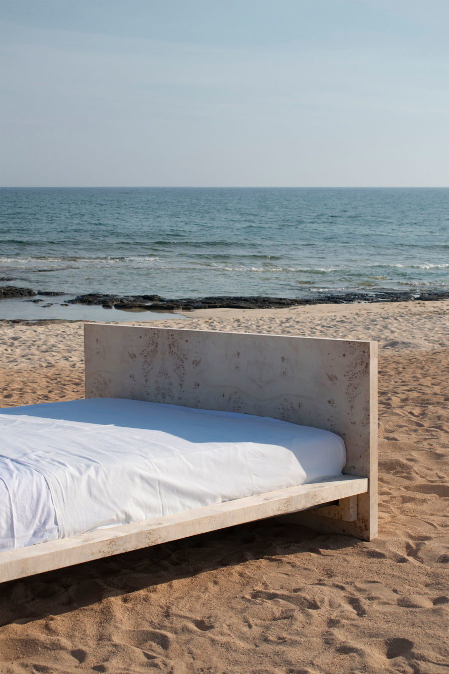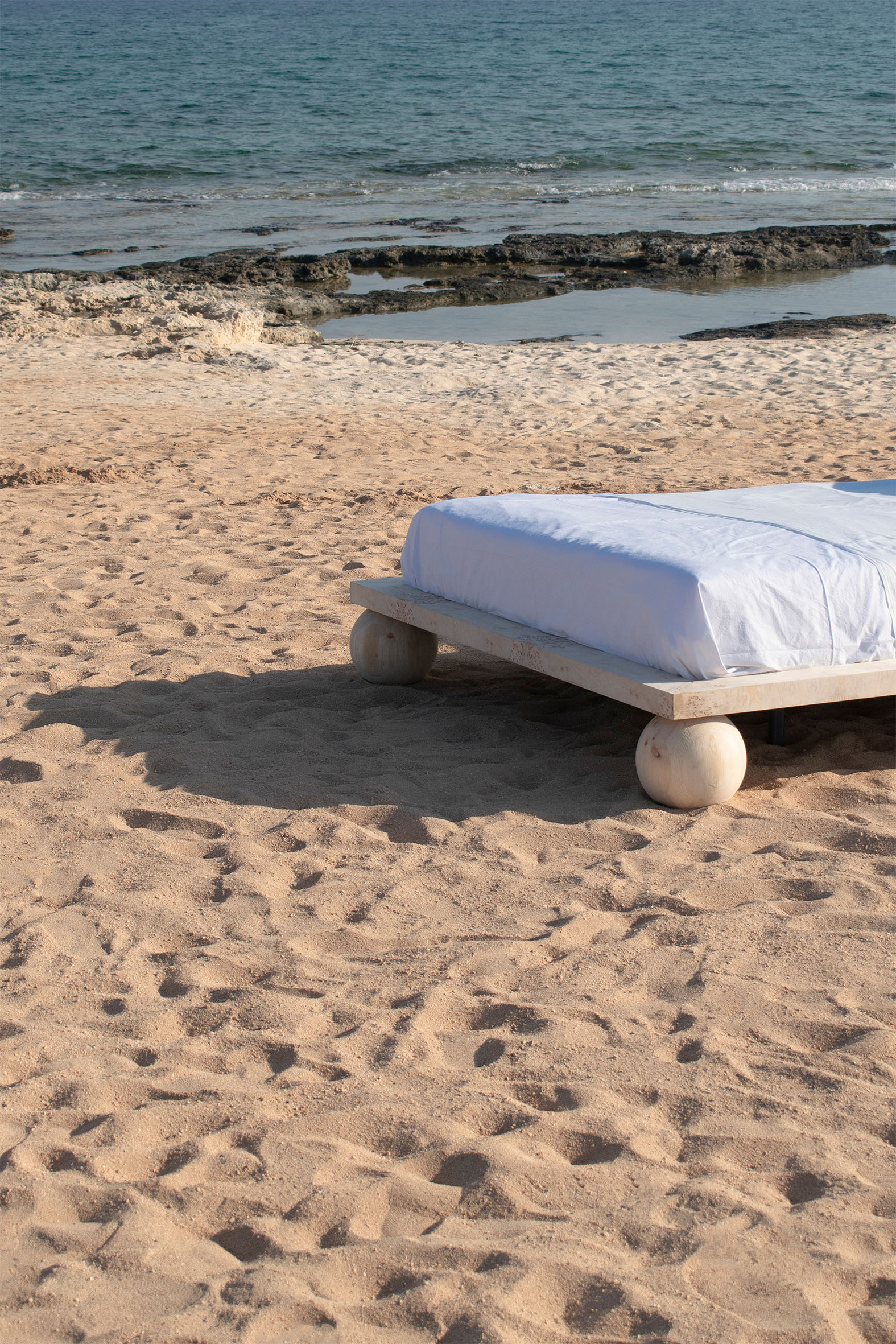 Dreaming is an essential concept in the process of designing this collection. Being no exception, the EPIFANIA bed becomes both the object and the result of conceptual dreaming. Resting on the intersection of two perpendicular planes, supported by two wooden spheres, the design results in a bold queen-size bed aimed to be the centerpiece of the space. Ideal for higher mattresses, the bed comes in all petrol green lacquered wood finish or natural burl veneer in beige tones.