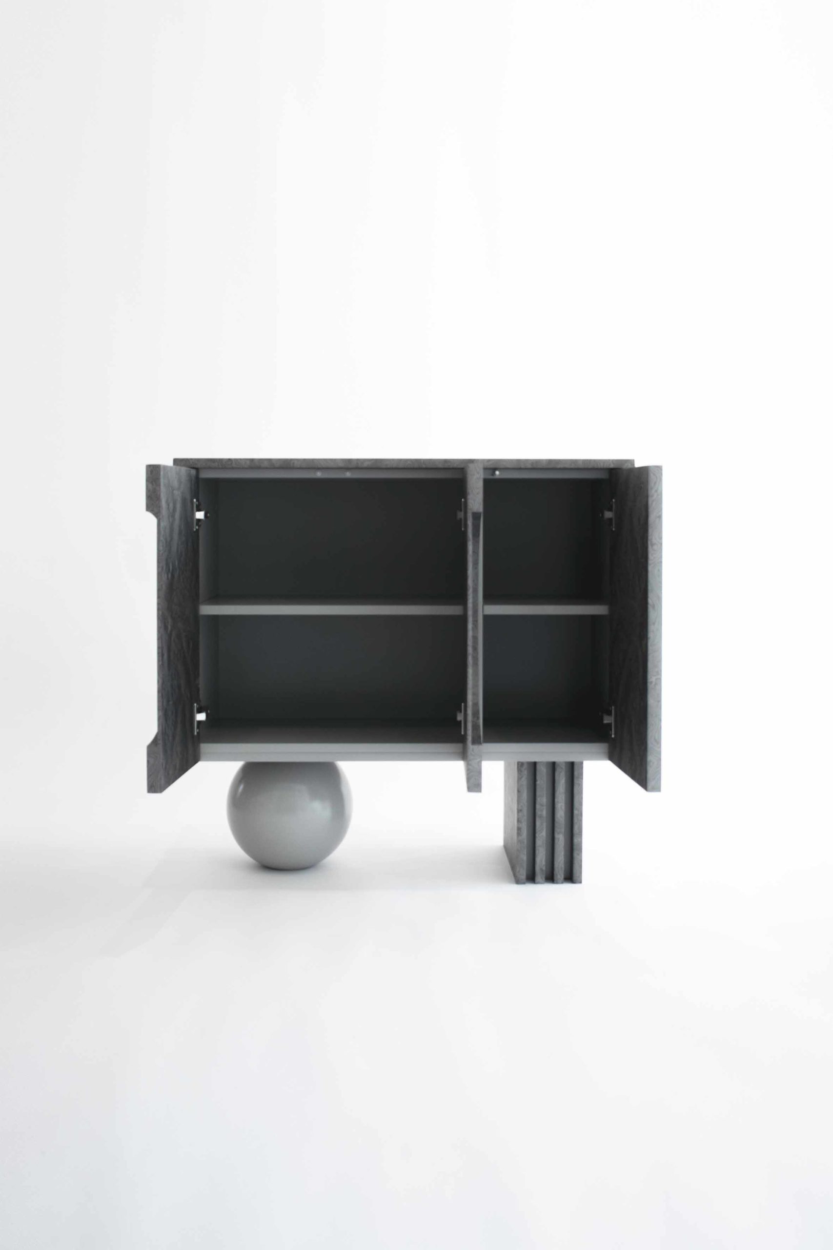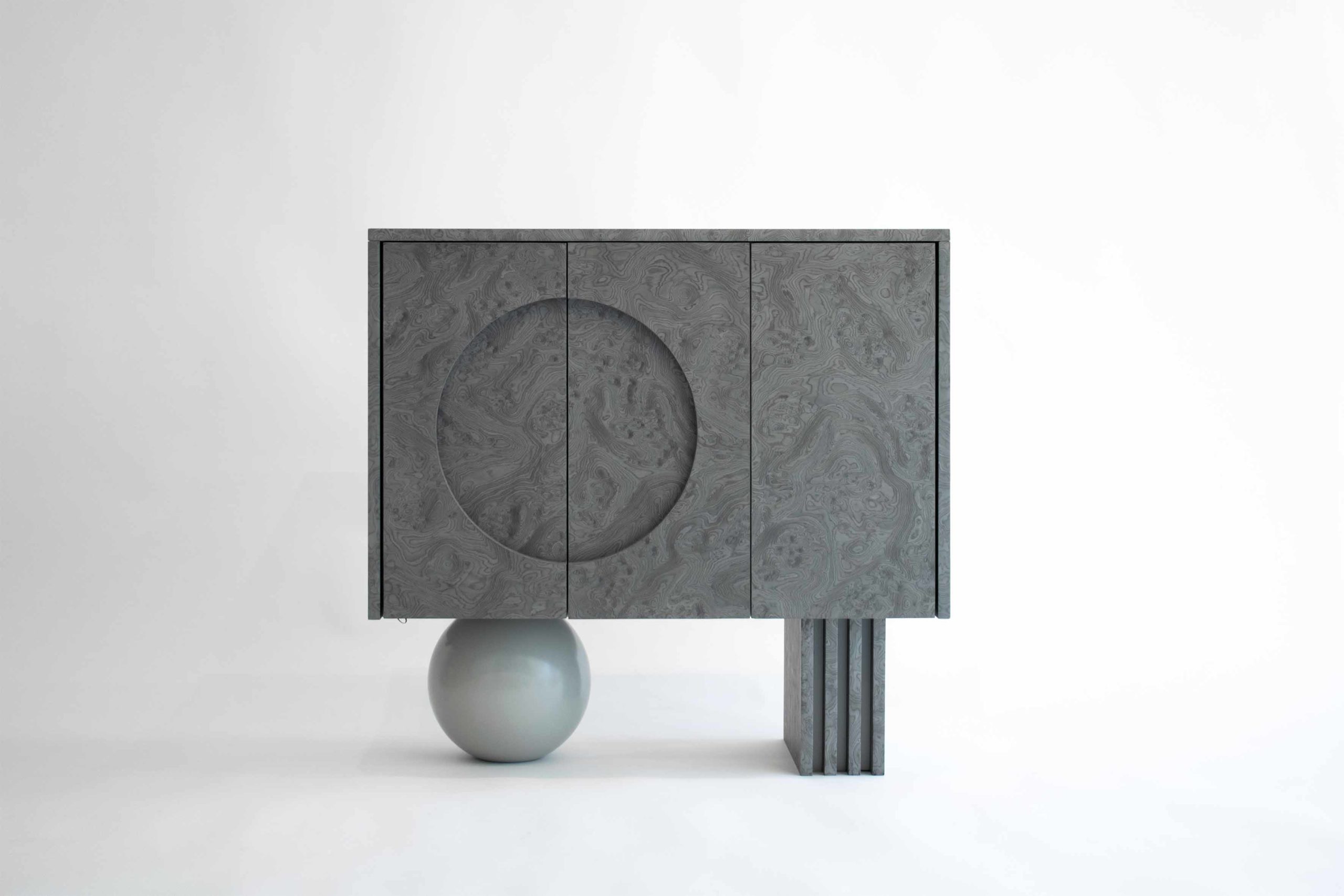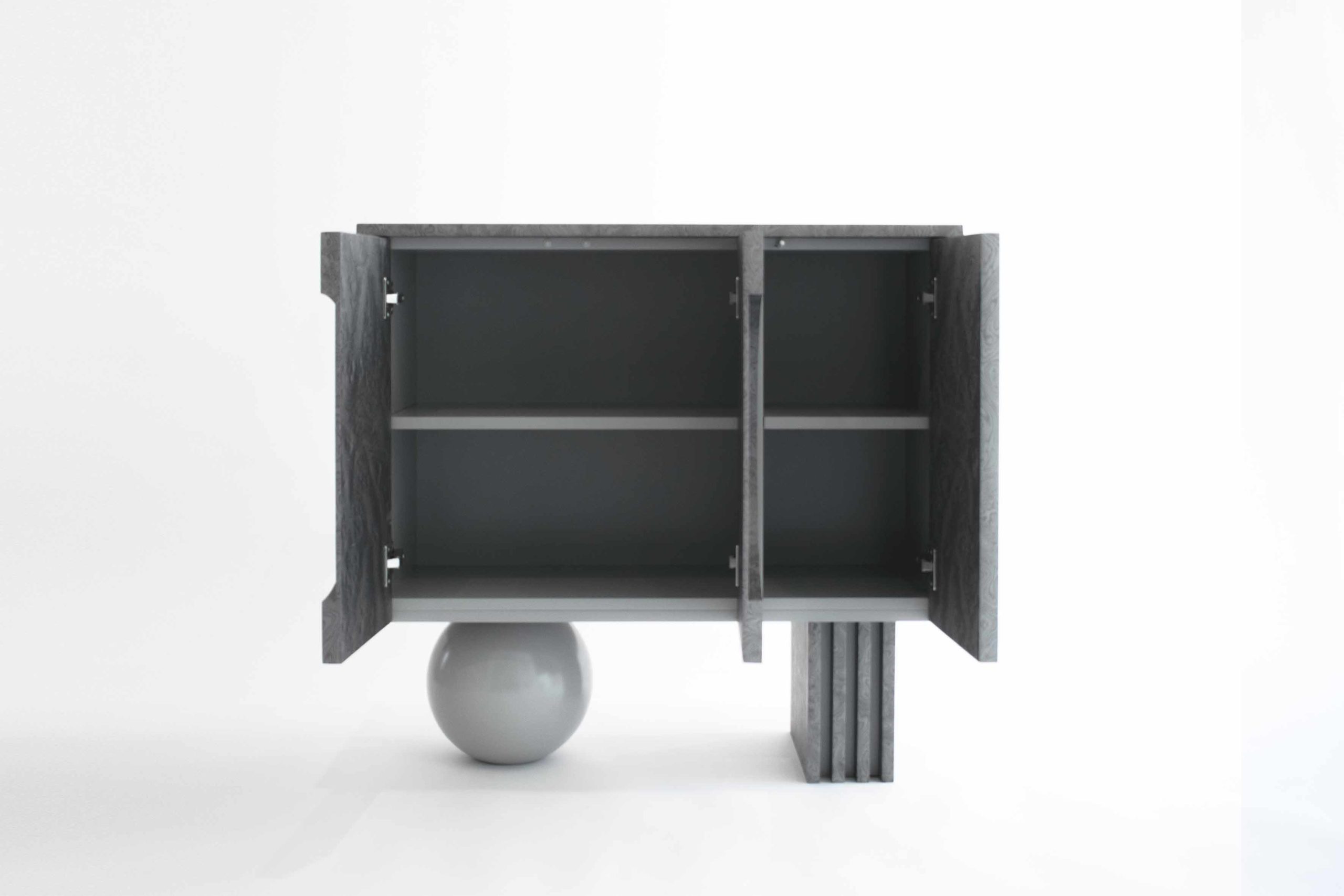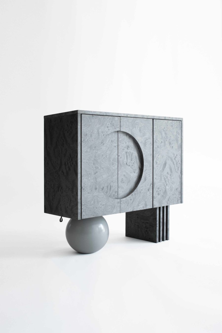 Following the dark tone pieces in the series, this piece takes the shape of a concentrated prism, gently levitating over the base plane. The triple door buffet is covered in ALPI silver veneer, with a subtle engraved moon circle in its left side. The pair of supports consists of a wooden sphere in matching silver tones and a quartet of vertical planes in an array that match the materiality of the elevated volume.