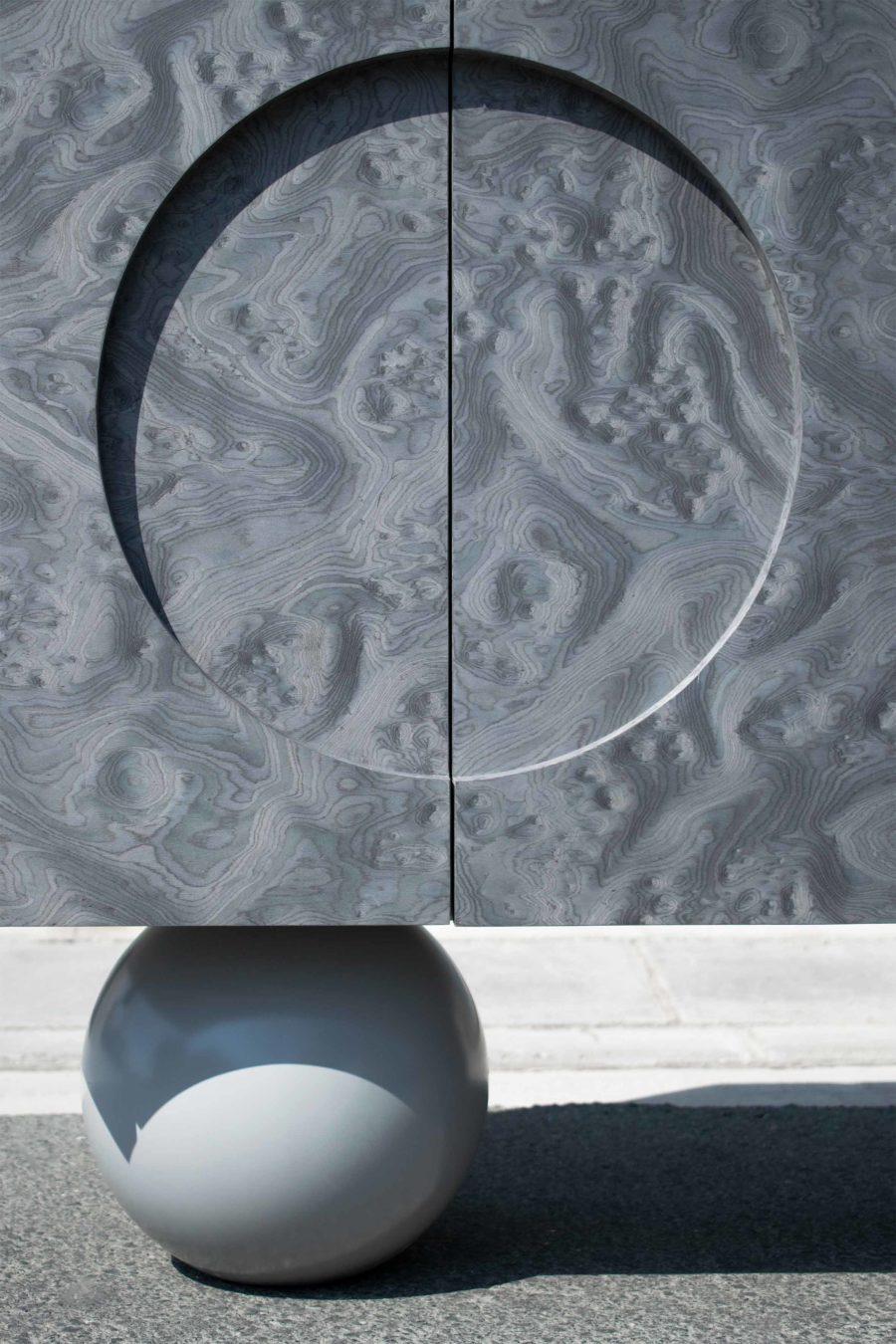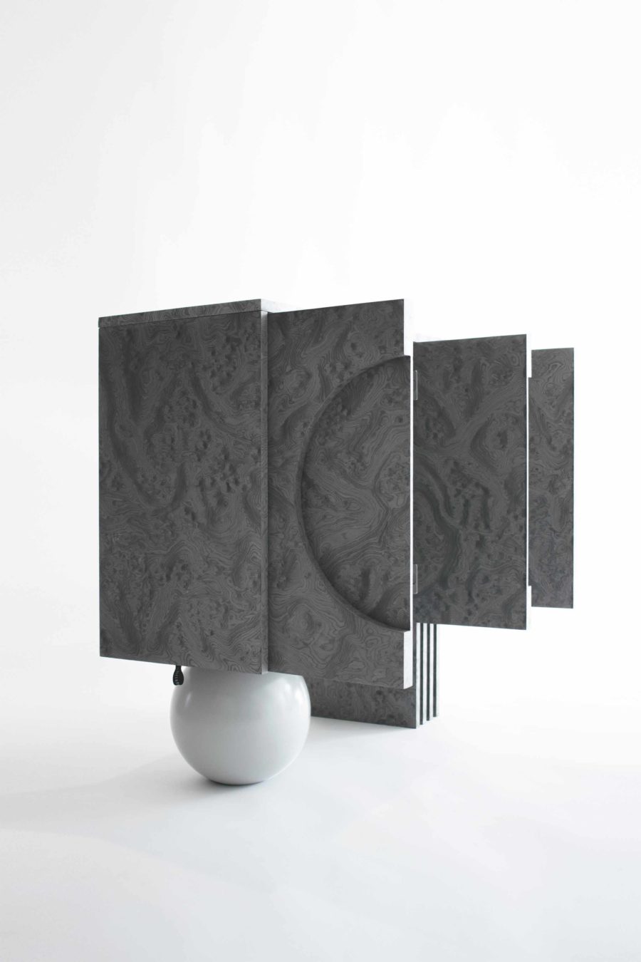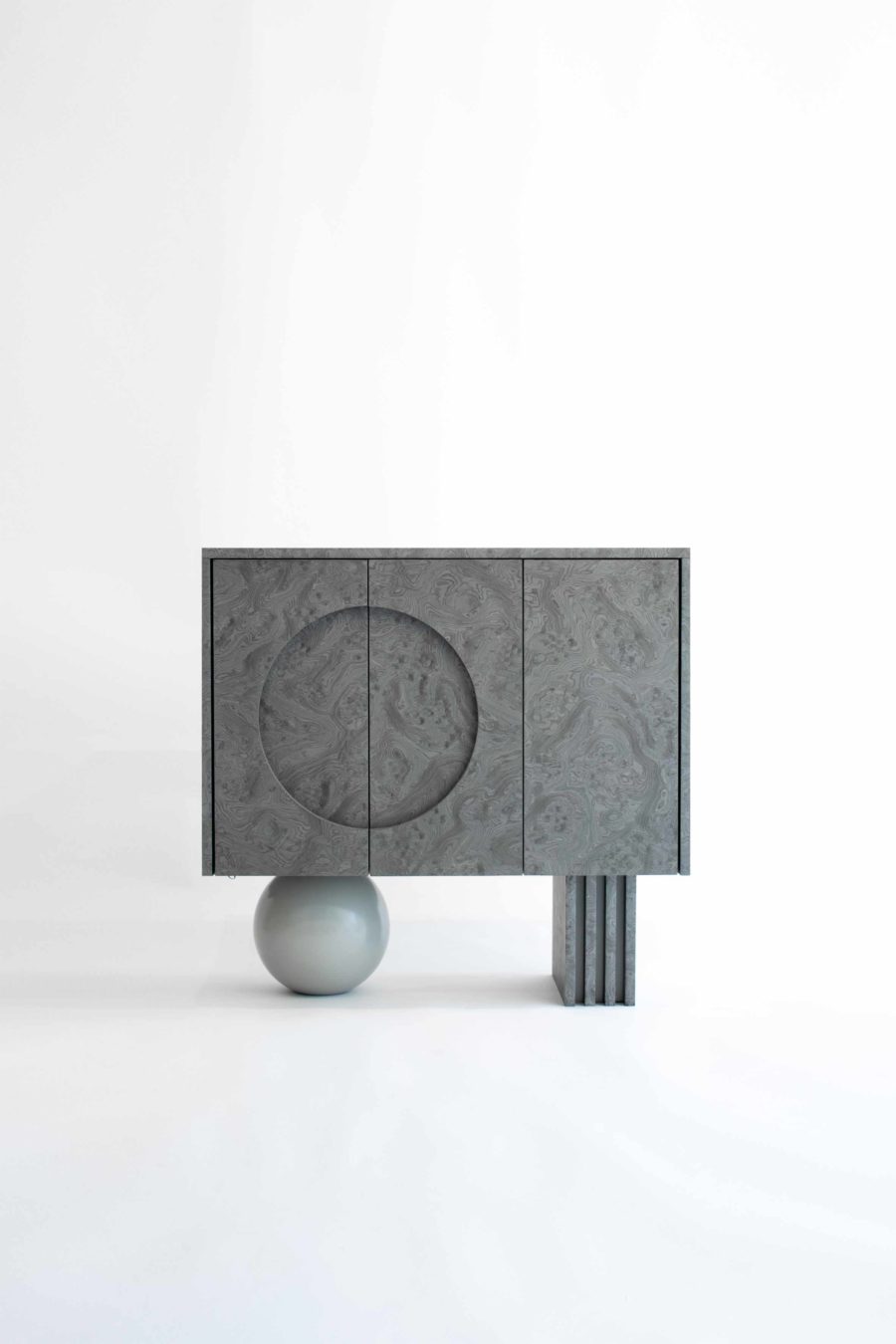 Following the dark tone pieces in the series, this piece takes the shape of a concentrated prism, gently levitating over the base plane. The triple door buffet is covered in ALPI silver veneer, with a subtle engraved moon circle in its left side. The pair of supports consists of a wooden sphere in matching silver tones and a quartet of vertical planes in an array that match the materiality of the elevated volume.
