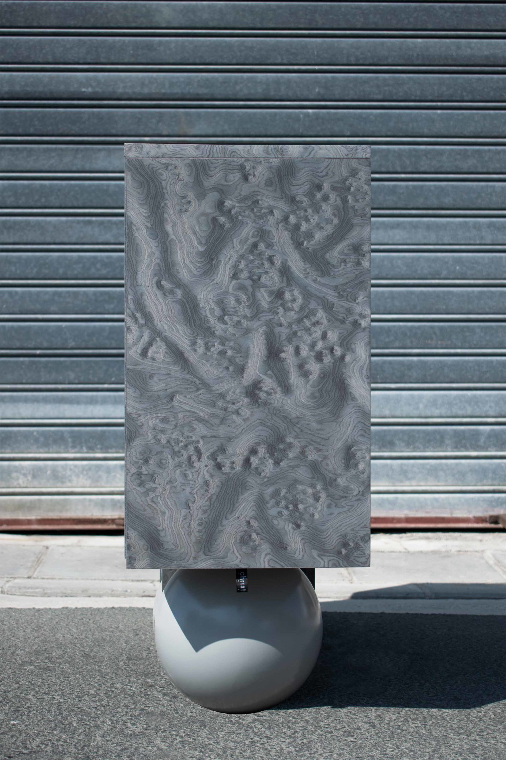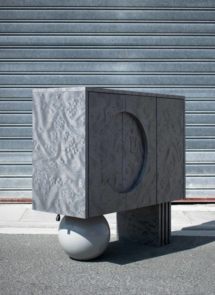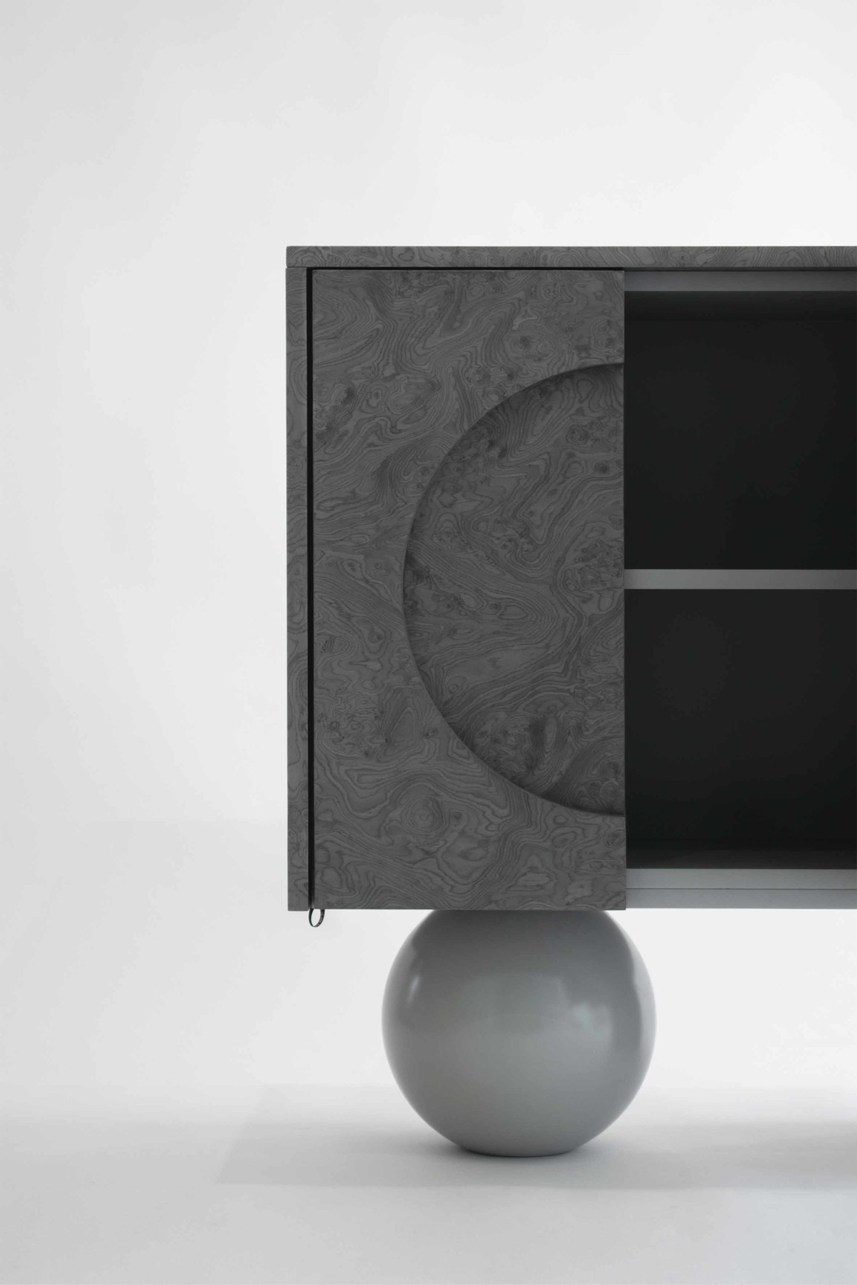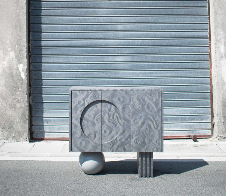 Following the dark tone pieces in the series, this piece takes the shape of a concentrated prism, gently levitating over the base plane. The triple door buffet is covered in ALPI silver veneer, with a subtle engraved moon circle in its left side. The pair of supports consists of a wooden sphere in matching silver tones and a quartet of vertical planes in an array that match the materiality of the elevated volume.