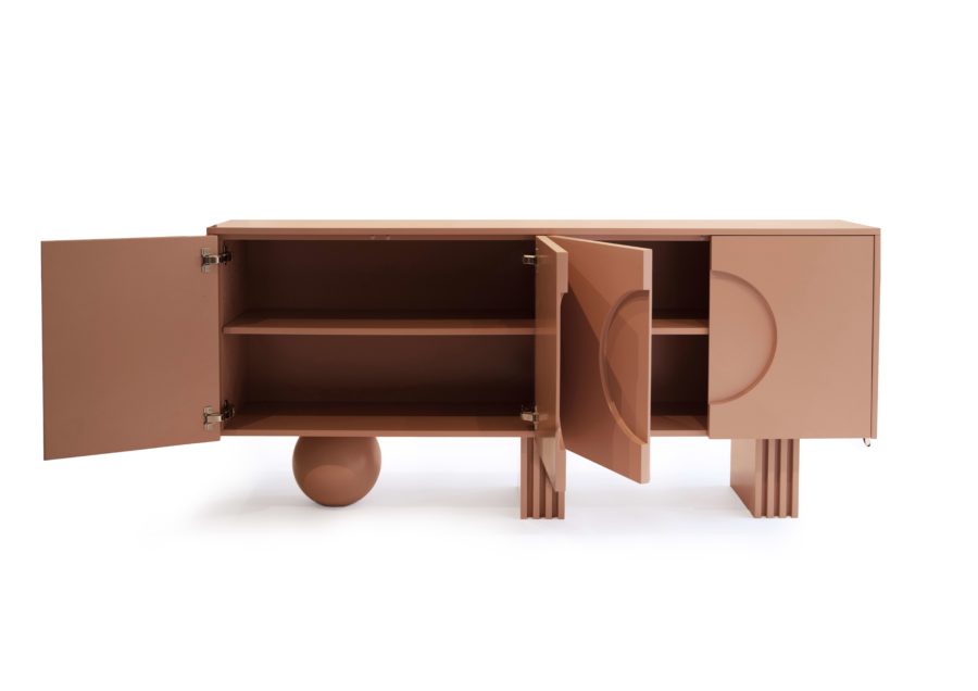 The supports echo the pink transformation – a wooden sphere in matching tones and a quartet of vertical planes, harmonizing with the elevated volume’s materiality. This buffet is a minimalist yet captivating blend of sophistication and playfulness, where every detail whispers a tale of timeless beauty.