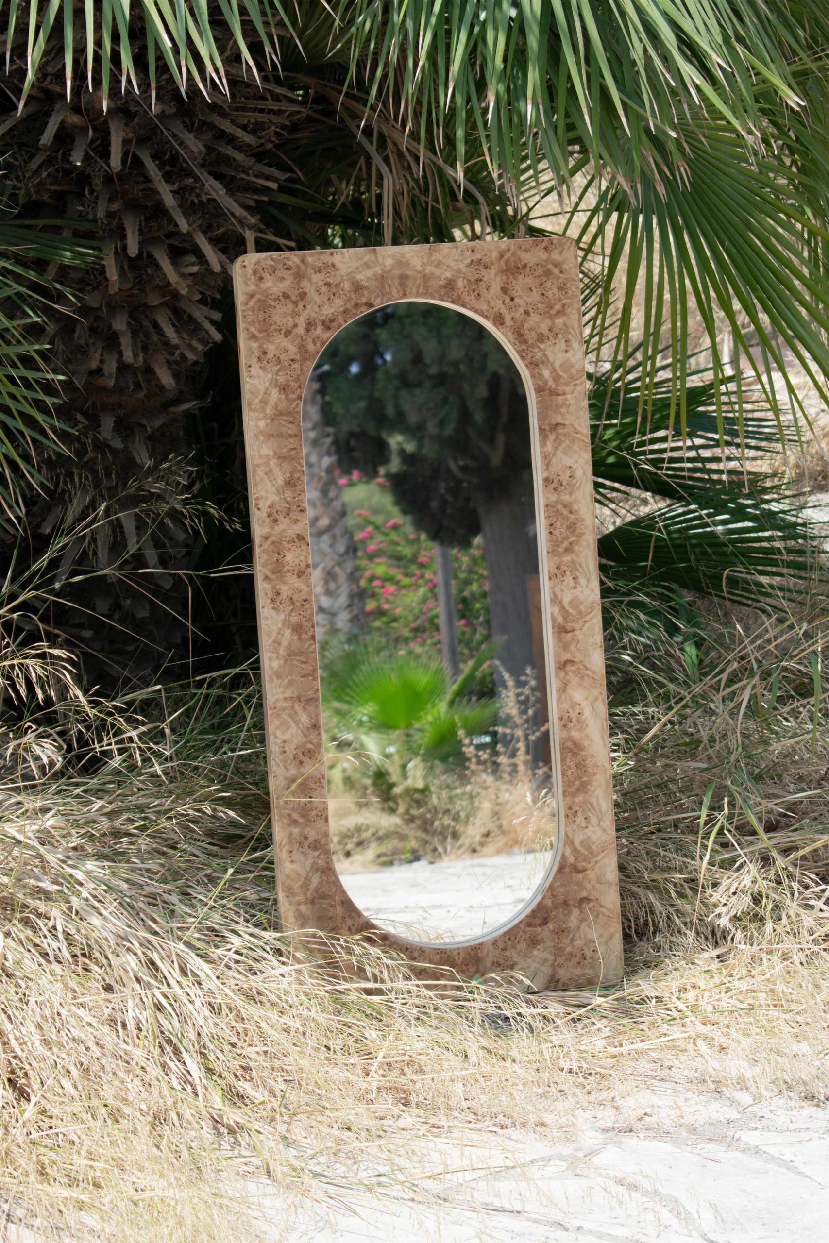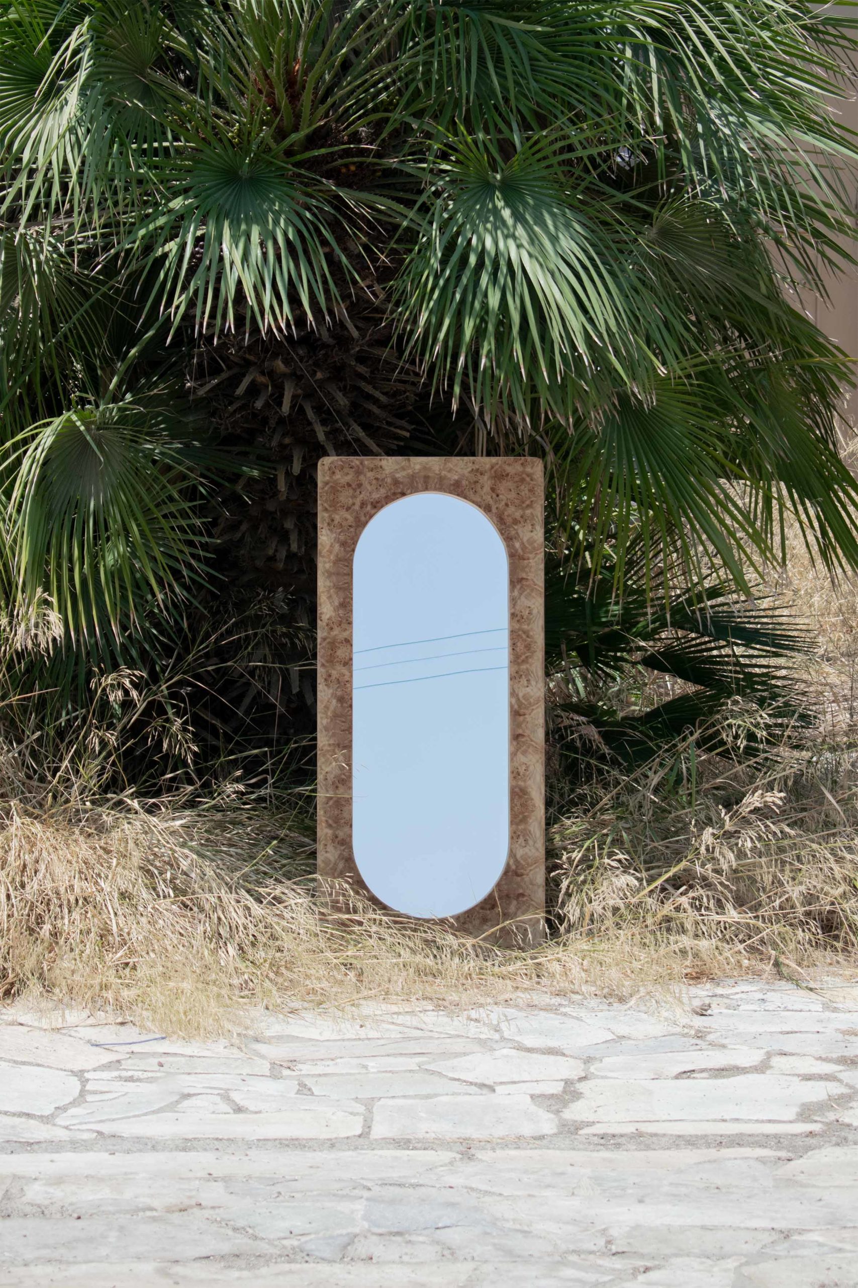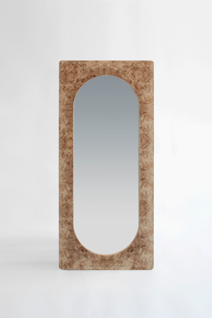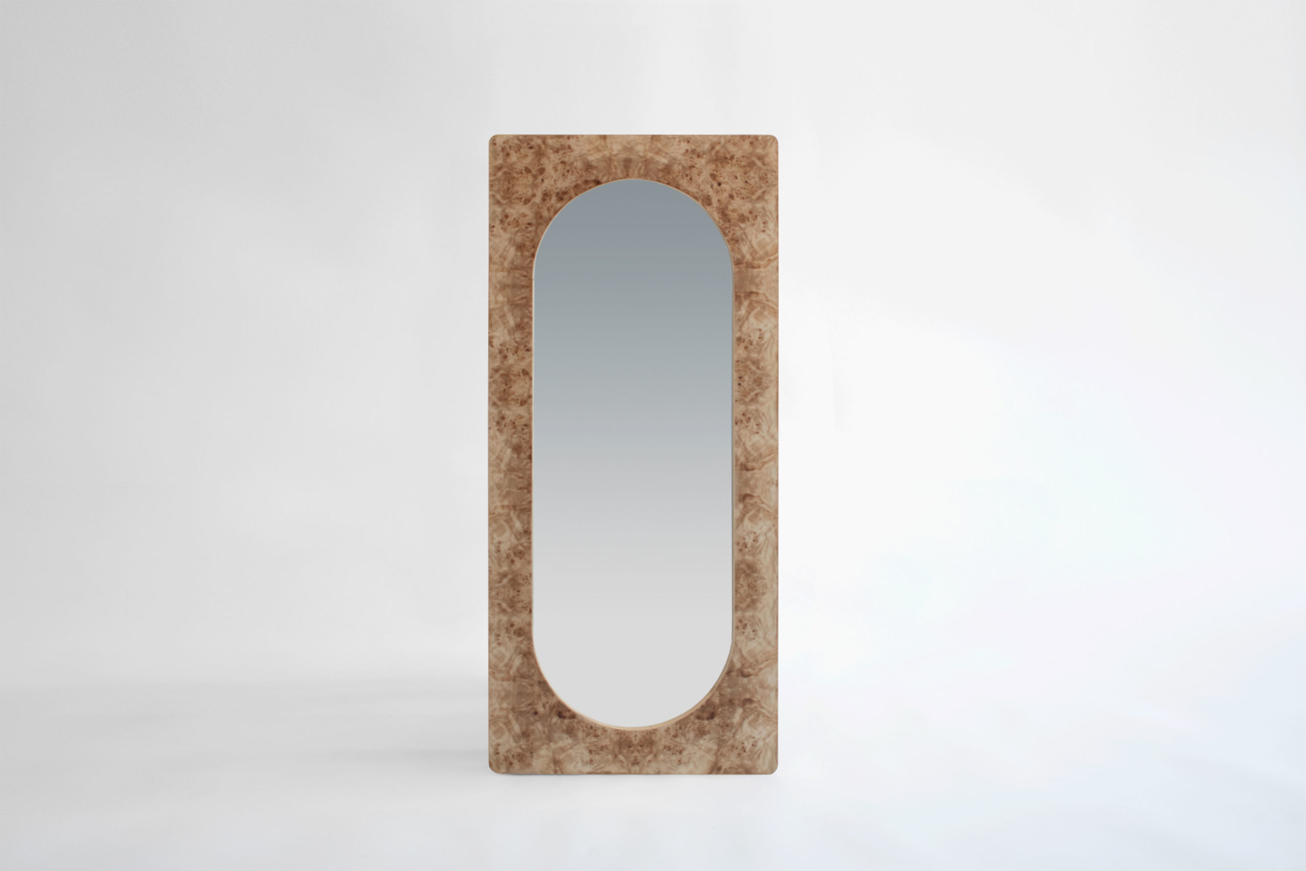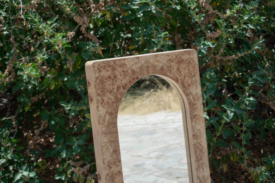 This mirror piece draws inspiration from its twin mirror pieces in the collection. Liberated from its plinth, this leaning version is applicable both vertically and horizontally on the wall, either hanged or leaned against it. The double arch silhouette of the mirror follows the classical shapes found in the other collection pieces whilst the frame is finished with the signature natural burl veneer sheets.