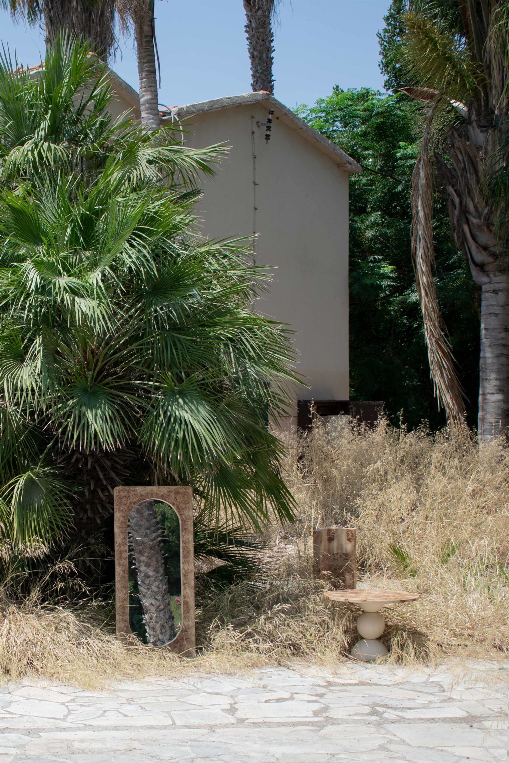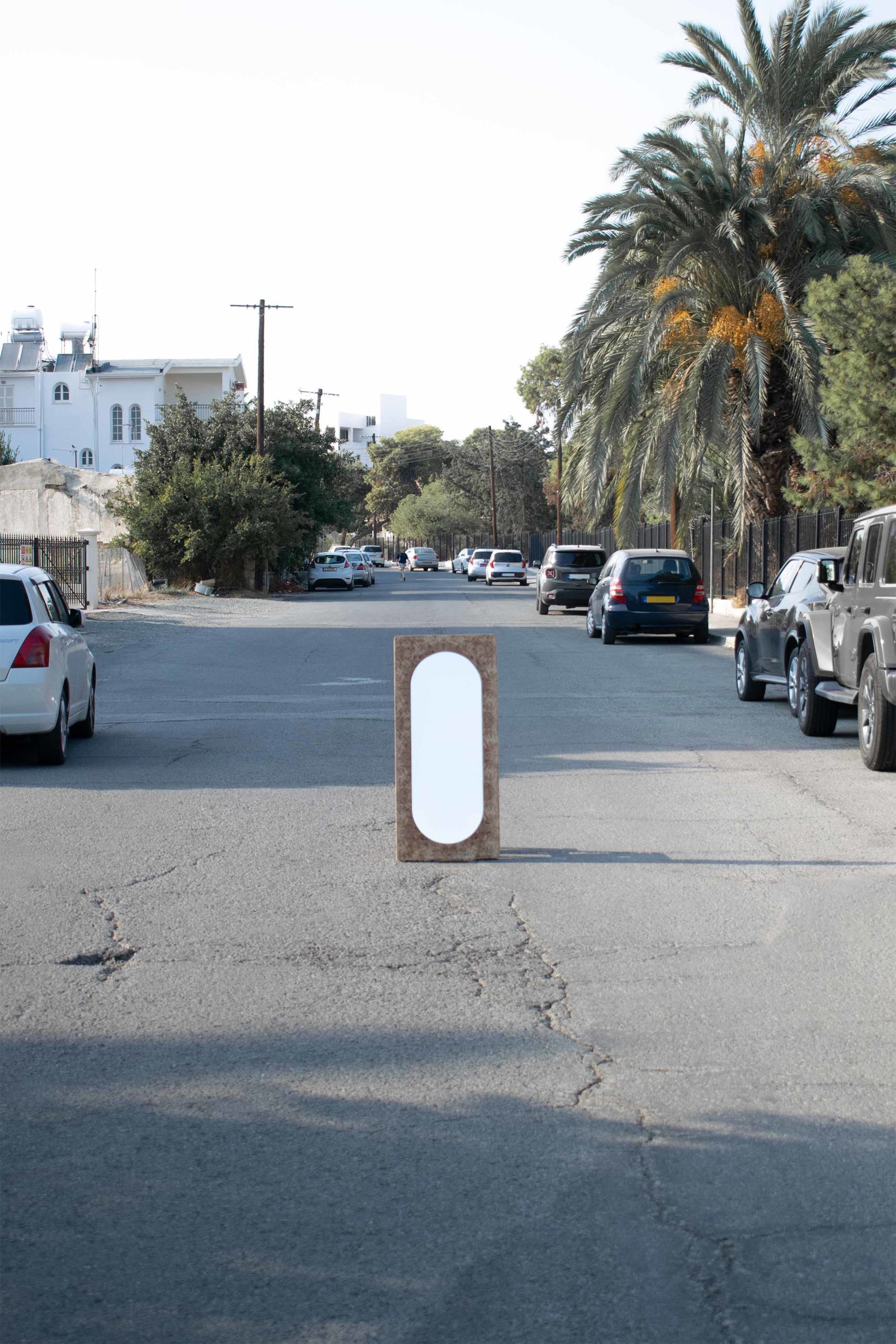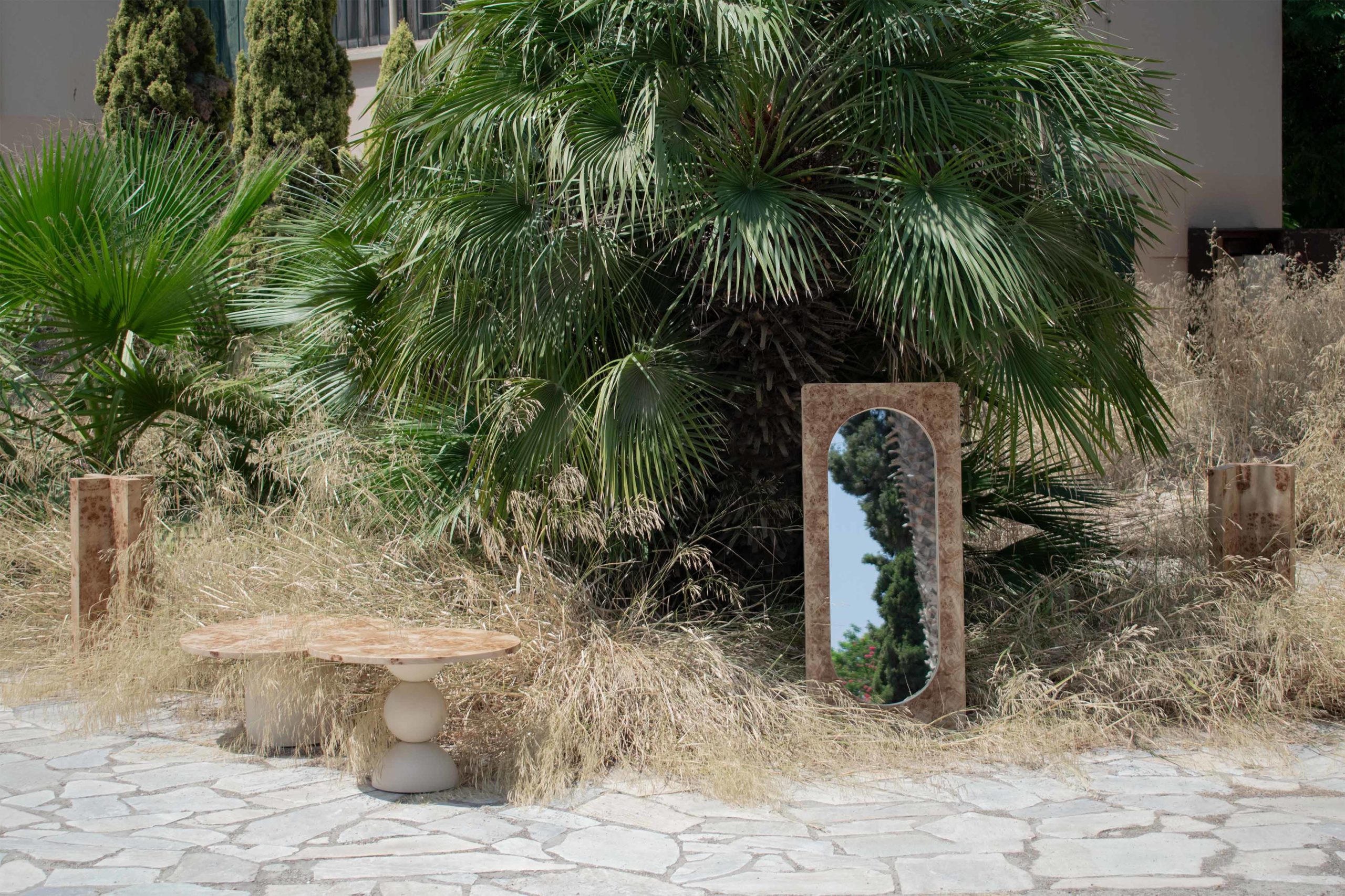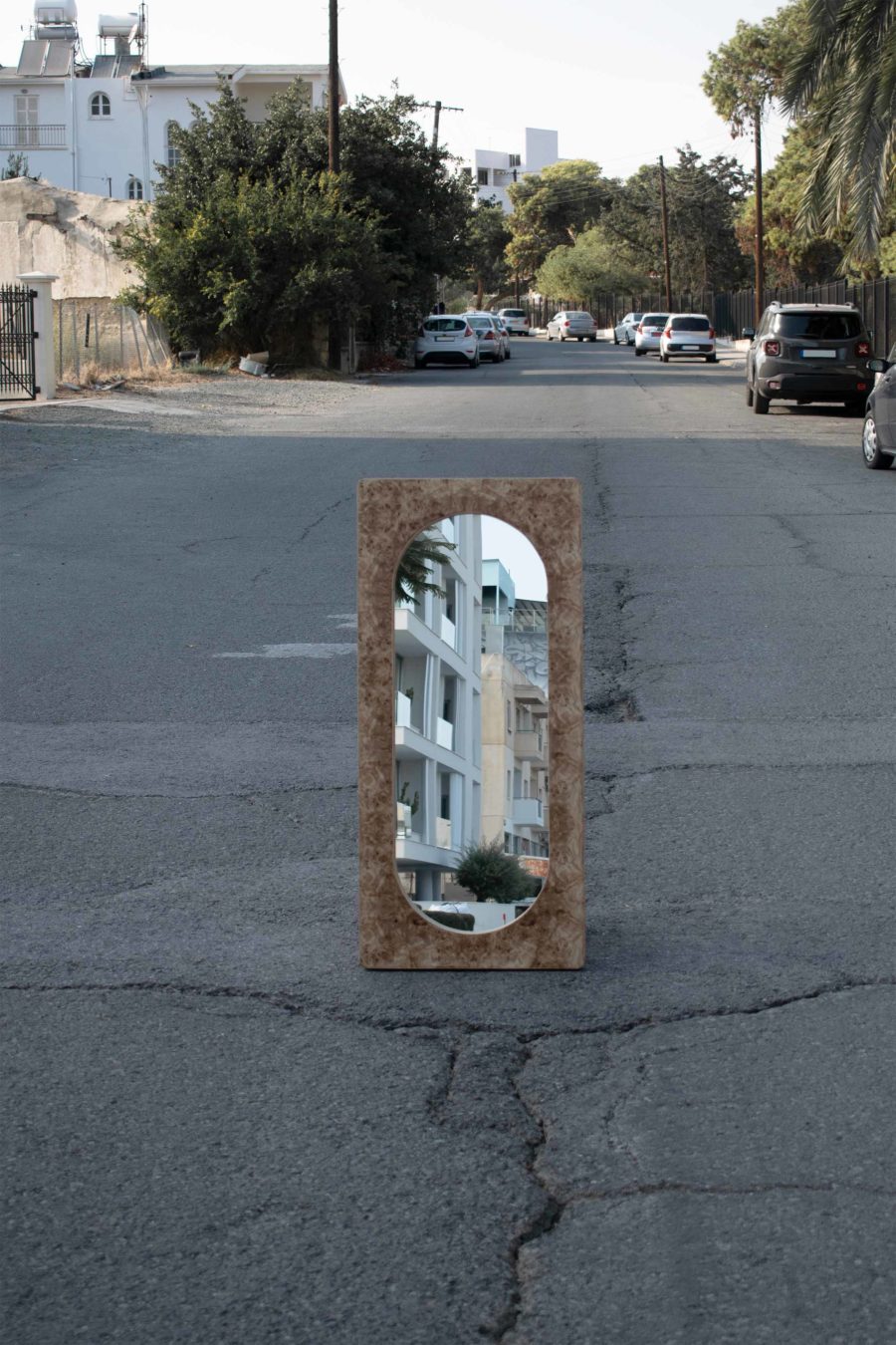 This mirror piece draws inspiration from its twin mirror pieces in the collection. Liberated from its plinth, this leaning version is applicable both vertically and horizontally on the wall, either hanged or leaned against it. The double arch silhouette of the mirror follows the classical shapes found in the other collection pieces whilst the frame is finished with the signature natural burl veneer sheets.