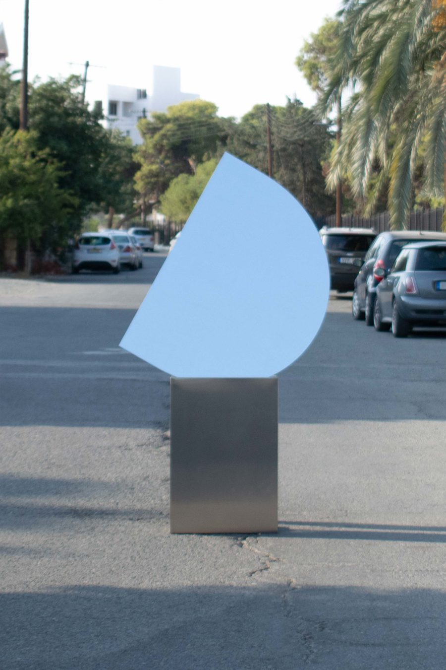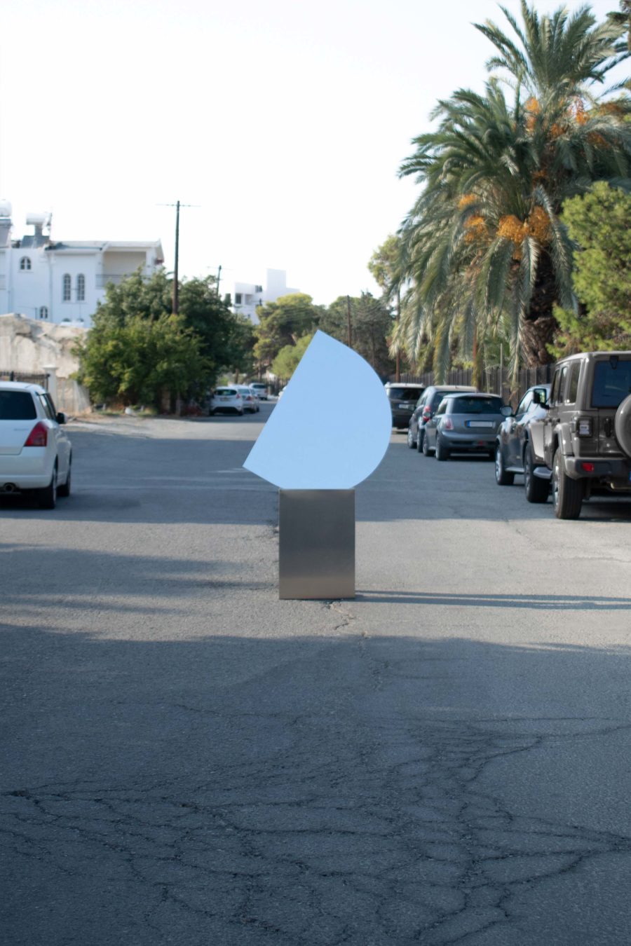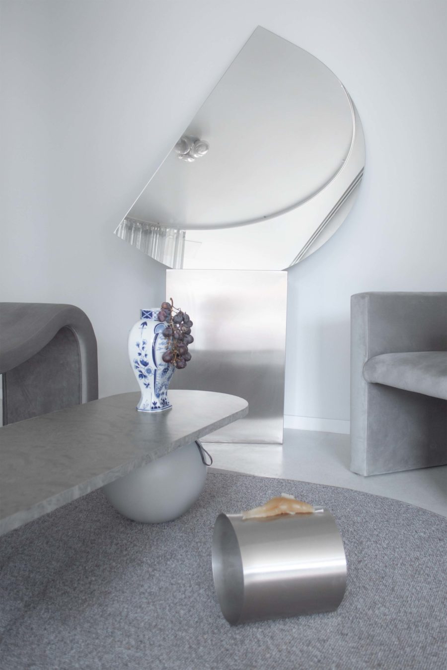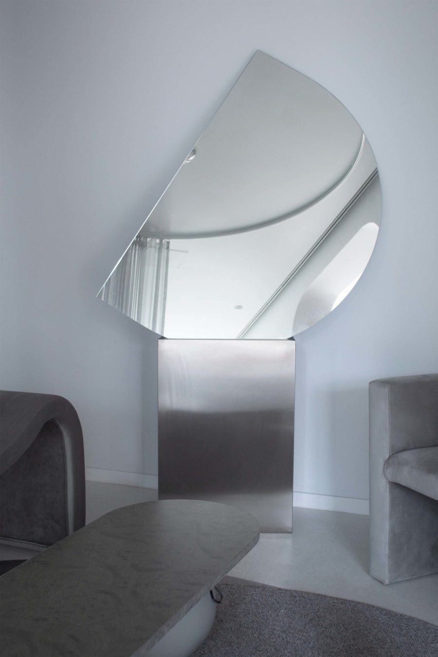 The design for this free-standing piece was inspired by the lunar orbit. Never static and all-seeing, the piece is conceived as a double sided mirror, resting on a metal plinth. The lower support is finished with a stainless steel surface, with a horizontal slit on the upper face that hosts the hemispherical reflective surface, proposed to be placed in a soft angle to resemble the eclipse of the moon.