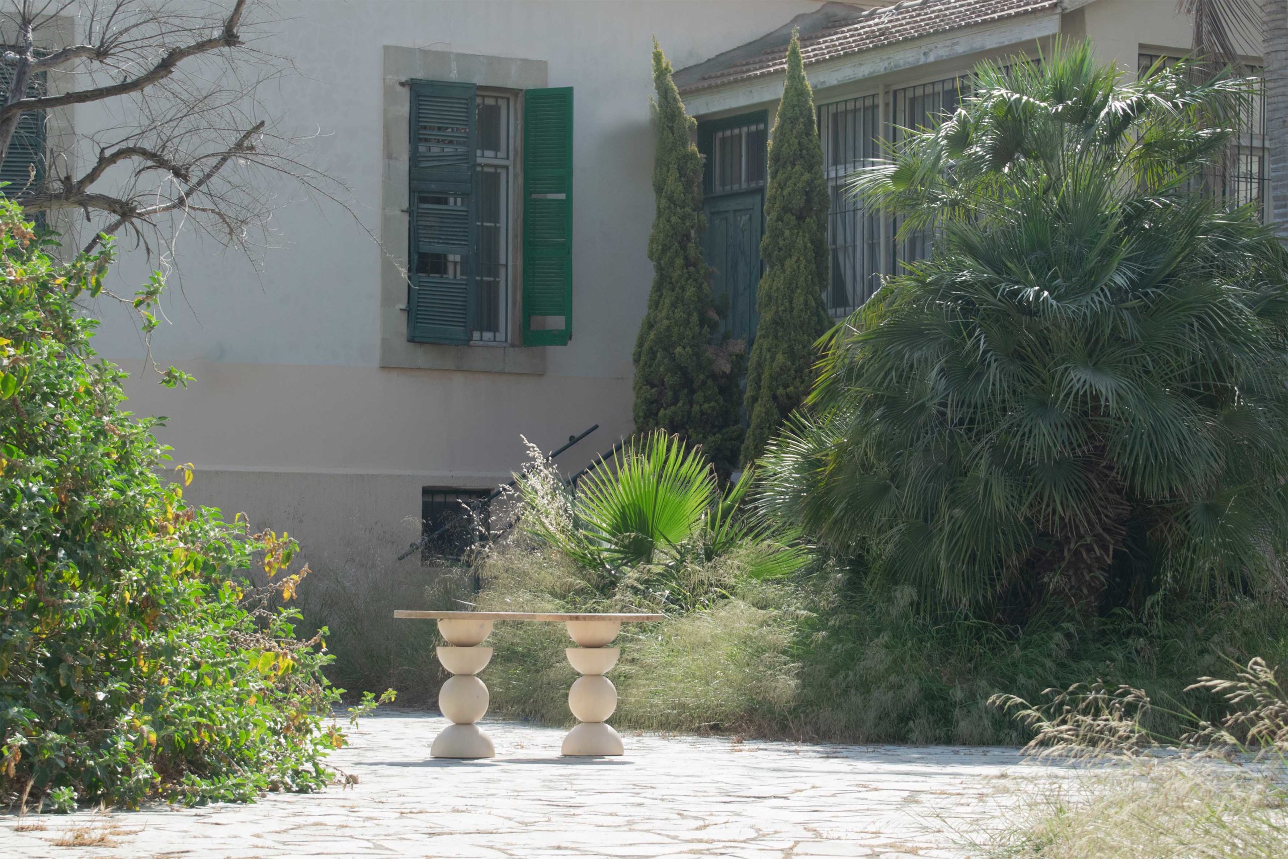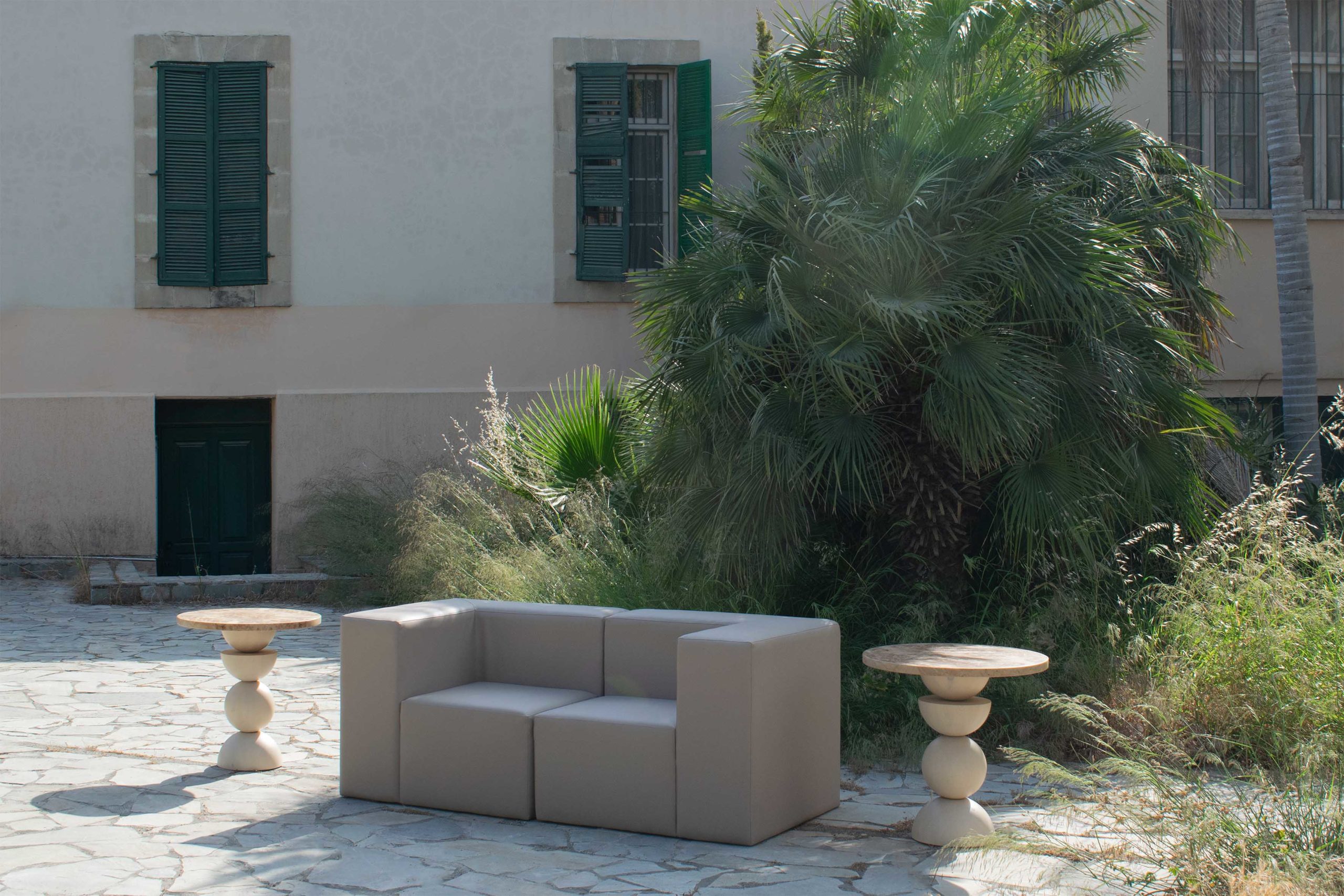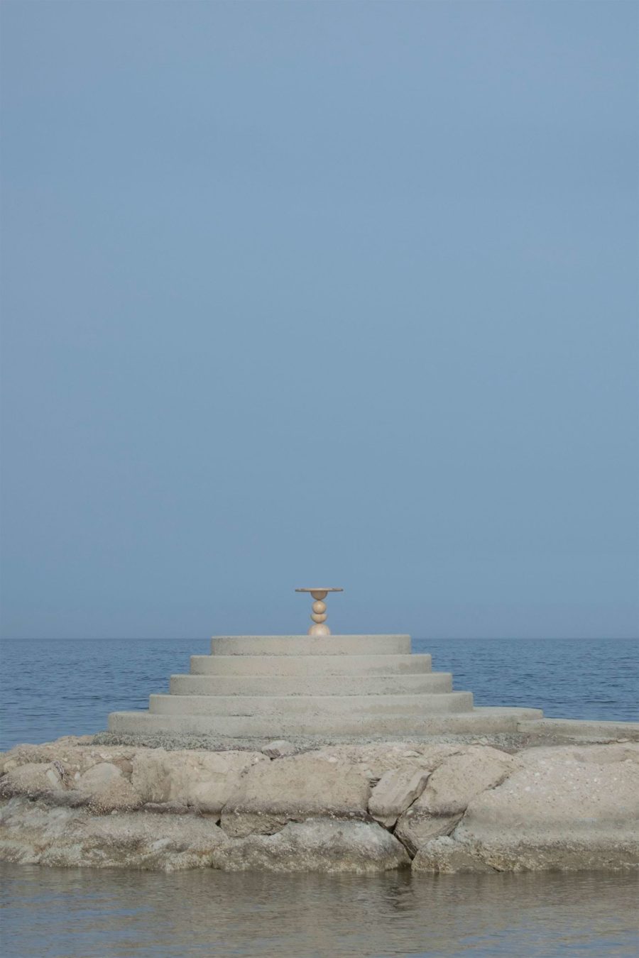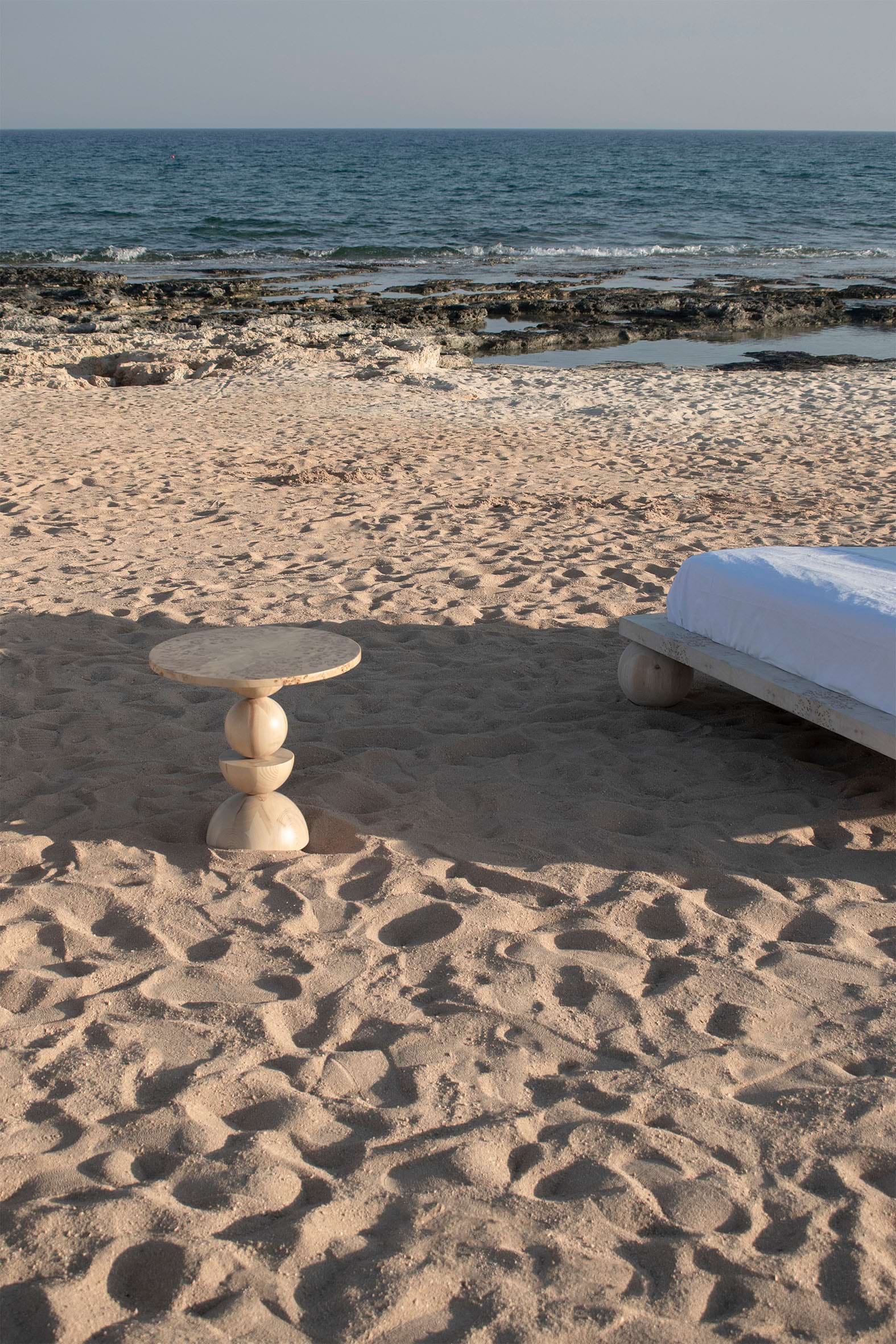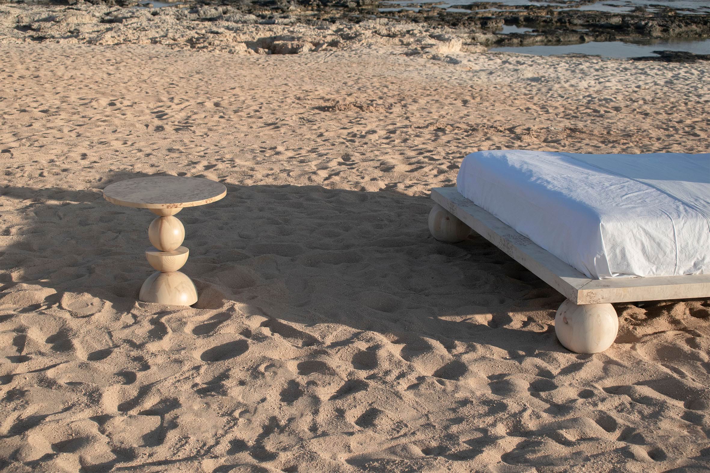 Exploring the idea of a vertical array of the classical prisms used in the collection, this piece takes the form of a lower side table. The horizontal circular surface, fully covered in natural burl veneer sheets, is resting on an epicentric axis where complete and semi-spheres are arranged in a totem-like fashion. The design is conceived as an archaic constellation of elements, in the hues of sandy beige.