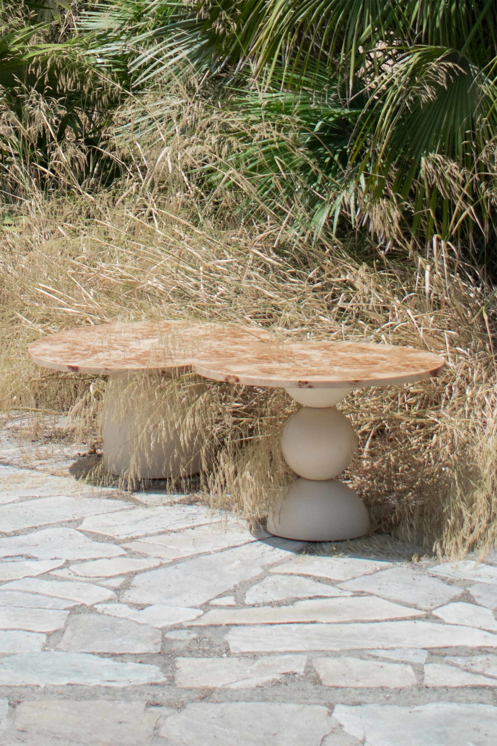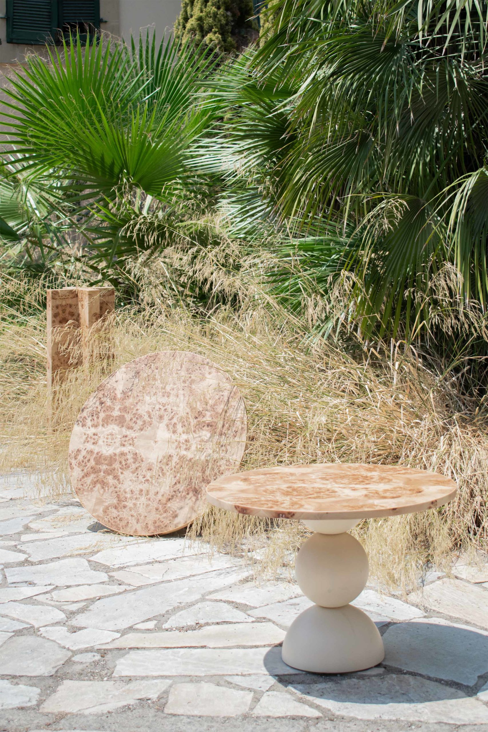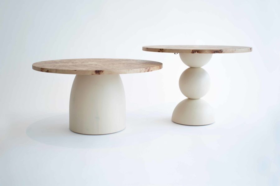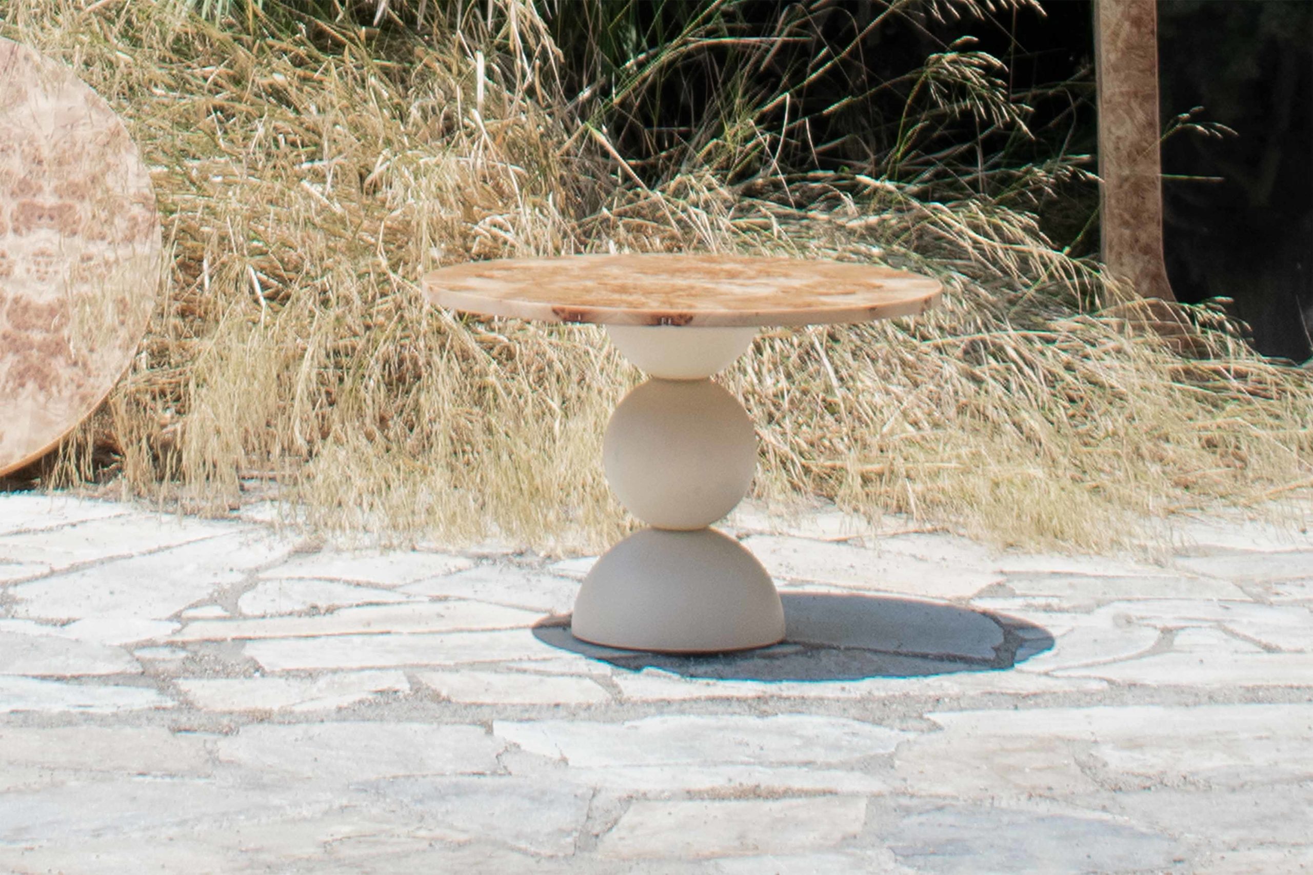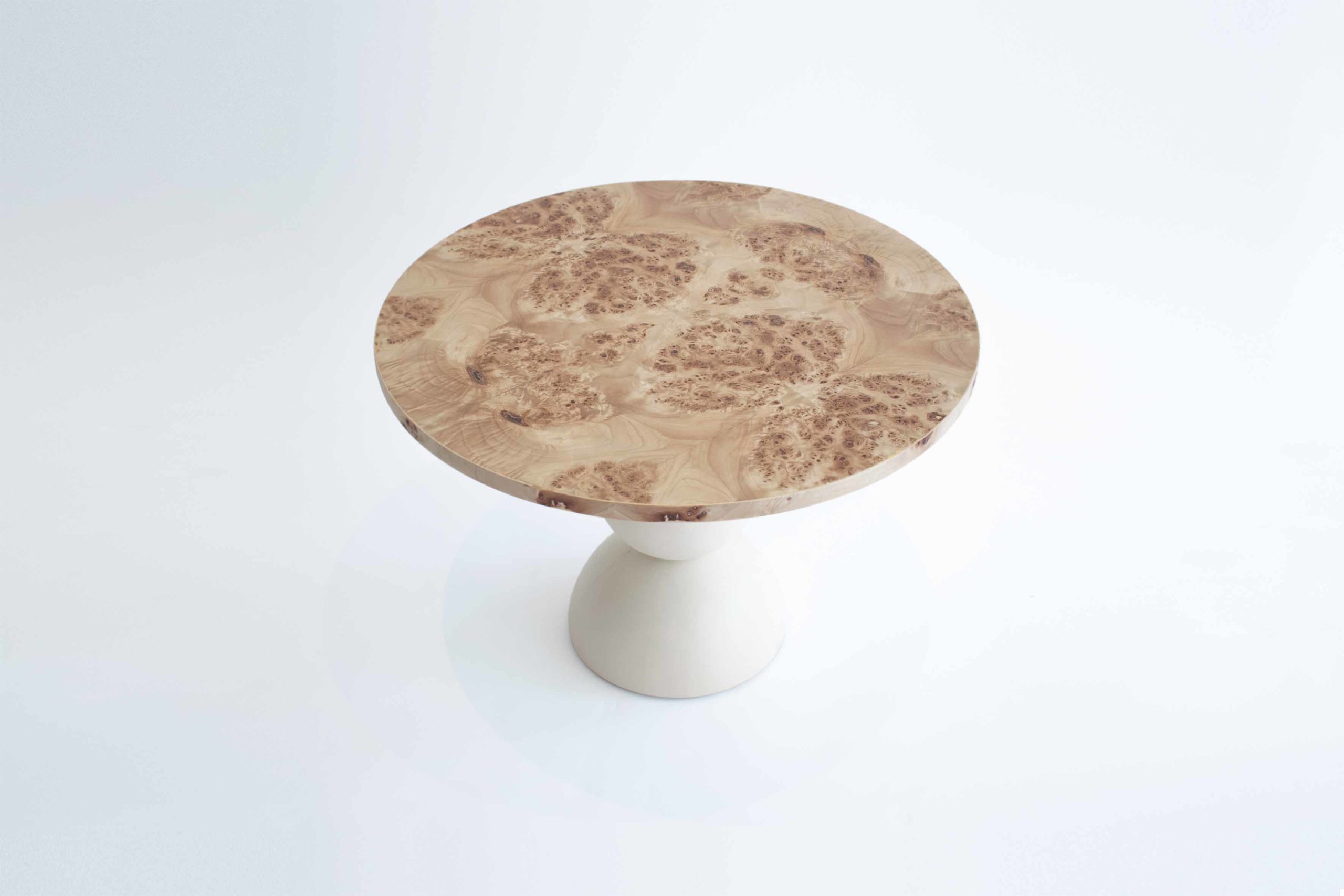 Exploring the idea of a vertical array of the classical prisms used in the collection, this piece takes the form of a lower side table. The horizontal circular surface, fully covered in natural burl veneer sheets, is resting on an epicentric axis where complete and semi-spheres are arranged in a totem-like fashion. The design is conceived as an archaic constellation of elements, in the hues of sandy beige.