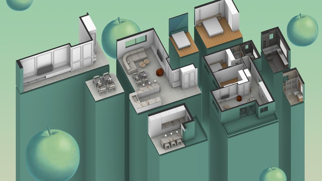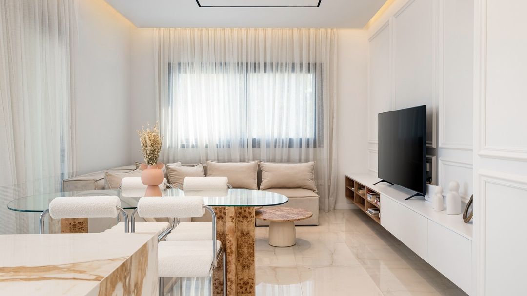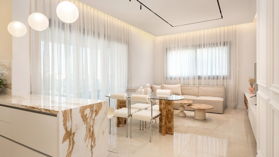 The client’s brief for this exclusive two-bed apartment in Limassol calls for the reconfiguration into a timeless and functional arrangement, where classical aesthetics seamlessly blend with contemporary detailing. The predominantly open-plan space encourages a constant exchange within the communal areas, while the private zones remain discreetly tucked away in the right wing of the apartment, accessible from the corridor past the main entrance.