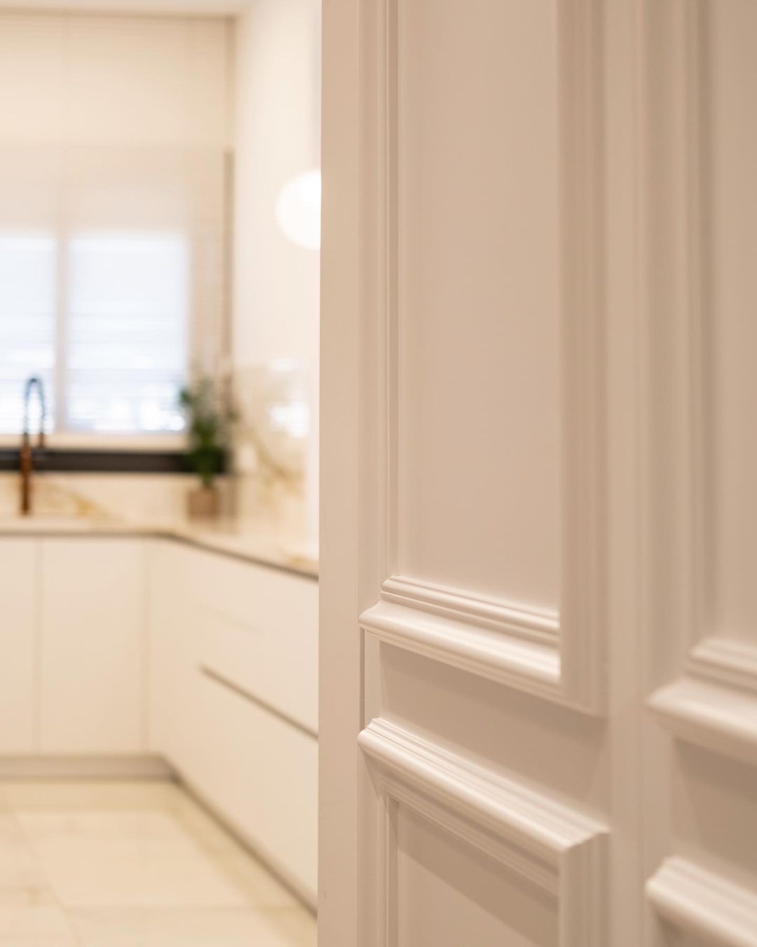 Upon arrival, the space unfolds in the blurred zone between the open-plan kitchen and the living area. The ambience is meticulously curated through a palette of low-saturation tones, featuring lavish marbles, exquisite wood finishes, and opulent fabrics. The gallery kitchen on the left culminates at the end wall, creating a niche for the sink, while on the right side, a high table bench gently flows within the living space, fostering horizontal connections in the open plan. The kitchen boasts white lacquered wooden units, and the countertops, including the end bench, are adorned with engineered granite in earthy tones of beige and grey.