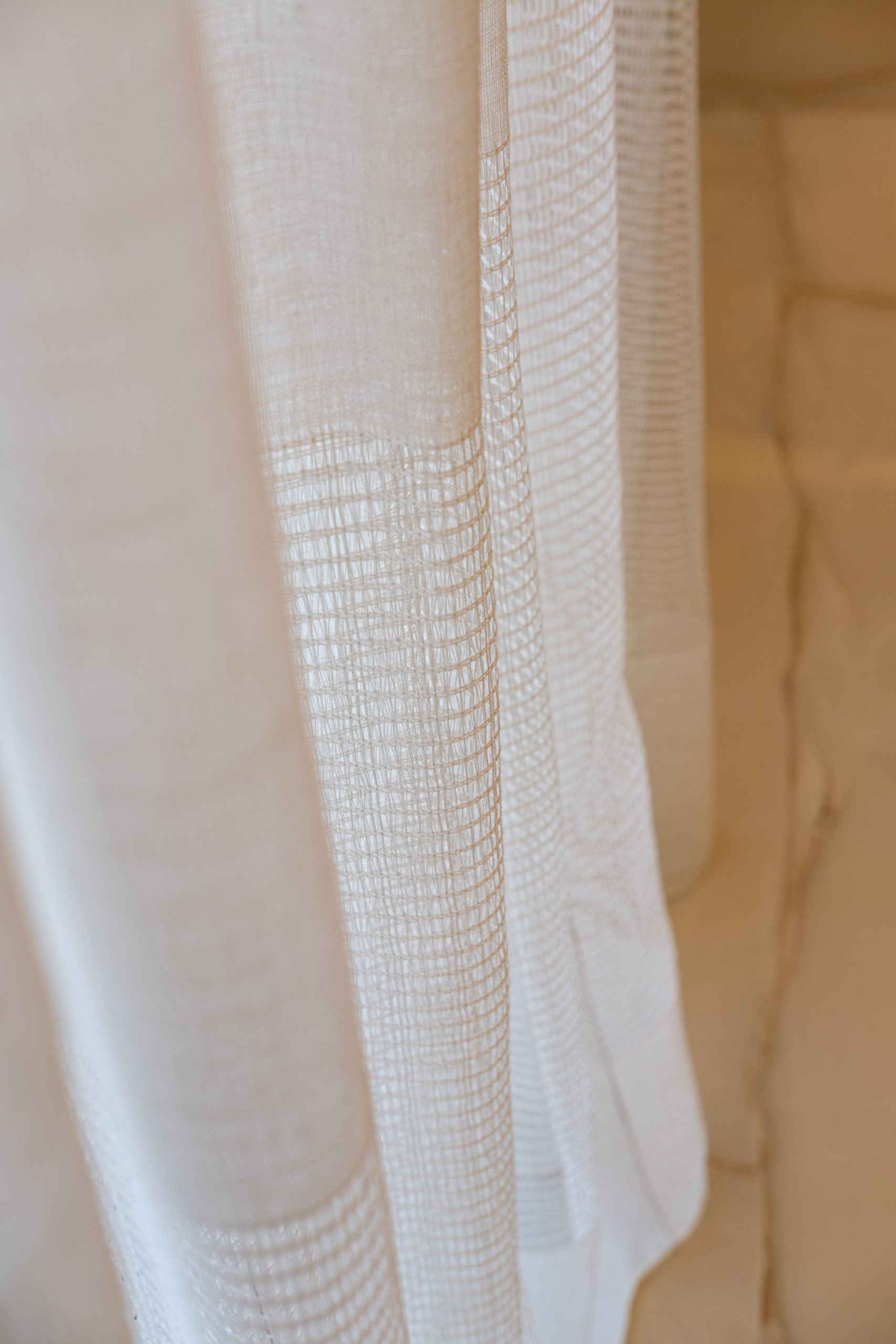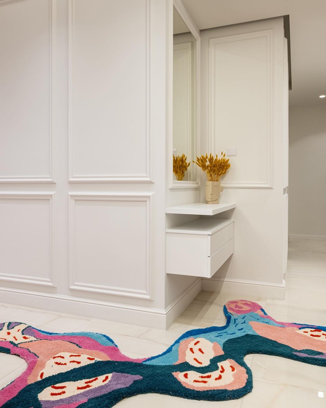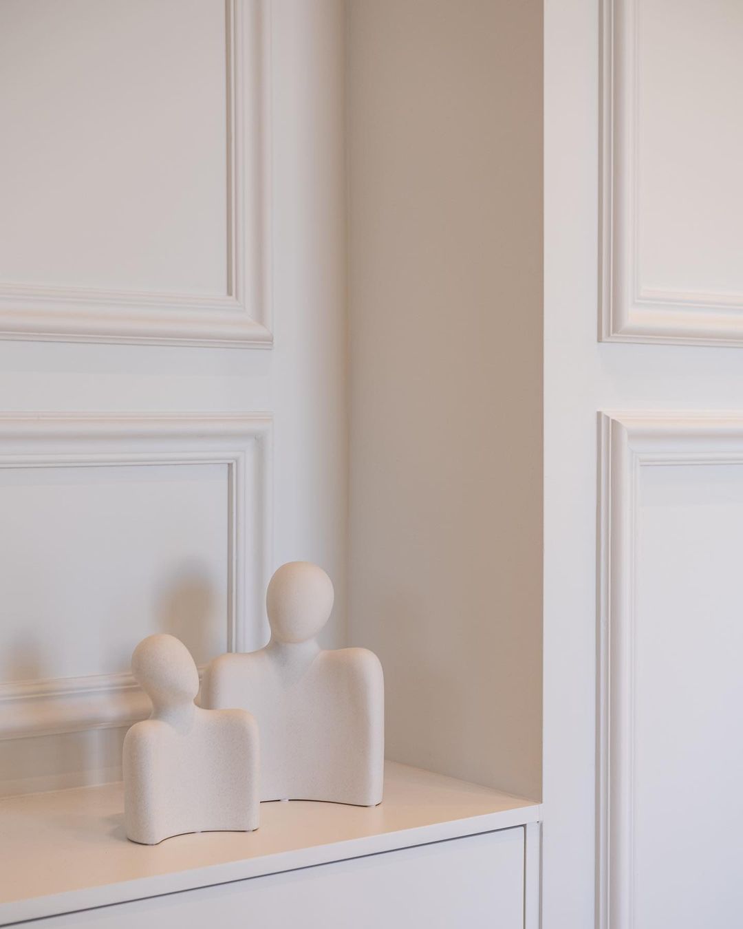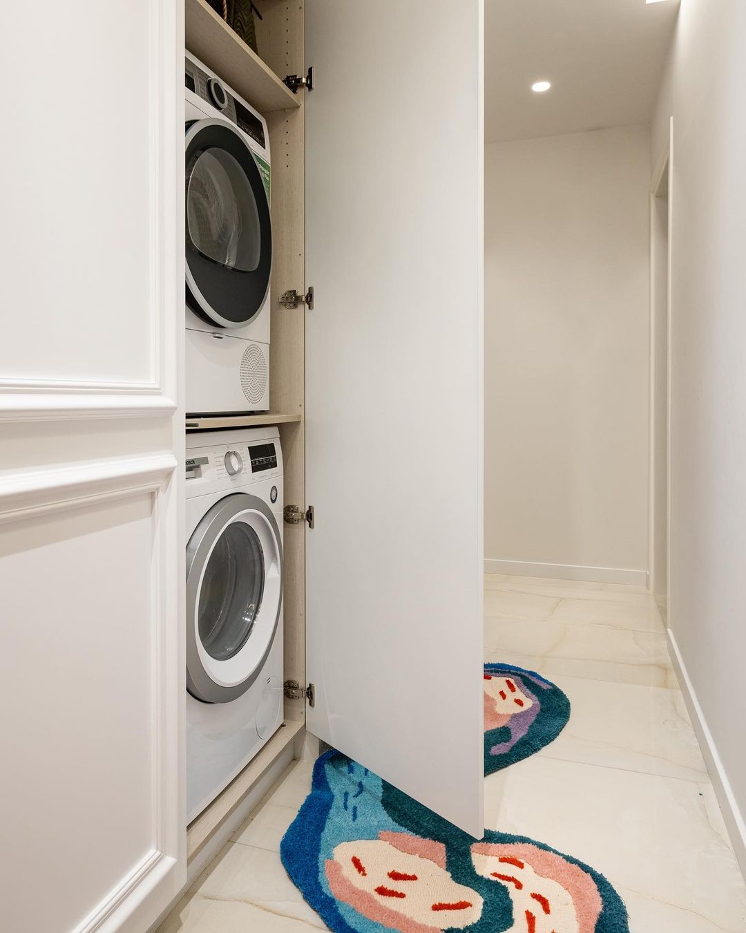 The dining and living space that ensues maintains an elevated material palette of similar tones, seamlessly blending within the overall design. The walls are adorned with a batten wall geometric pattern, featuring wavy cornices in white that introduce rhythm to the space. This pattern extends around storage units in the wall, concluding at the entrance corridor’s corner, where a concealed laundry cabinet is ingeniously hidden. Within the living space, an elongated TV bench follows a similar rhythm, framed by a bespoke corner sofa from the exclusive SOFT collection, consisting of modular and reconfigurable units. The coffee table, a pair of EPIFANIA pieces in natural burl veneer with solid wood spherical supports finished in cream beige, adds a touch of luxury to the living room. The dining space is anchored by a custom-made dining table with prismatic supports finished in the signature natural burl veneer and a horizontal surface in an organic form of tempered glass, ensuring minimal visual intrusion while maintaining day-to-day functionality. The ELEGG series chairs, featuring a stainless steel frame and cylindrical cushioning in bouclĂ© fabric, complement the luxurious dining setting.