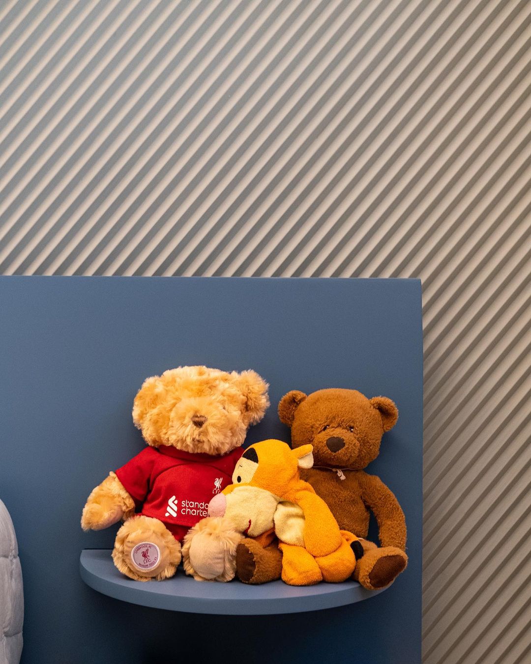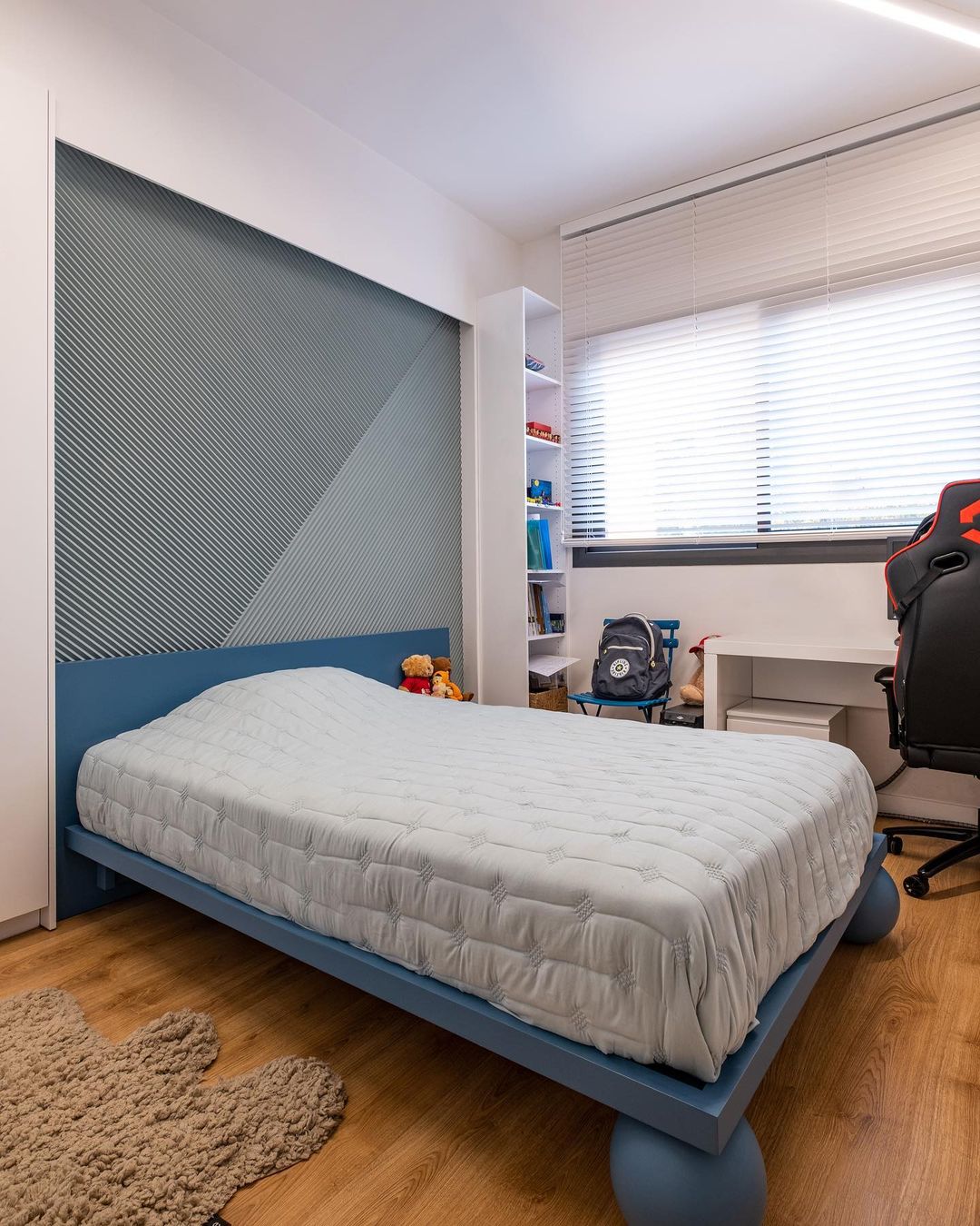 The first bedroom, dedicated to the kids, features exclusive furniture with blue and petrol green tones. The textured finish on the walls harmonizes with the bespoke unit from the SOFT collection, serving as a luxury bed with an integrated nightstand in a statement petrol blue. The master bedroom boasts bright wooden parquet flooring and an EPIFANIA bed unit with an elongated headboard and integrated nightstands, adding a touch of modern luxury to the space.