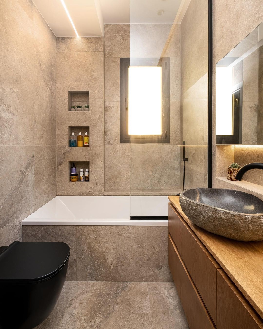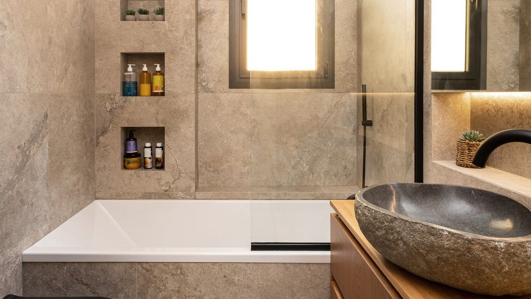Moving across the corridor, the communal and private bathrooms exhibit a ton sur ton palette in earthy hues of total grey and beige, contributing to a cohesive and luxurious result.