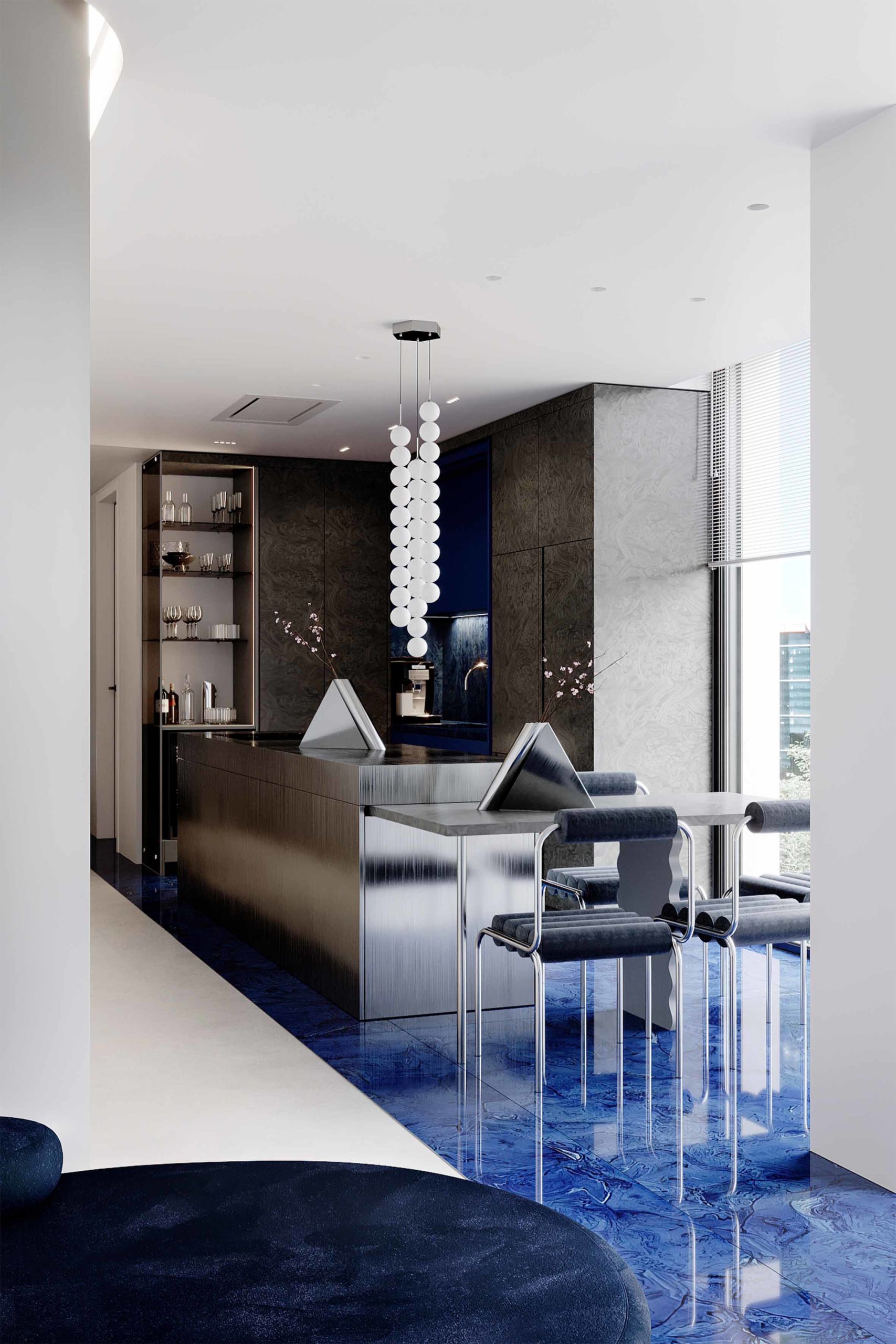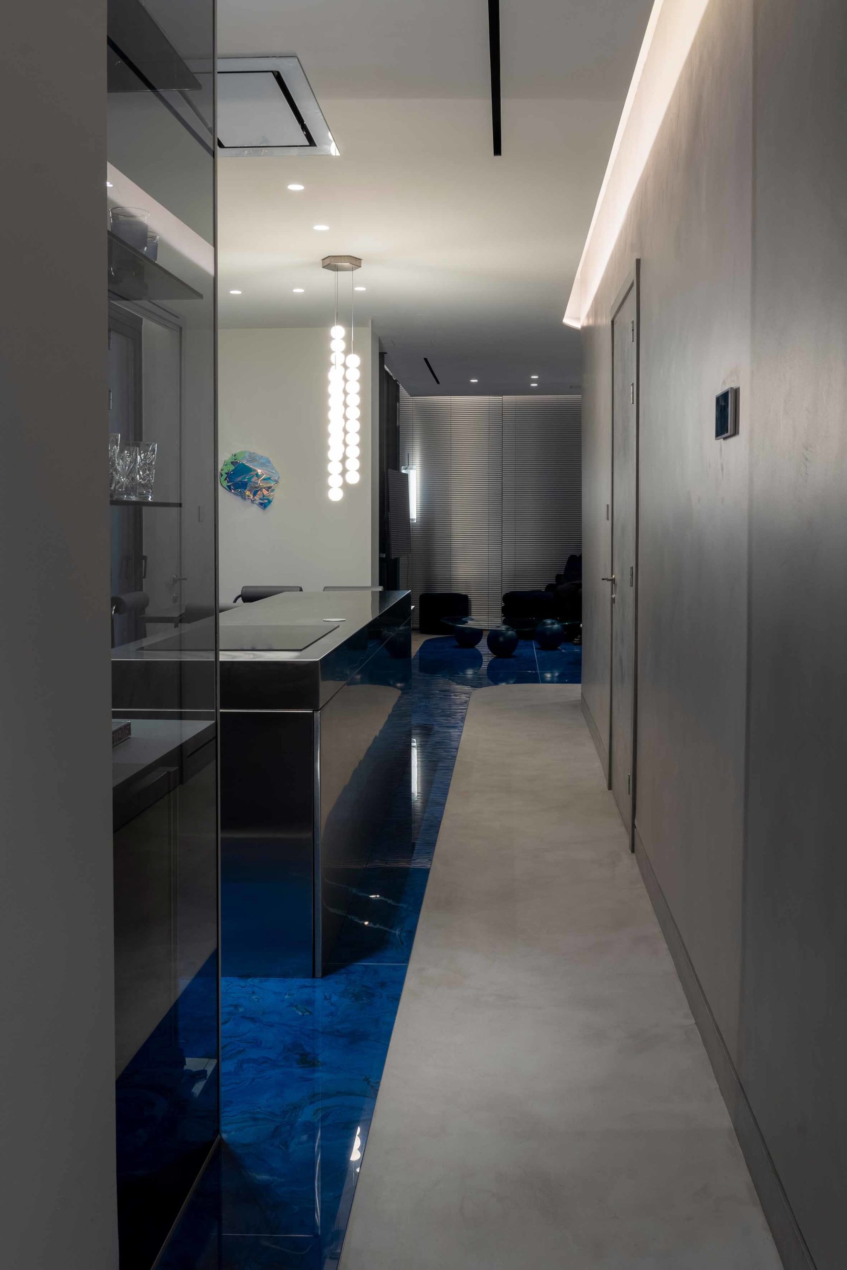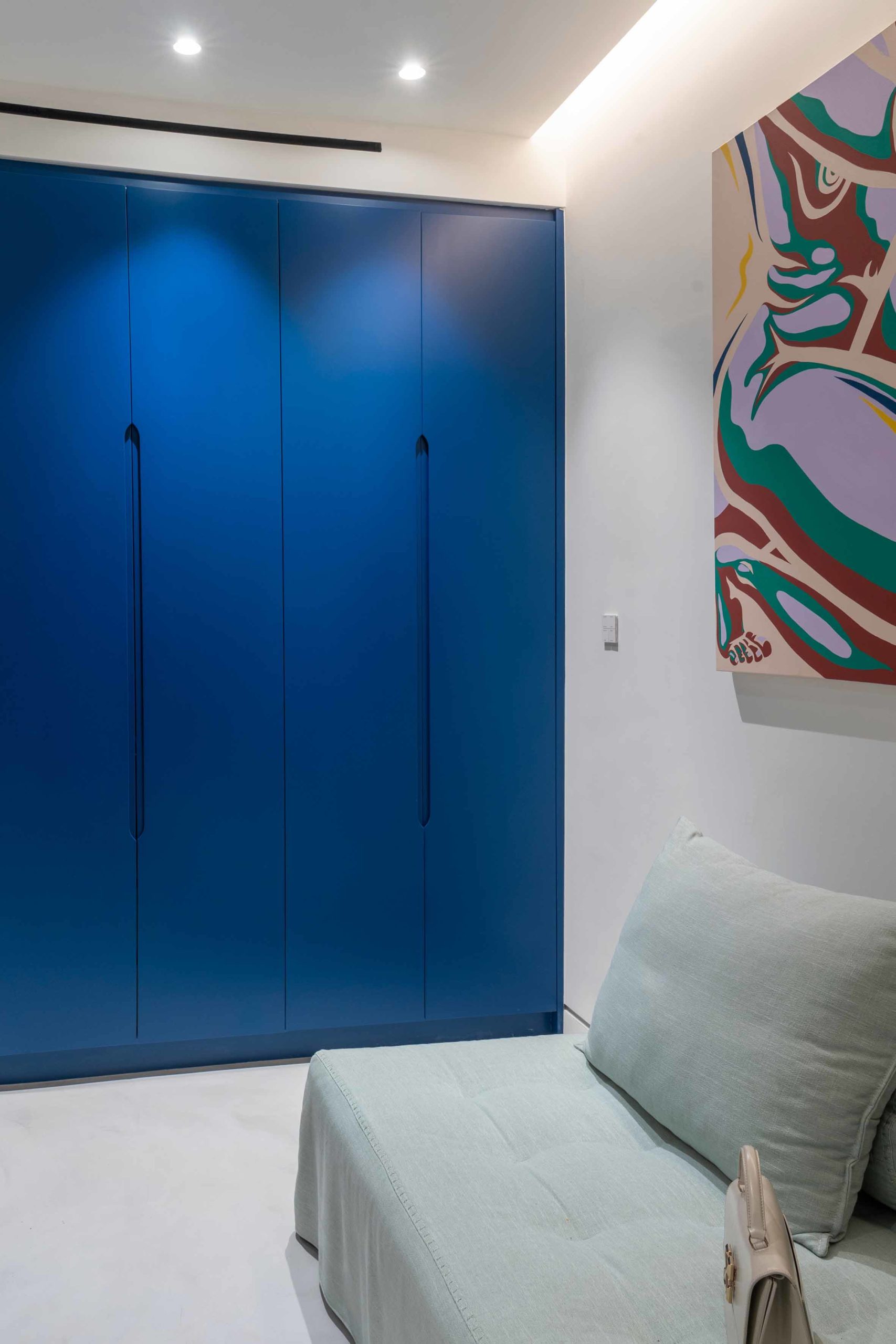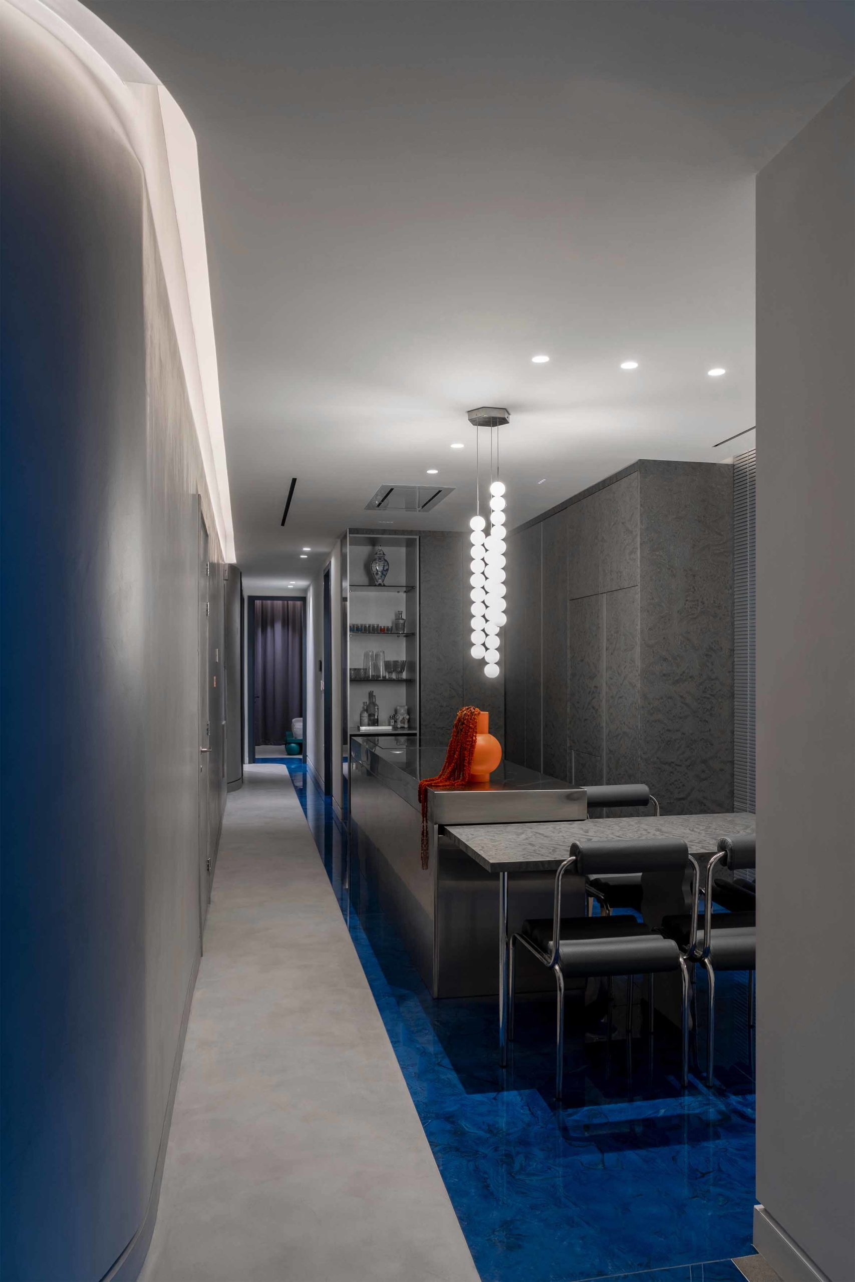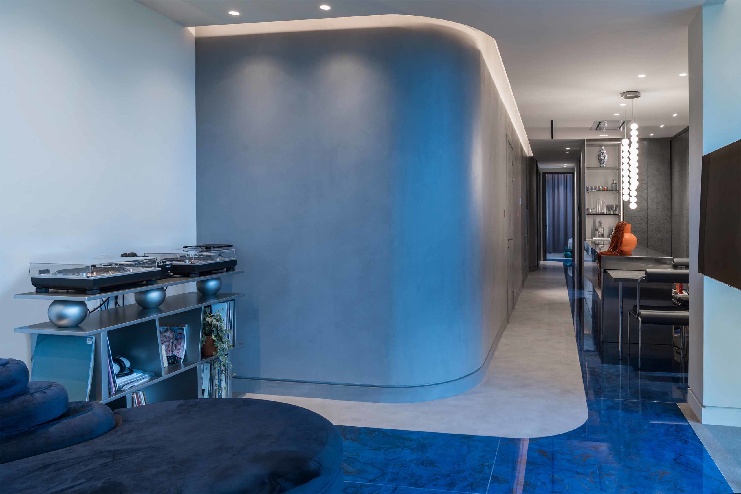 The apartment is further enhanced by an ancillary space featuring a concrete floor and cobalt blue wall-mounted storage units with integrated lighting. This versatile space, dedicated to flexible uses, accommodates high-end and contemporary furniture effortlessly. A custom standing mirror in a matching blue hue serves as the first free-standing element, symbolizing the creative fluidity of the space’s occupation. The result is a modern home interior design that seamlessly merges luxury, contemporary aesthetics, and functionality.