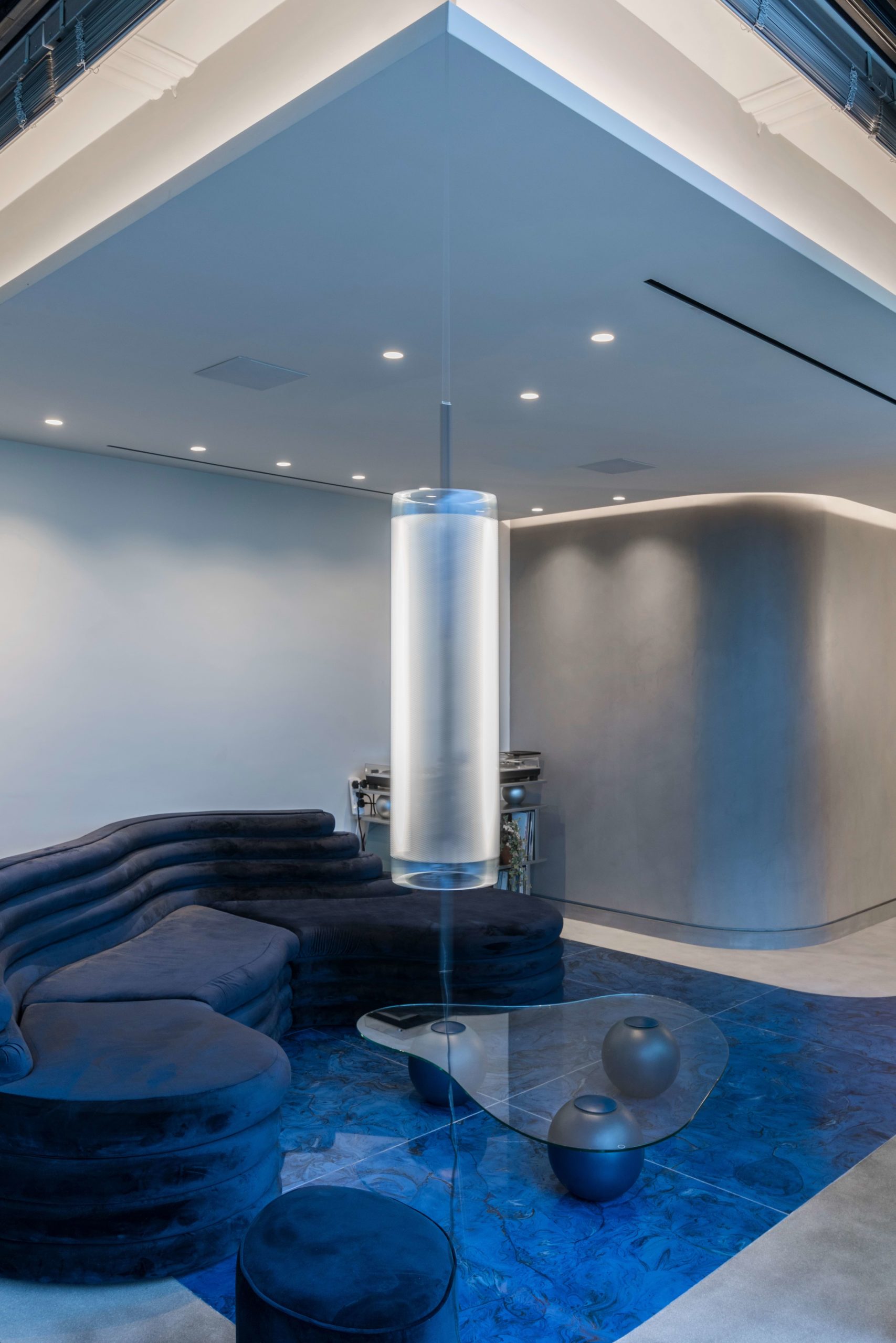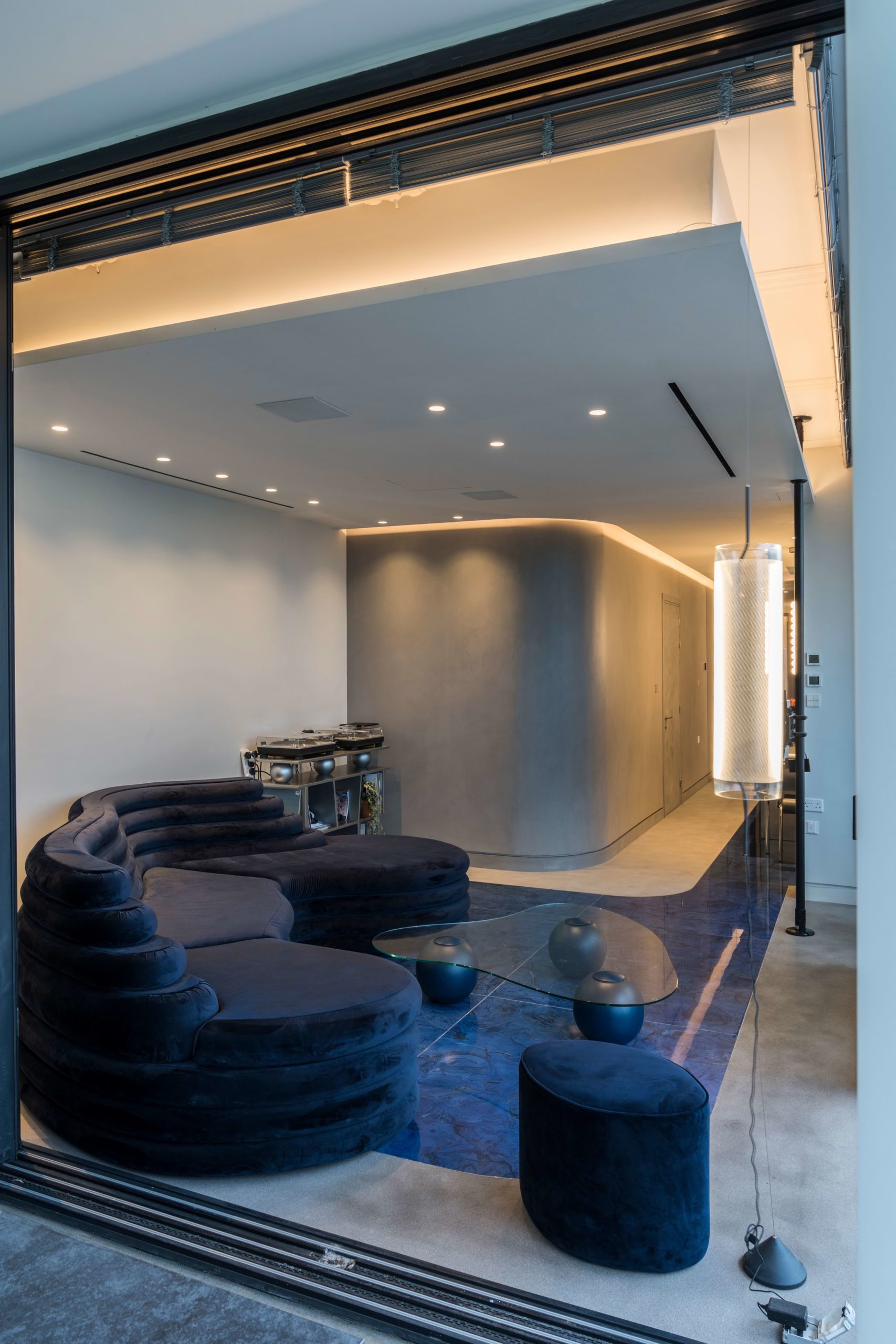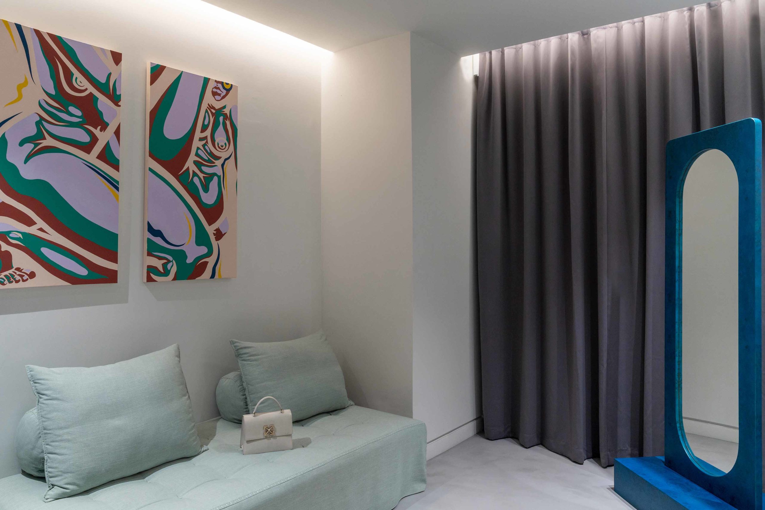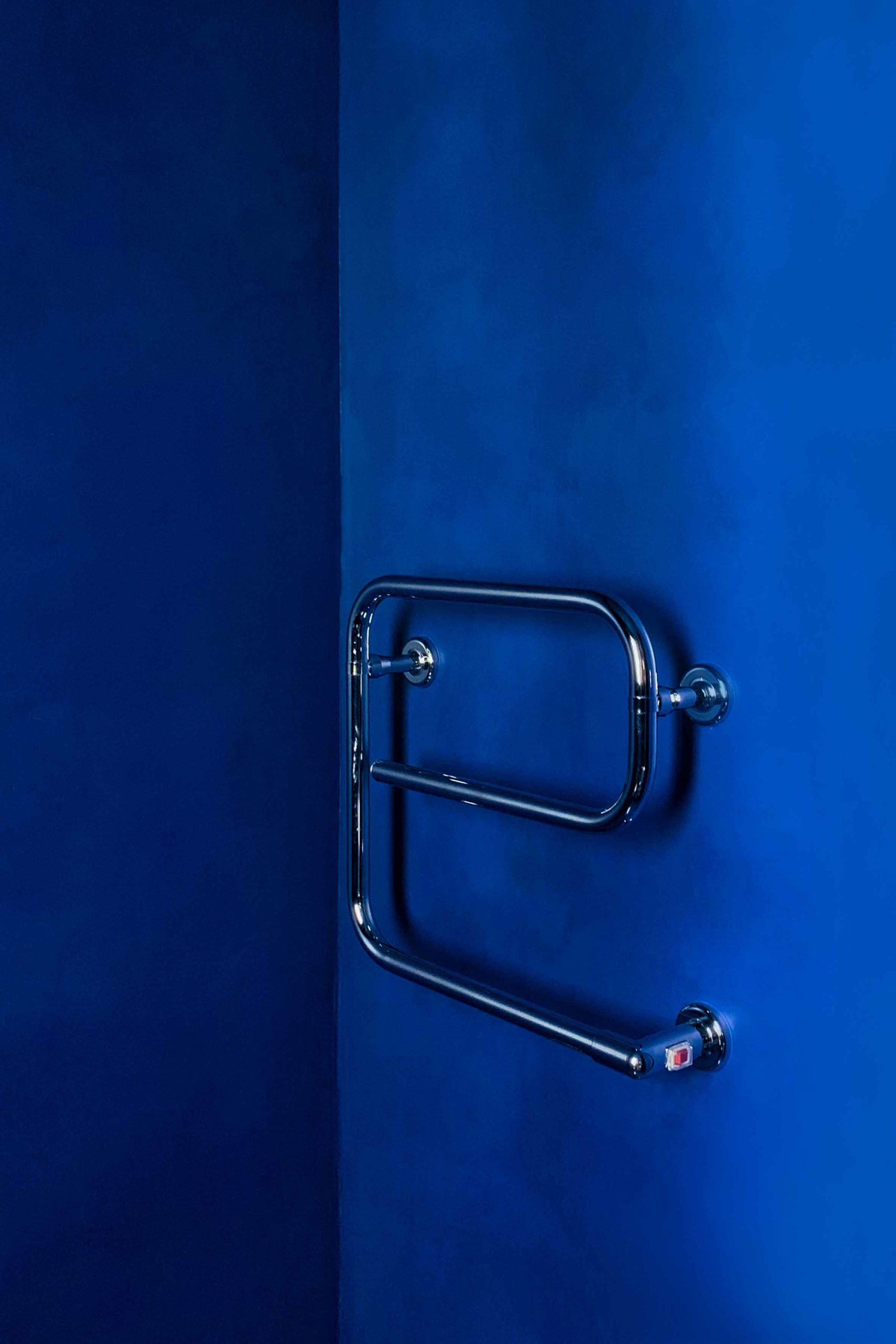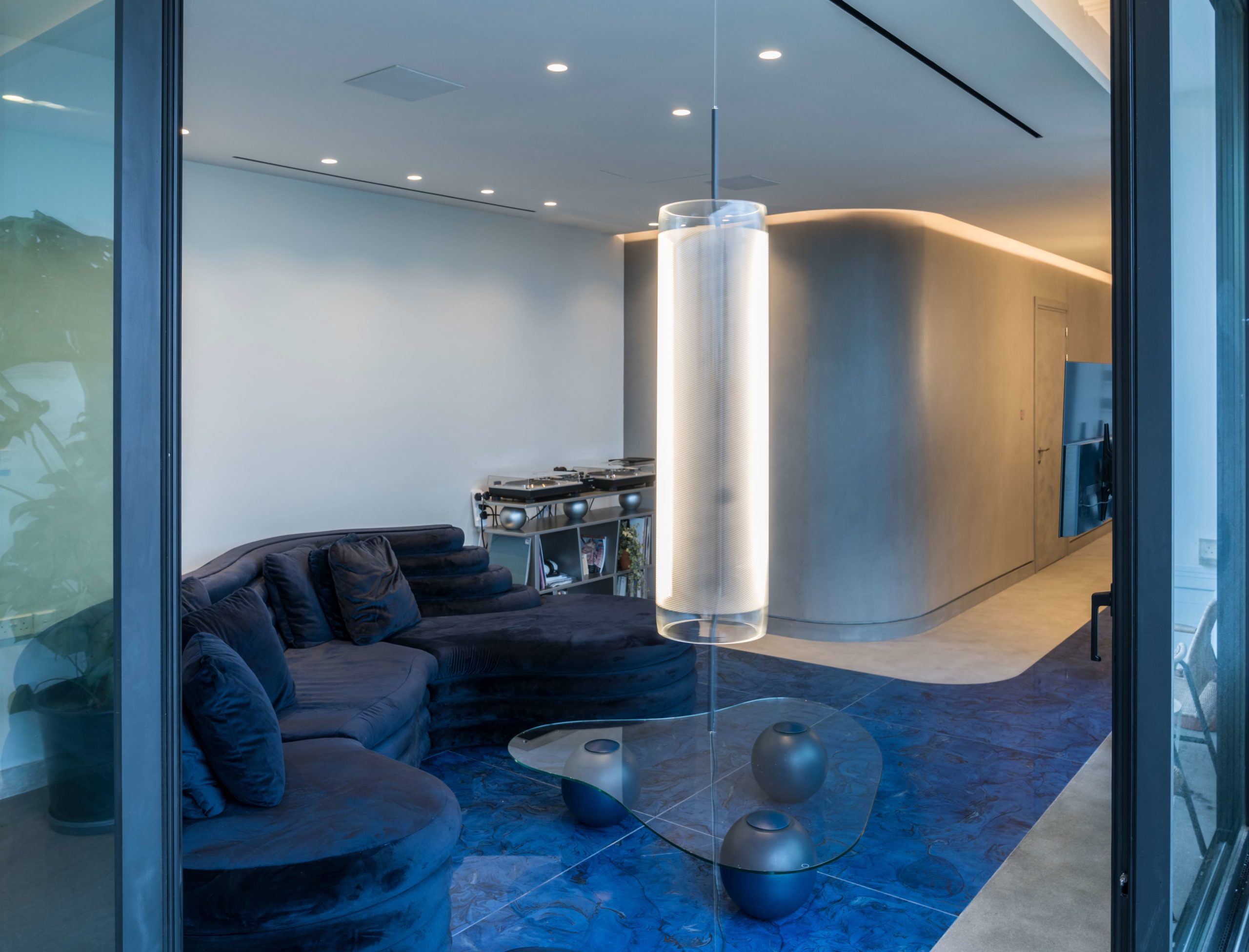 The apartment is further enhanced by an ancillary space featuring a concrete floor and cobalt blue wall-mounted storage units with integrated lighting. This versatile space, dedicated to flexible uses, accommodates high-end and contemporary furniture effortlessly. A custom standing mirror in a matching blue hue serves as the first free-standing element, symbolizing the creative fluidity of the space’s occupation. The result is a modern home interior design that seamlessly merges luxury, contemporary aesthetics, and functionality.