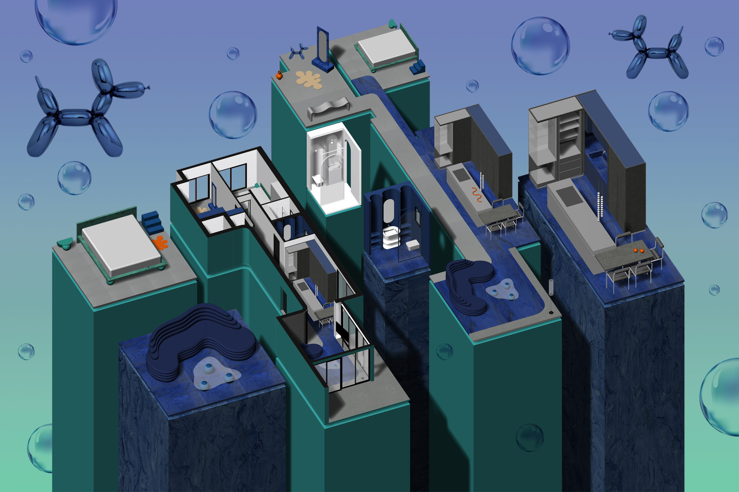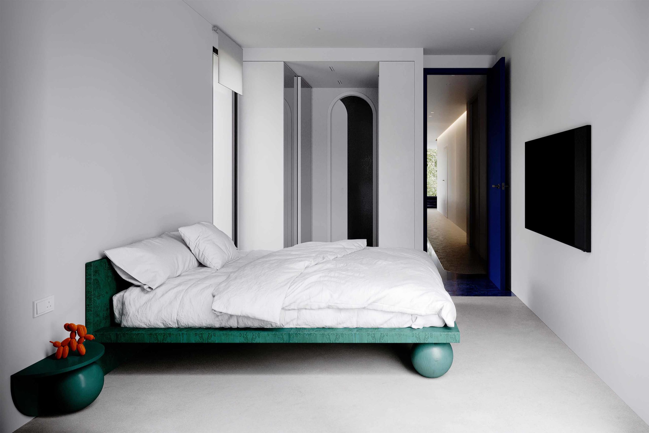 Diametrically opposed is the master bedroom, featuring an epicentered sculptural master bed finished in petrol green, supported by solid wooden spherical elements. Custom stepped nightstands, doubling as temporary ladders for wardrobe access, surround the bed, creating a cohesive and luxurious bedroom ensemble. The ensuite opens up to a walk-in closet with integrated mirrors and ambient lighting, highlighted by arched feature walls and custom mirrors, adding to the overall sense of modern luxury.