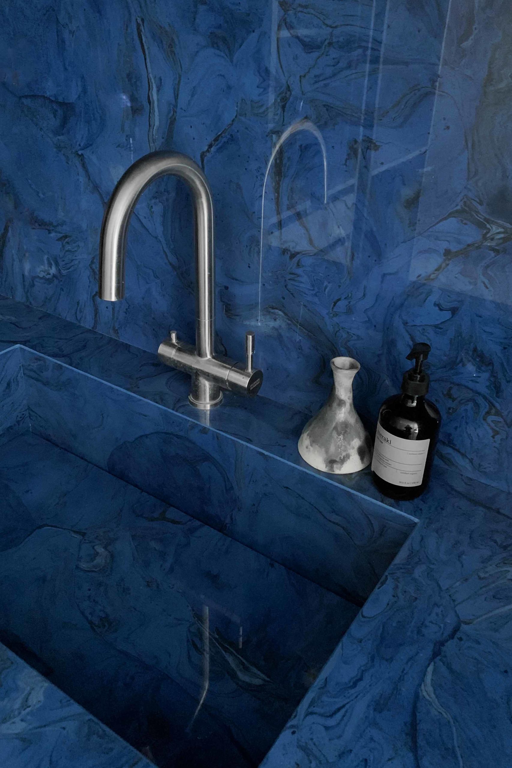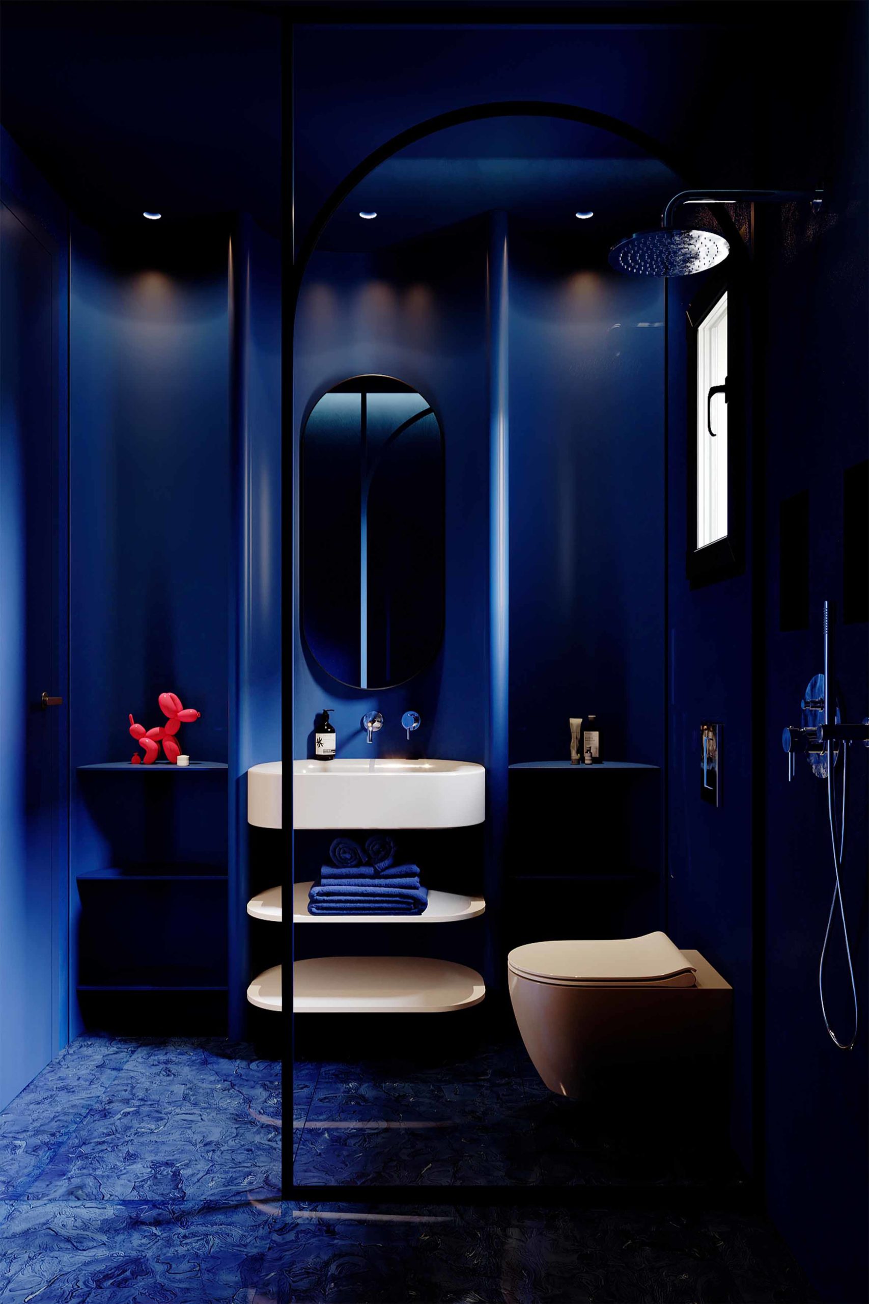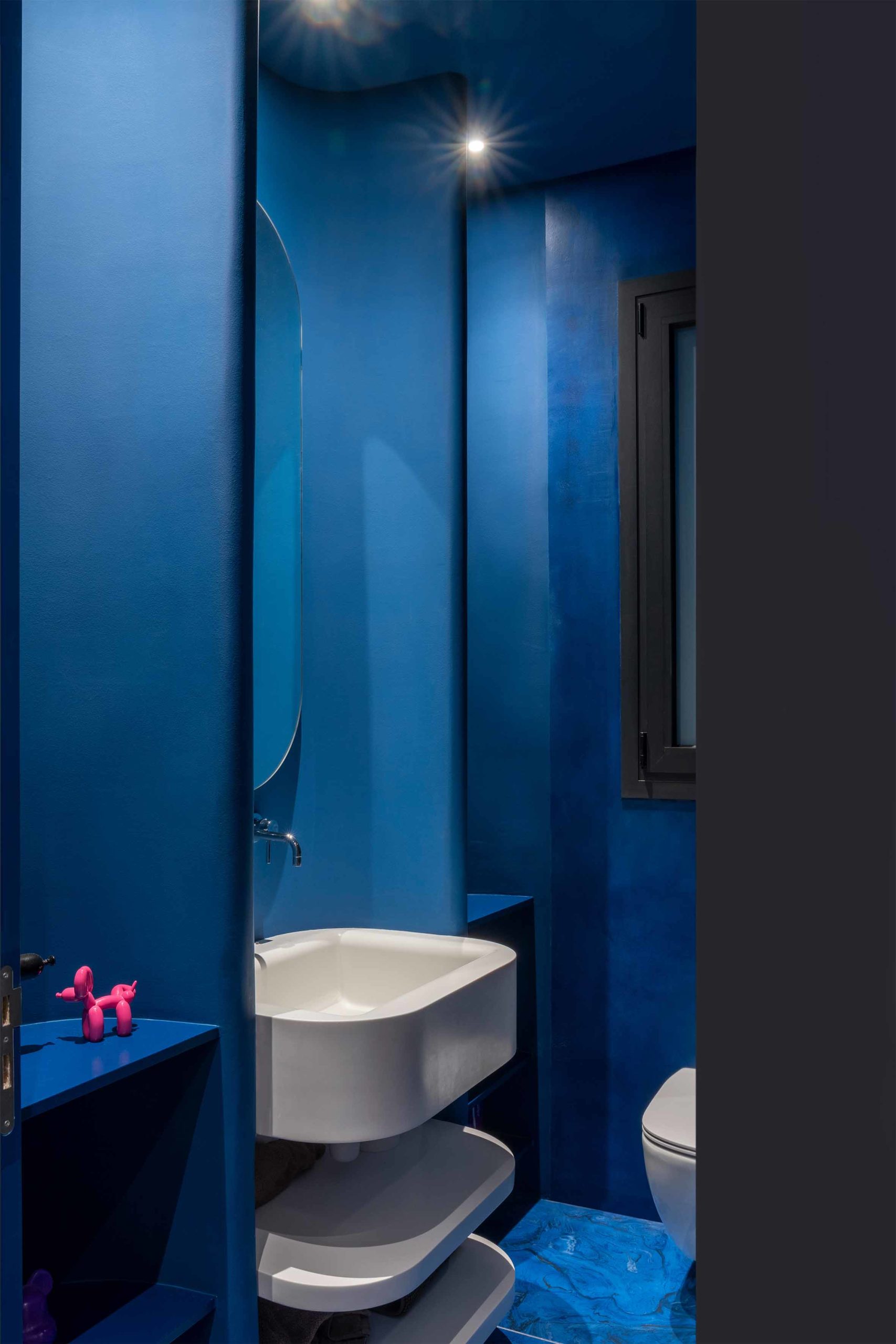 The public spaces include a total blue guest bathroom featuring an upscaled triple-curved feature wall embracing an integrated custom Corian sink and shelving units, blending luxury and contemporary design seamlessly.