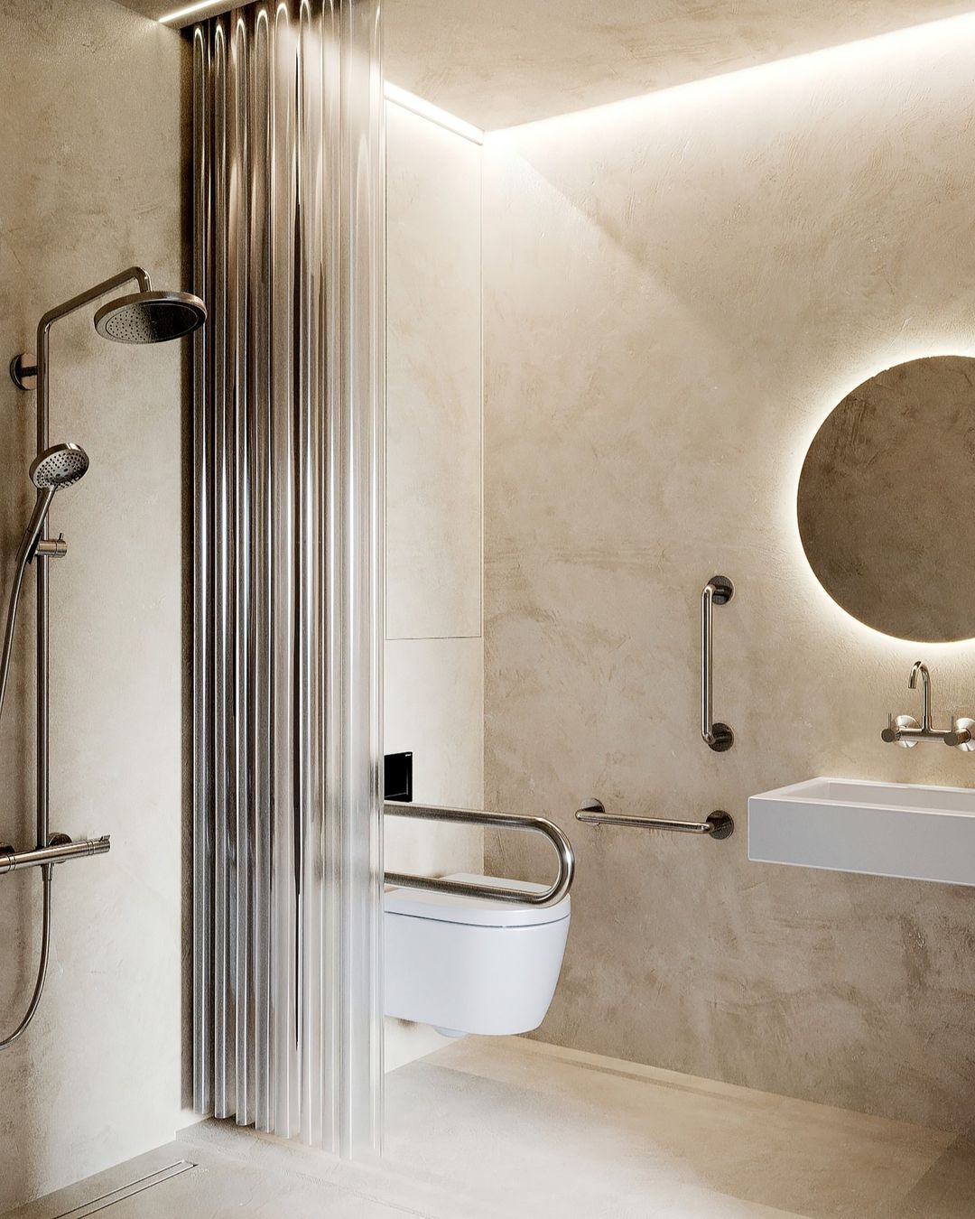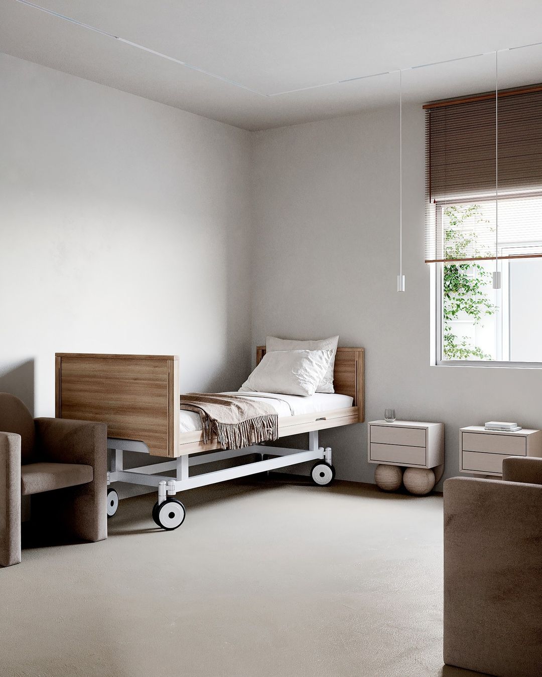 In the more private zones, attention to bathroom interior design is evident, with a dedicated physiotherapy and grooming area supporting the daily schedule of the nursing home. Exclusive furniture, including luxury beds and high-end furniture, has been selected to elevate the interiors and ensure the residents’ comfort.